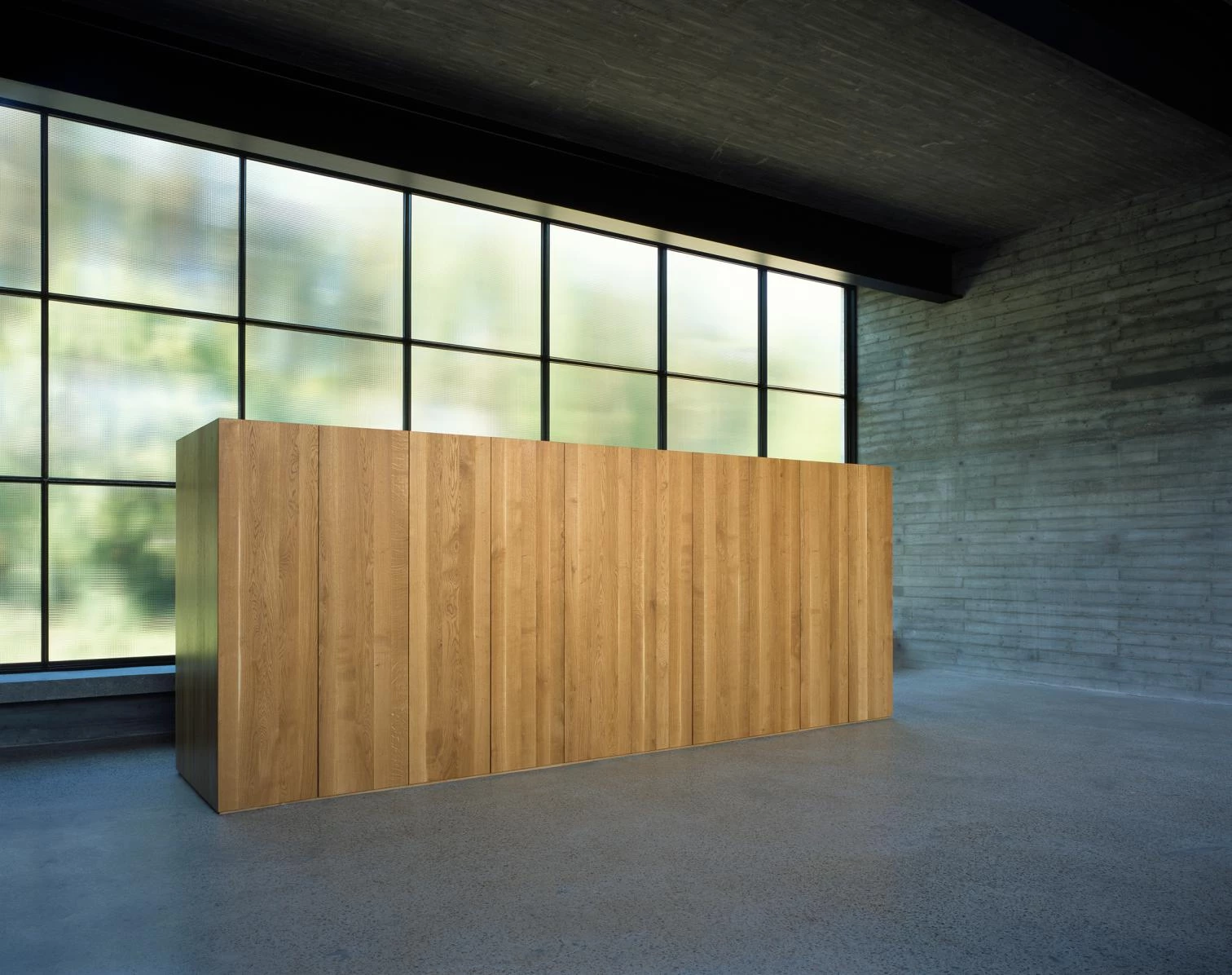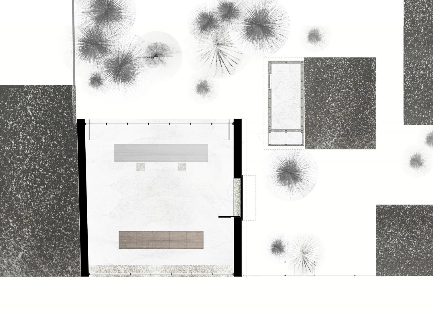 Dos volúmenes conforman el taller, levantado junto a la casa de la artista en la capital polaca. El más pequeño, de madera, está dedicado al almacenamiento. El de mayor tamaño, que combina hormigón y vidrio, alcanza 5,6 metros de altura en una huella de 12 x 12 m. Su diseño parte del concepto de generar un gran espacio flexible para la experimentación sin distracciones. Sus dos frentes vidriados permiten el paso de la luz natural: el sur, translúcido, difumina la actividad exterior de la calle mientras aporta intimidad; y el norte, trasparente, muestra con claridad el jardín. El mobiliario de madera conforma un núcleo donde se aloja un pequeño aseo y una cocina. Recorriendo paralelamente la fachada norte, se encuentra una mesa de trabajo de madera de roble de 6 metros de largo. En el sur, un banco corrido de terrazo de 12 metros de largo nivela el taller hasta la calle. Todos los elementos del edificio están hechos a mano, para la realización de muchos de ellos se ha contado con la participación de los artesanos que habitualmente trabajan en las obras de Sosnowska.