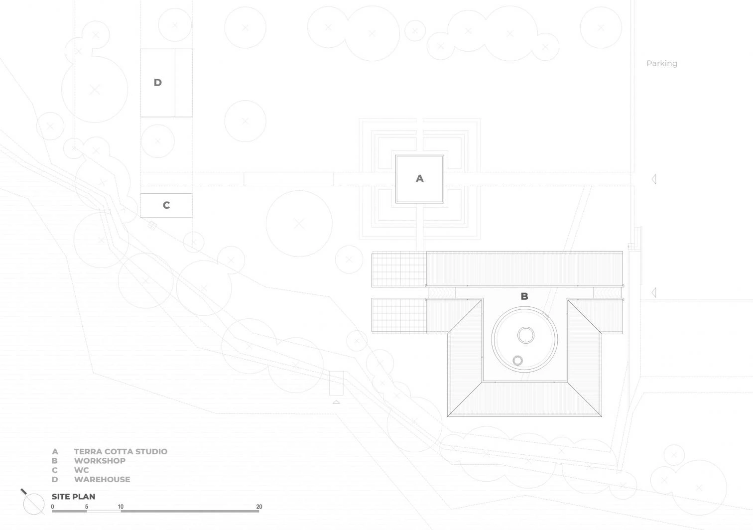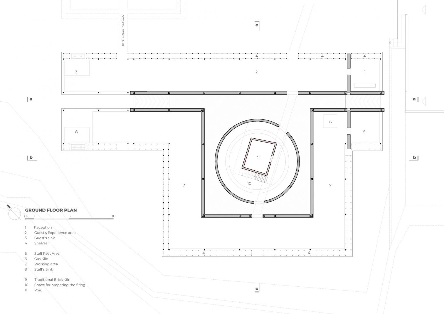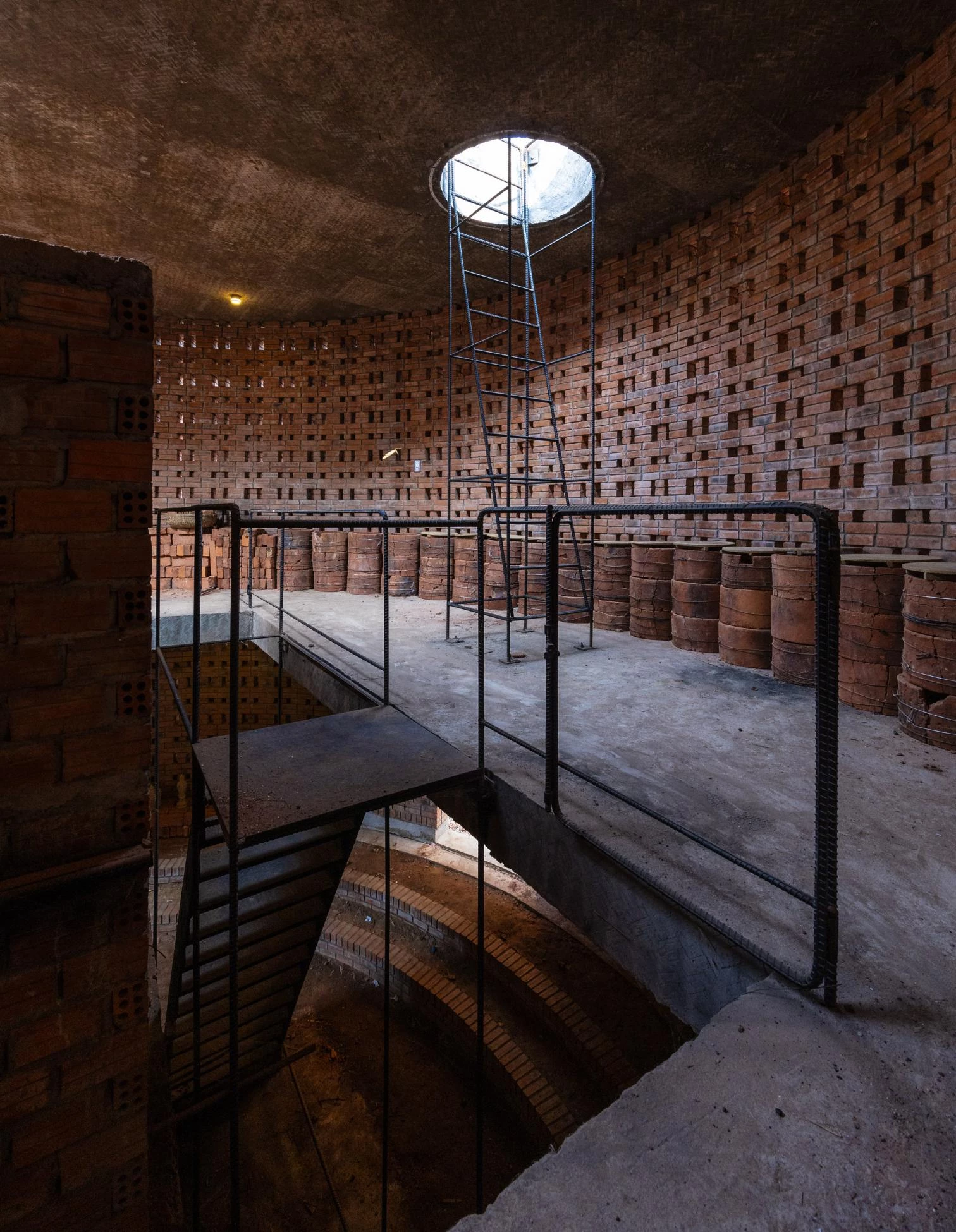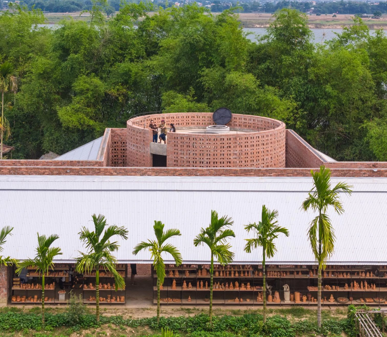 Junto al Studio Terra Cotta de Dien Phuong, también construido por el estudio vietnamita Tropical Space, se levanta este taller que abraza con sus pliegues un horno de ladrillos cerámicos existente. Dos muros de 5,4 metros de altura dividen los usos principales de la nueva construcción: por un lado, la zona de visitantes, alargada y delimitada por estanterías con piezas cerámicas expuestas; y, por el otro, el área de trabajo de los artesanos, cerca de la orilla del río, cuyo suelo de tierra compactada permite aprovechar la humedad natural. Entre estas dos zonas hay un largo pasillo y el volumen cilíndrico que alberga el antiguo horno. En su interior, el espacio arquitectónico permite un recorrido por el proceso de elaboración de las piezas, coronado por una claraboya. Los restos de ladrillos y piezas fallidas que se rompen tras un proceso de combustión se reutilizan como material de acabado para cubrir la el patio. Los muros calados de ladrillo del conjunto, que incorporan ventanas bajas, crean conexiones entre interior y exterior, y a su vez controlan los flujos de aire.
