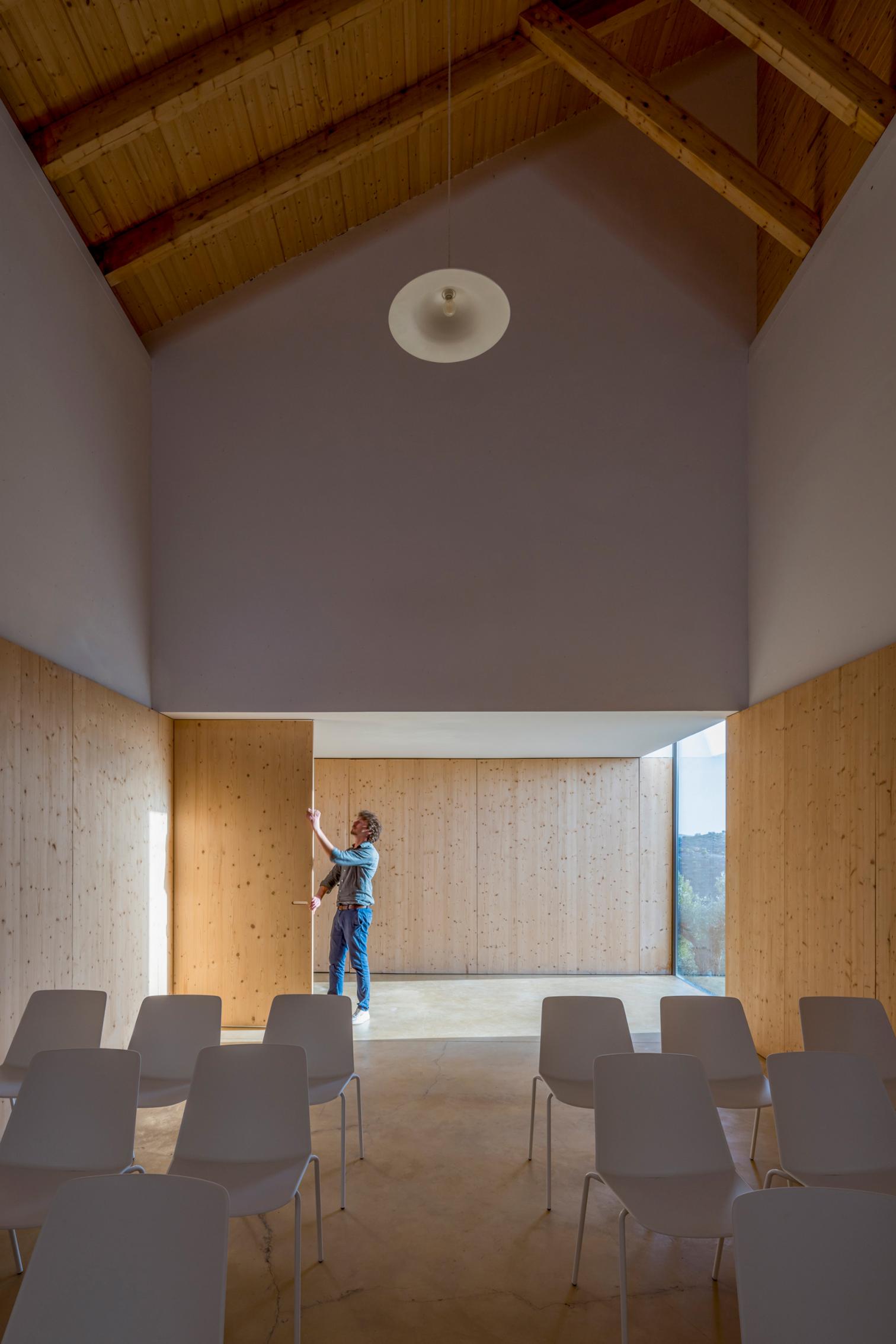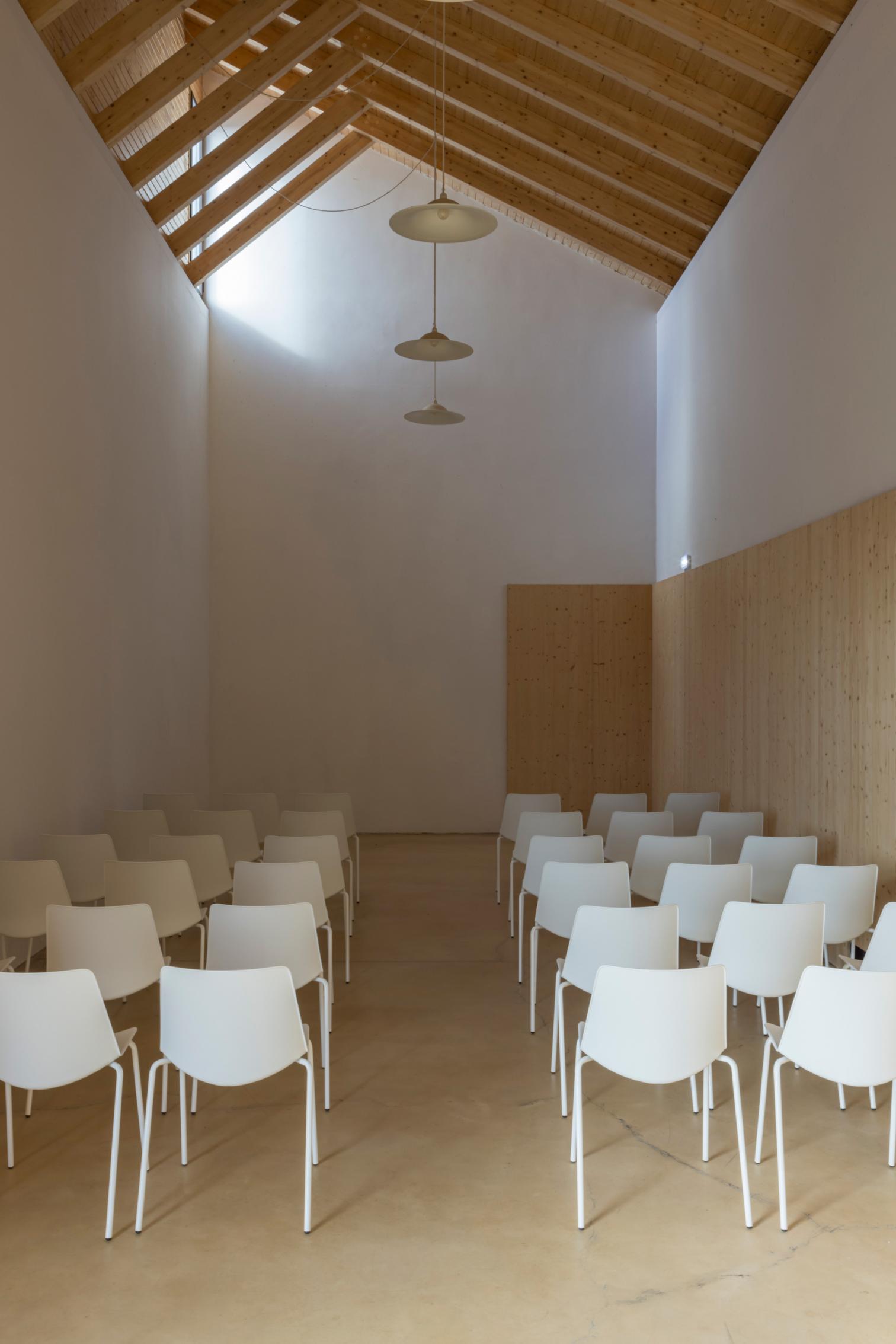 En el interior, los espacios se moldean según la topografía, generando ambientes propicios para la introspección. La sala de espera funciona como núcleo organizador, separando las áreas públicas de los servicios. Además, el sistema de puertas móviles permite unir o separar las capillas, facilitando ceremonias simultáneas o conjuntas.
