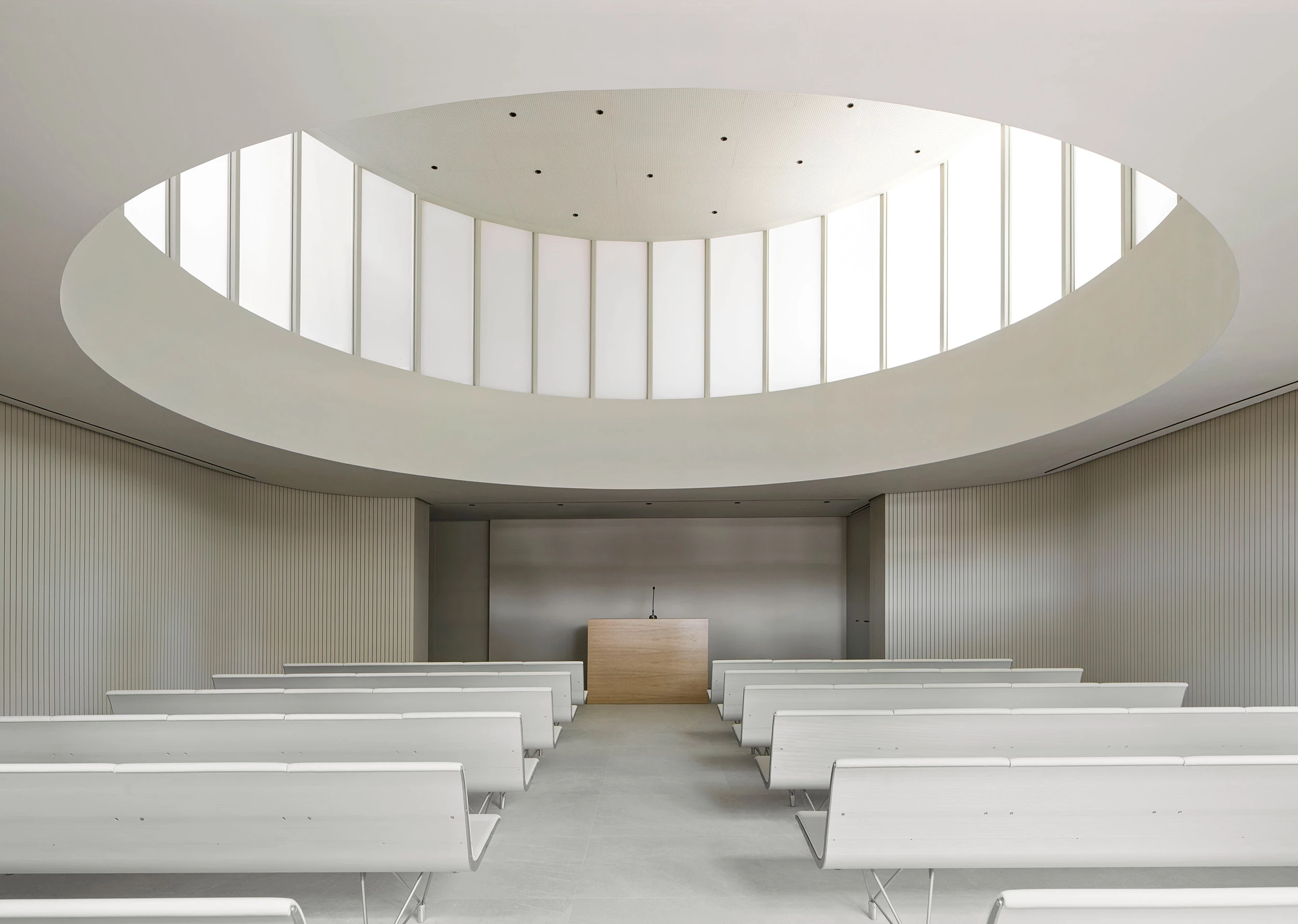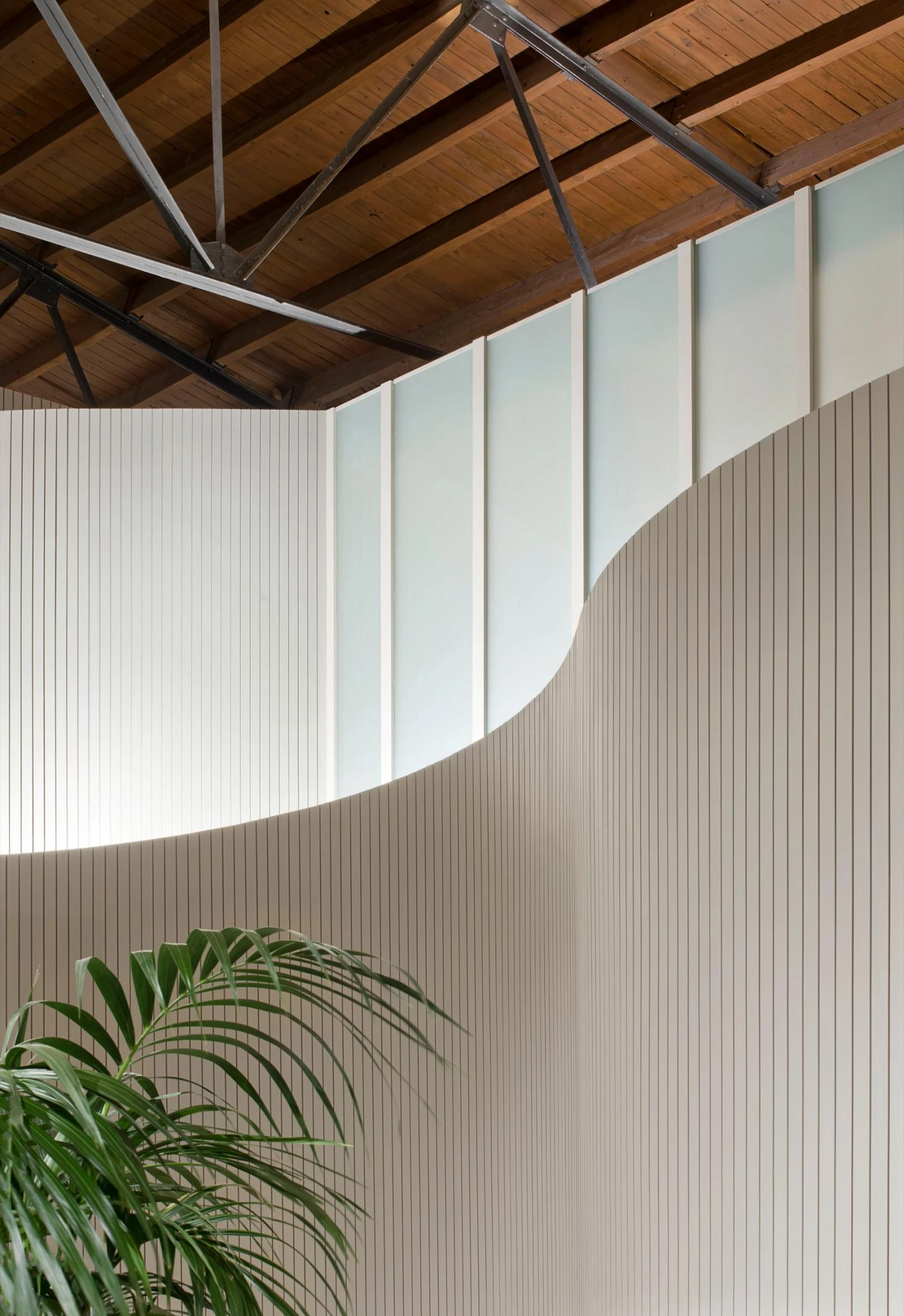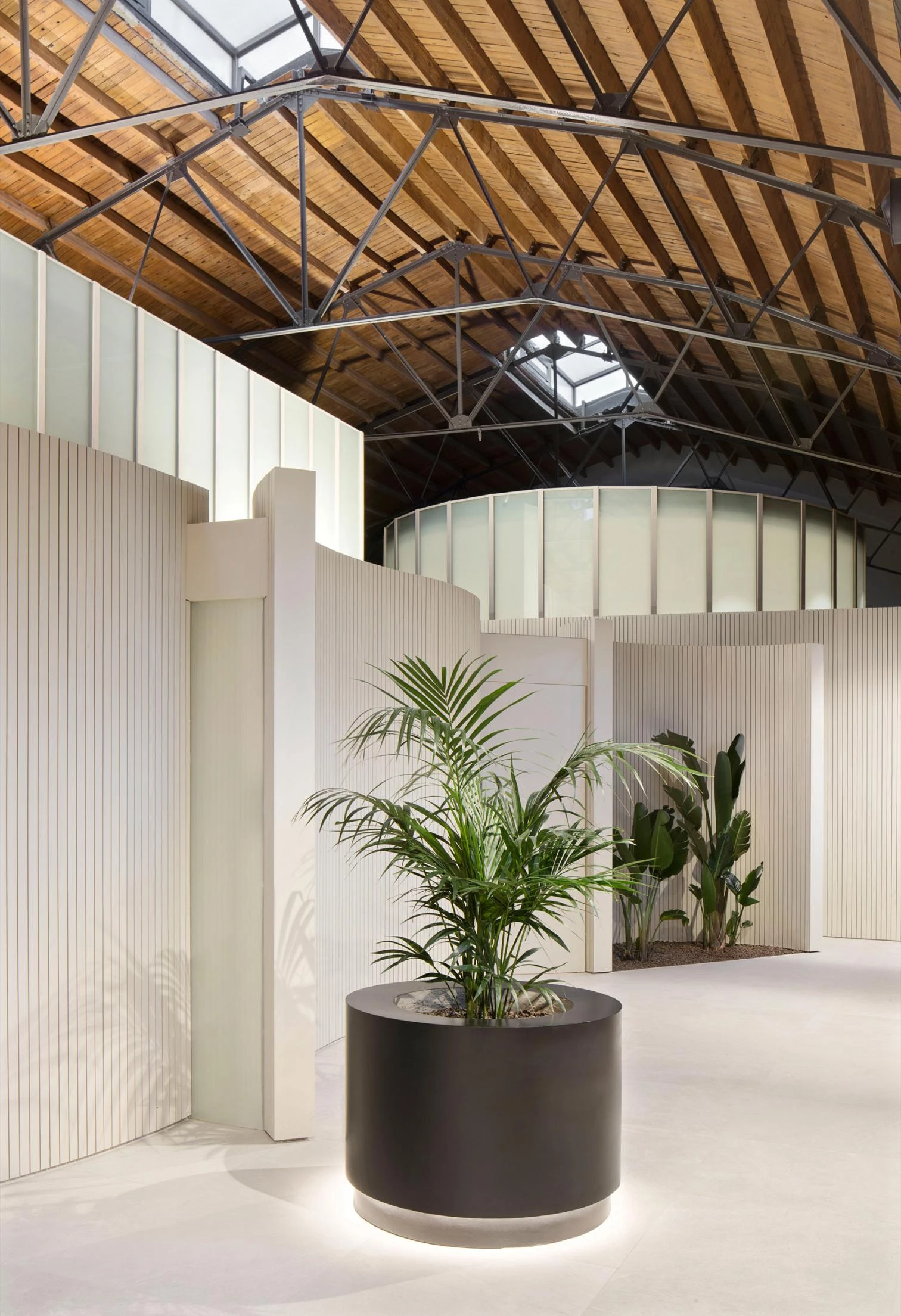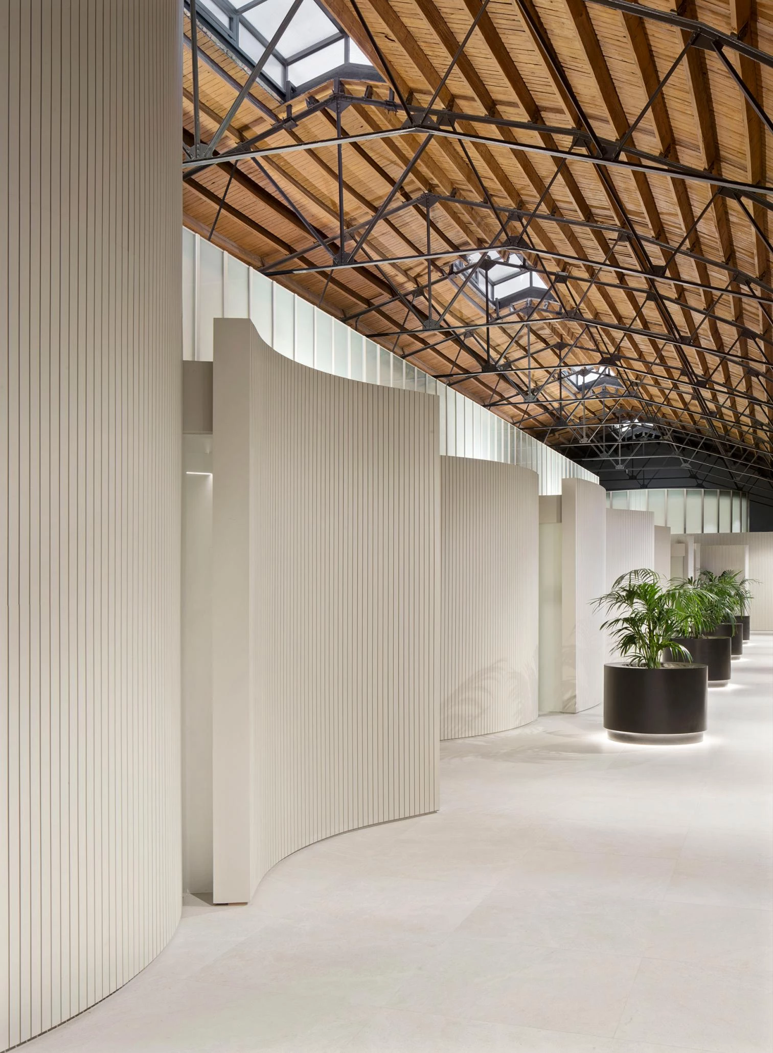 La intervención respeta la arquitectura original que se restaura y se convierte en contenedor de una nueva edificación longitudinal. Las cuatro salas de velatorio están envueltas por muros sinuosos, mientras el volumen de las oficinas y el cimborio de la sala de ceremonias son dos volúmenes geométricos que representan formas más puras. La construcción desmontable de los nuevos elementos se ejecuta toda en madera, tanto la estructura como los acabados principales, donde predominan los tonos claros.