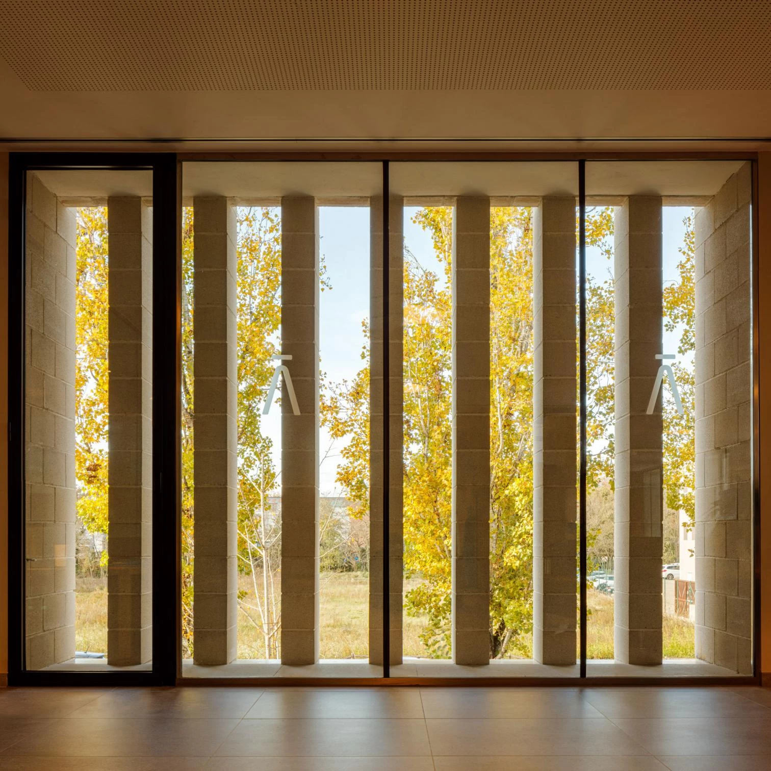 La estrategia principal de la intervención fue construir una nueva fachada que, como piel y filtro, amortiguara la relación entre el interior y el exterior. Para ello, el proyecto analiza y explora la capacidad expresiva del bloque de hormigón, un material que resulta económico, versátil por su módulo y de fácil colocación. Se trabaja con dos tipos de bloques de hormigón blanco: el liso y el ranurado. La utilización de este tipo de aparejo hace posible diseñar una fachada autoportante en diferentes planos, ritmos, texturas y densidades, que varían en función de la orientación, del programa y de las distintas visuales.