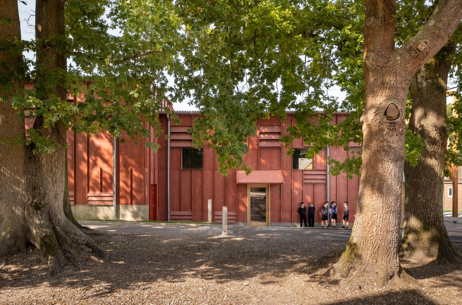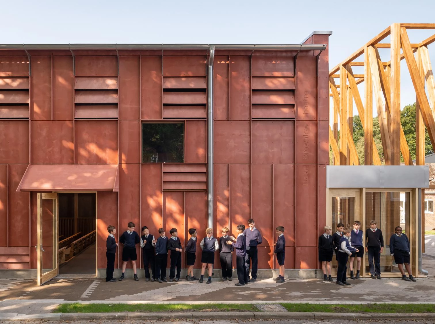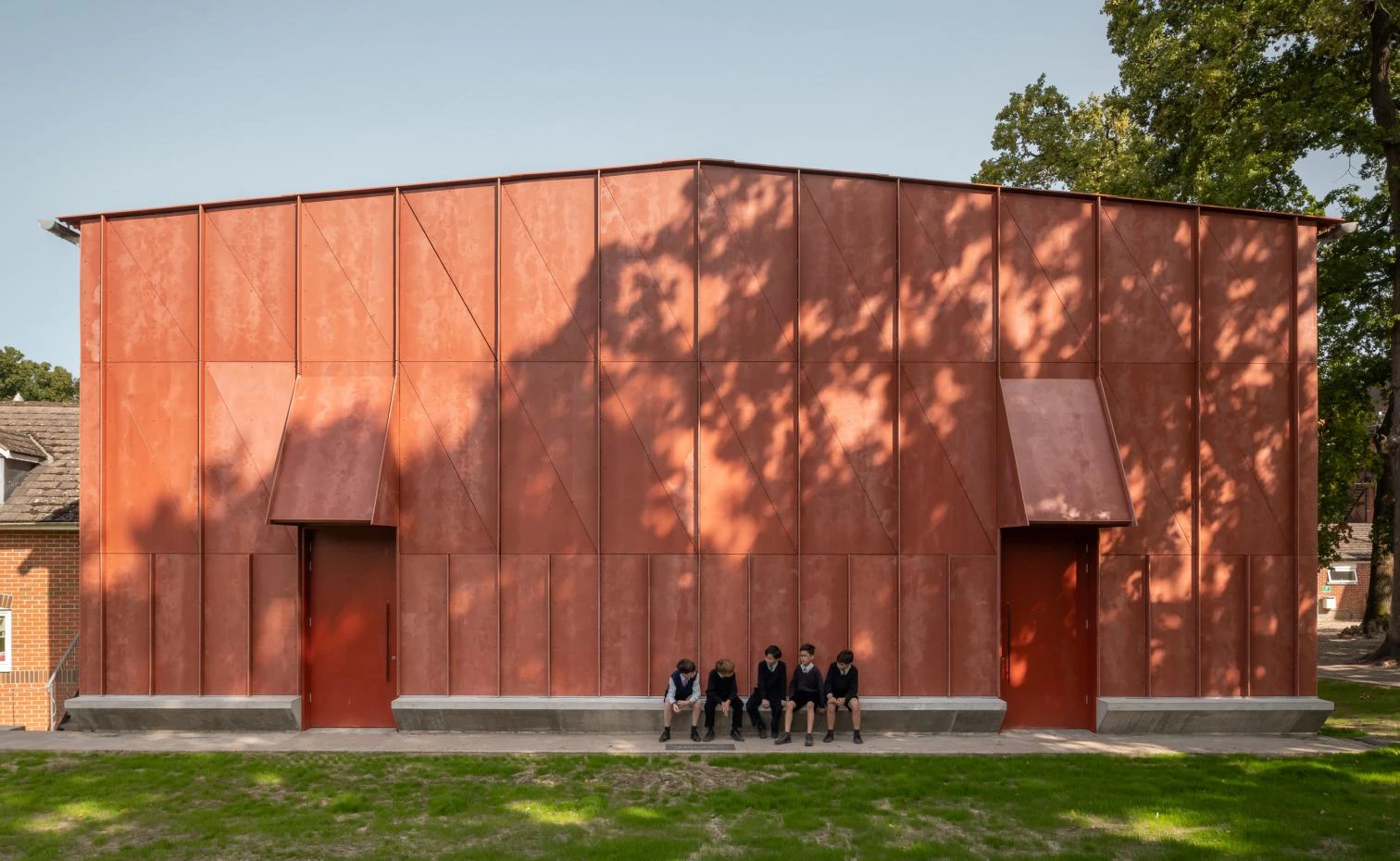 Este teatro para la Escuela Horris Hill de Newbury, ciudad del condado inglés de Berkshire, está construido con madera contralaminada (CLT) y paneles compuestos de Viroc, con una mezcla de fibras de madera y partículas de cemento, cuyos tonos rojizos se asemejan a los de los ladrillos de los edificios circundantes.