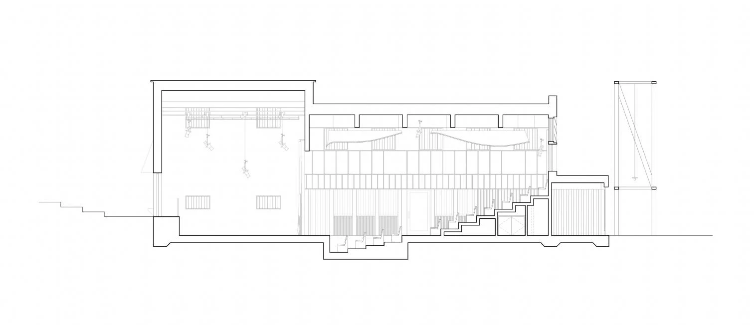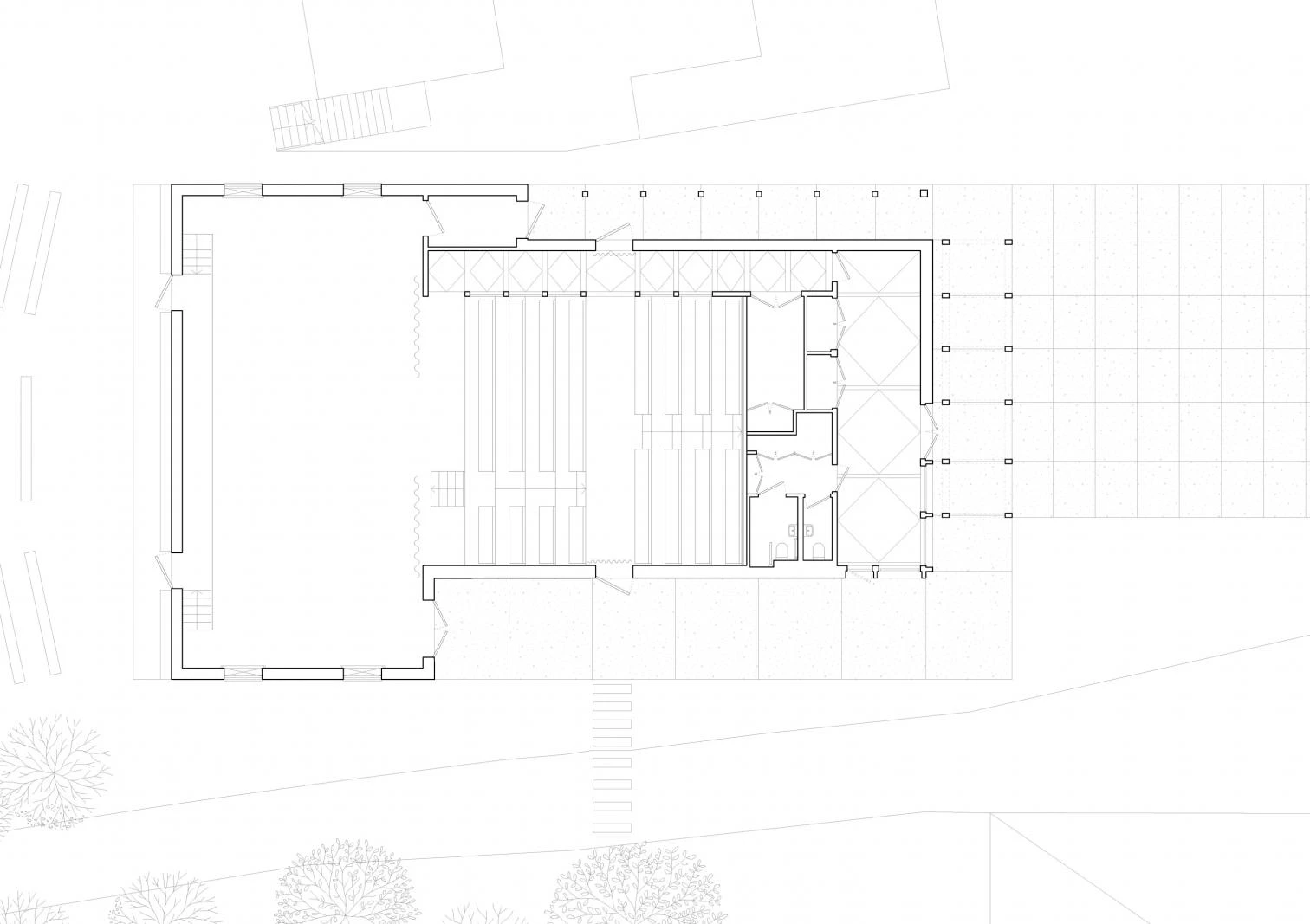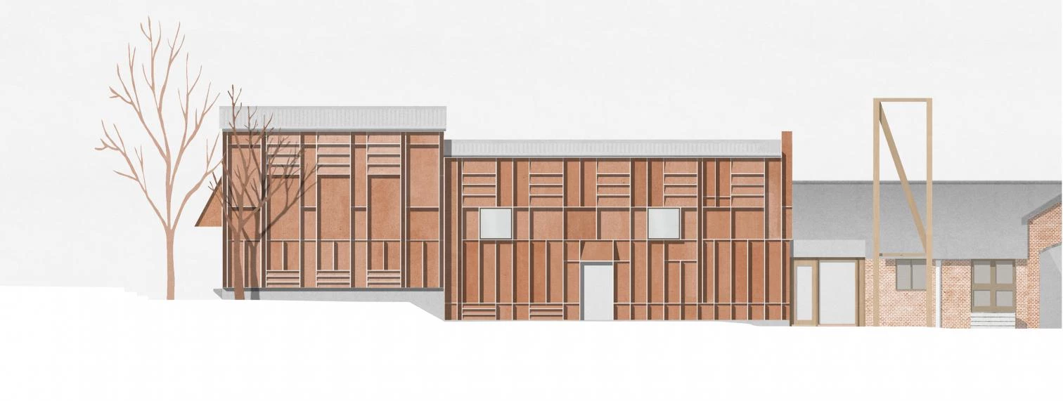 Fruto de un concurso por invitación celebrado en 2016, el proyecto de la firma de Londres fundada por Jonathan Tuckey abarca 528 metros cuadrados e incluye tres elementos principales: un auditorio con capacidad para 160 espectadores; un anfiteatro al aire libre; y un pórtico que enmarca la entrada principal y funciona como una valla publicitaria para anunciar las funciones.