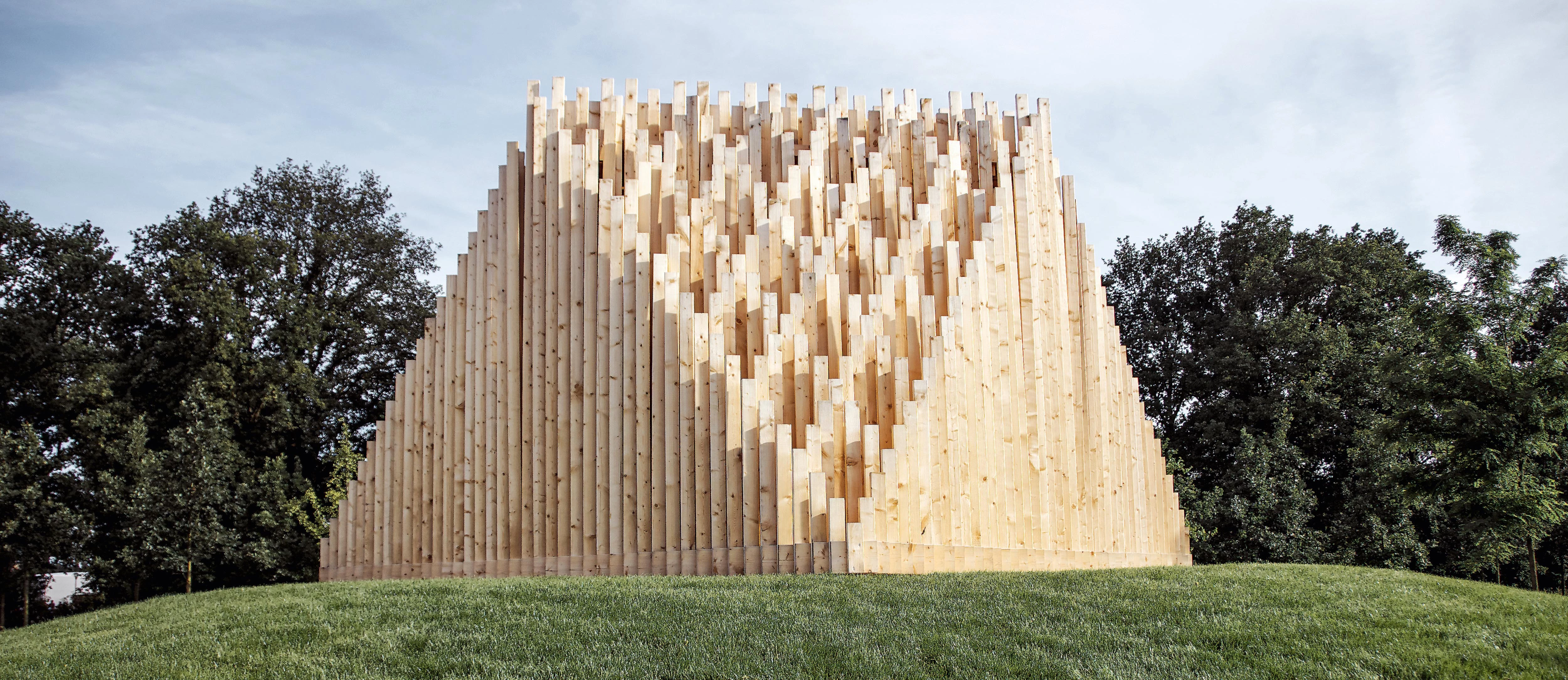 Inspirada en un bosque de bambú, la estructura se construyó con esbeltas piezas de madera de igual sección pero diversas longitudes, colocadas en vertical generando formas piramidales superpuestas que varían en cada uno de los lados.
