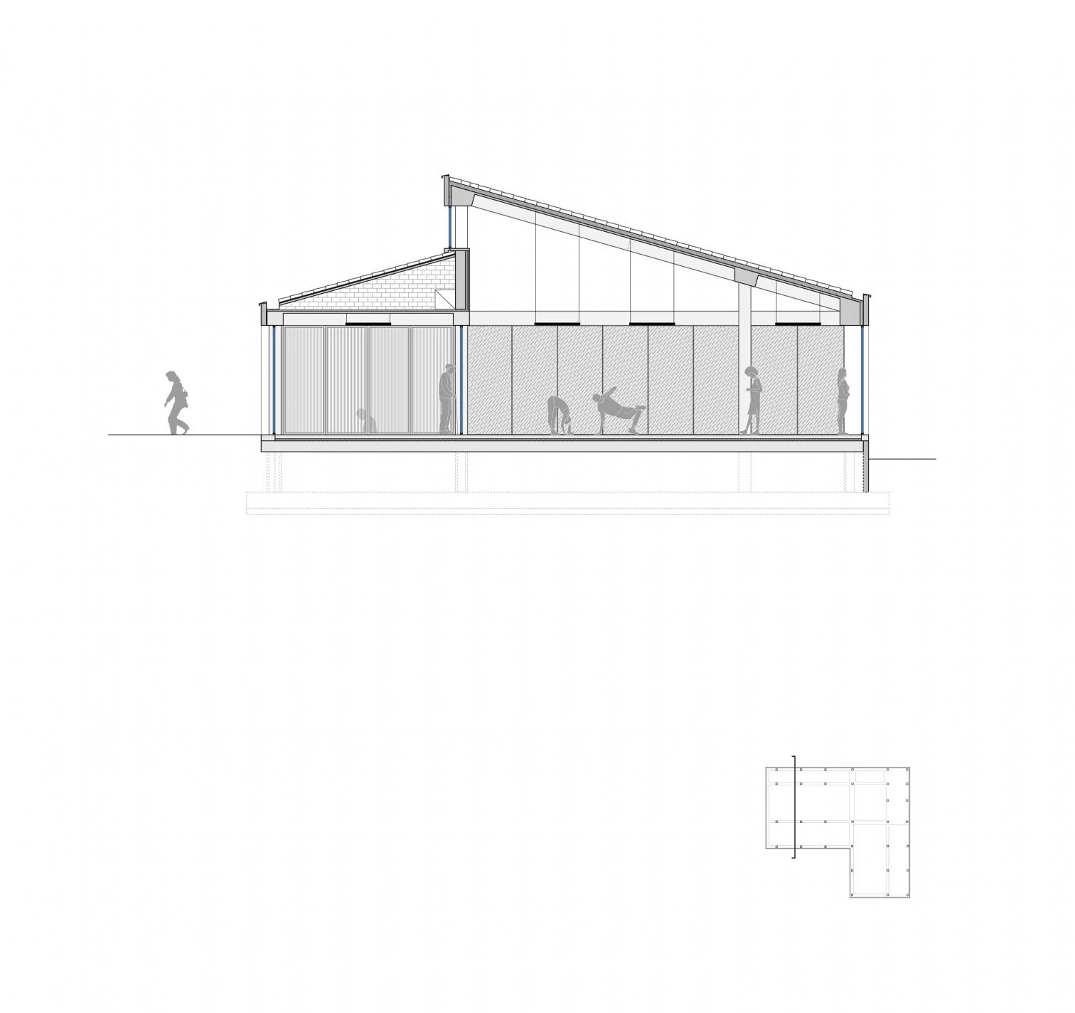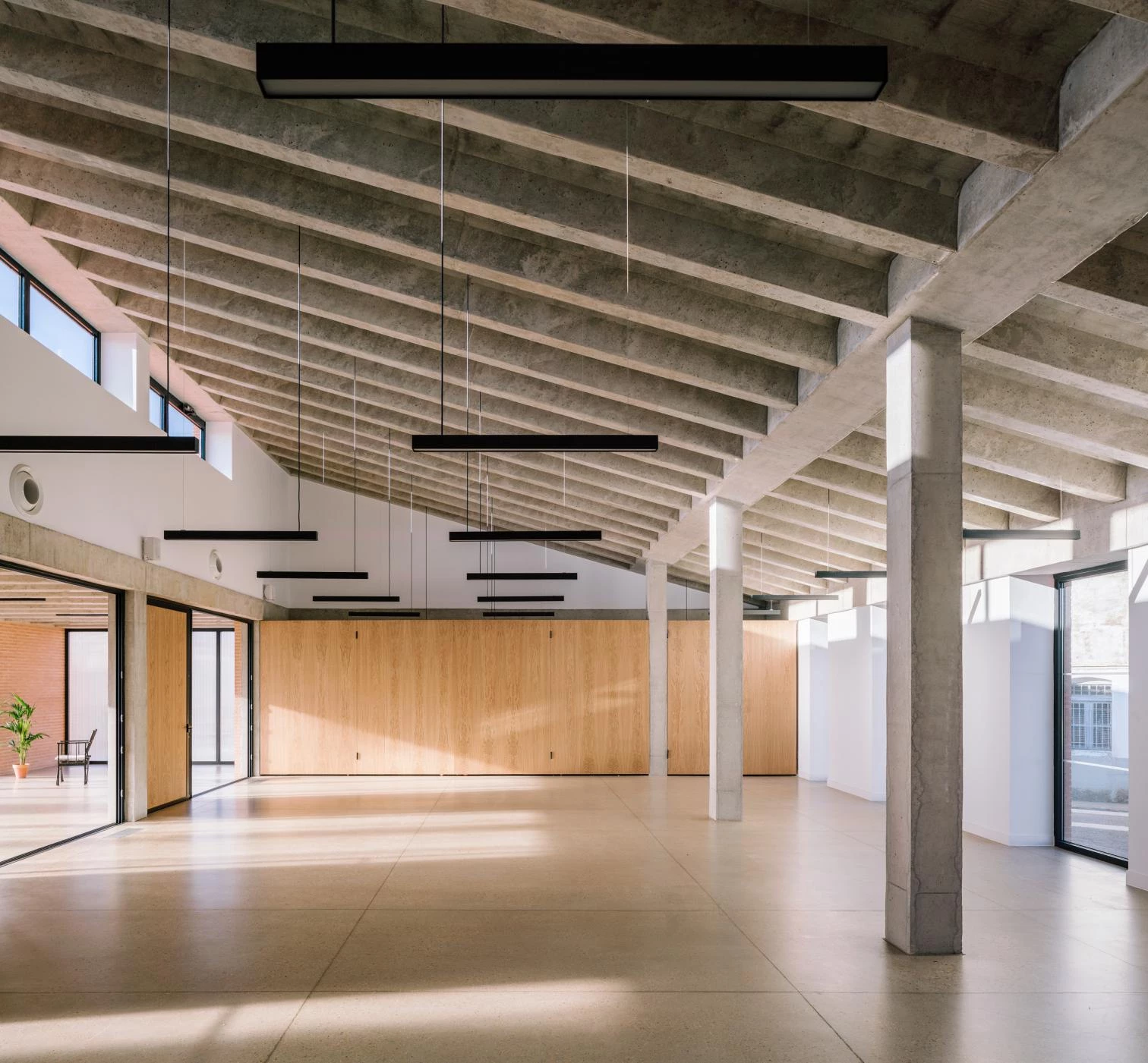 Las dos zonas principales, que contienen un bar y una amplia sala, están configuradas de manera flexible para ser utilizadas de manera independiente o conjunta. Correderas, tabiques móviles y puertas permiten su prolongación hacia unos espacios intersticiales que favorecen el comportamiento térmico y generan un desahogo espacial, extendiendo las actividades hacia la plaza donde se sitúa la construcción.