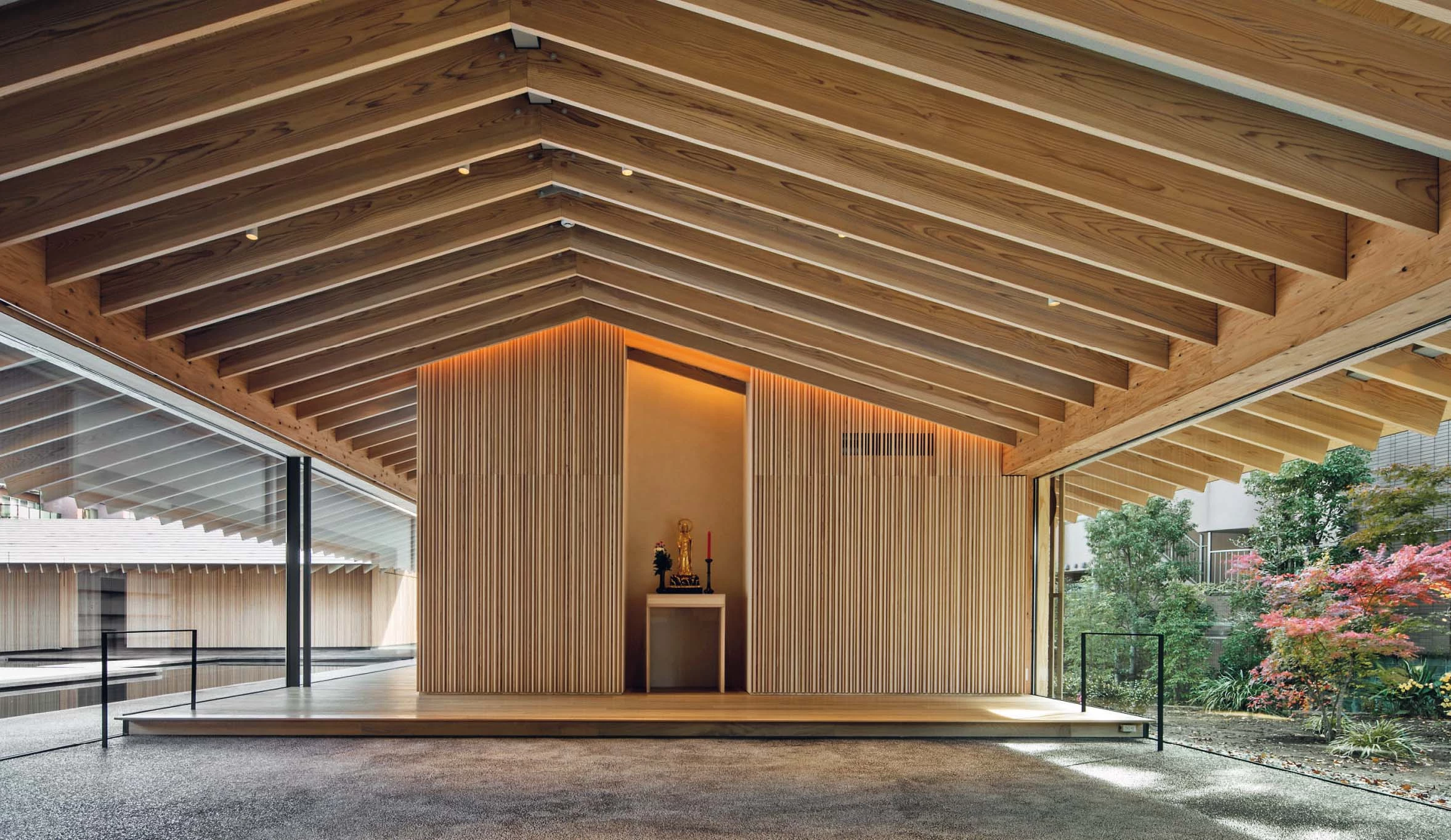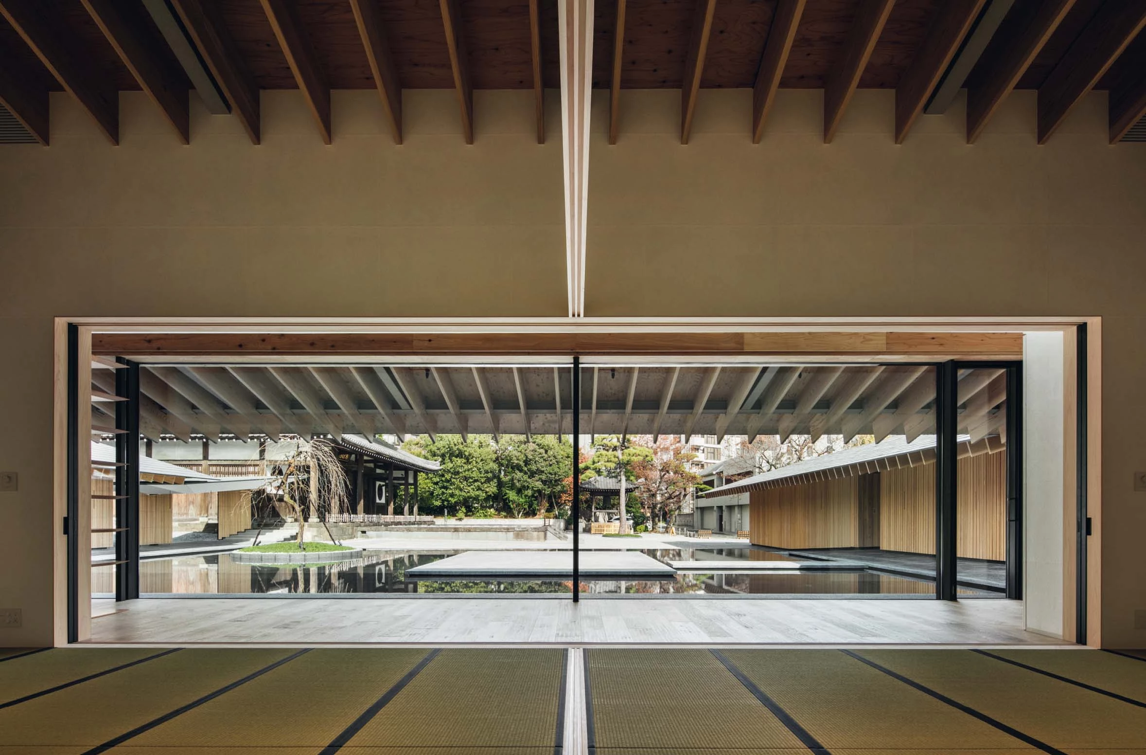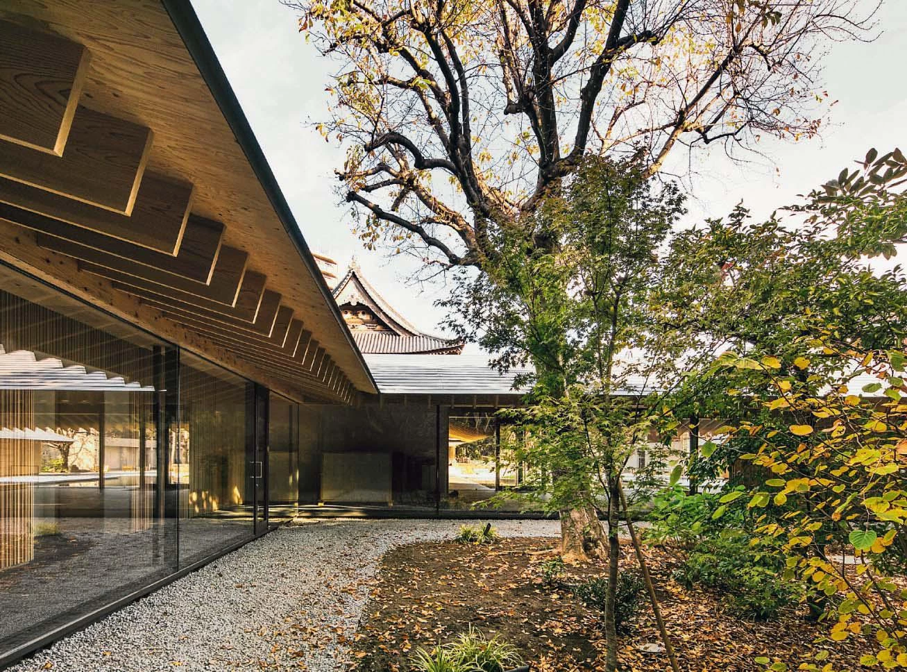 El templo Zuishoji es el principal lugar de culto en Tokio de la secta Obaku, una de las tres escuelas del budismo Zen en Japón. El edificio del repositorio, clasificado en 1992 como jubun o Bien Cultural Importante, data del periodo Edo e incorpora rasgos singulares de la arquitectura tradicional china como la profundidad de los aleros o el énfasis axial. El proyecto desarrollado por Kengo Kuma & Associates reinterpreta estos elementos patrimoniales a través de una intervención contemporánea que se alinea con el eje principal del recinto sagrado y delimita un claustro semicerrado. Los nuevos volúmenes, que albergan las habitaciones de los sacerdotes, se distribuyen en torno a una lámina de agua que cuenta con un escenario para celebrar eventos. Construida con madera y metal, la cubierta está formada por una sucesión de vigas que siguen la geometría del tejado a dos aguas y avanzan más allá del límite de las salas, creando un alero continuo a lo largo de todo el perímetro. El amplio canto de las vigas de madera contrasta con la esbeltez de las columnas metálicas y subraya la horizontalidad del conjunto. Además de los espacios privados para los sacerdotes, el conjunto cuenta con una sala multiusos cerrada por grandes ventanas correderas de vidrio que conecta visualmente el jardín trasero con el patio central.