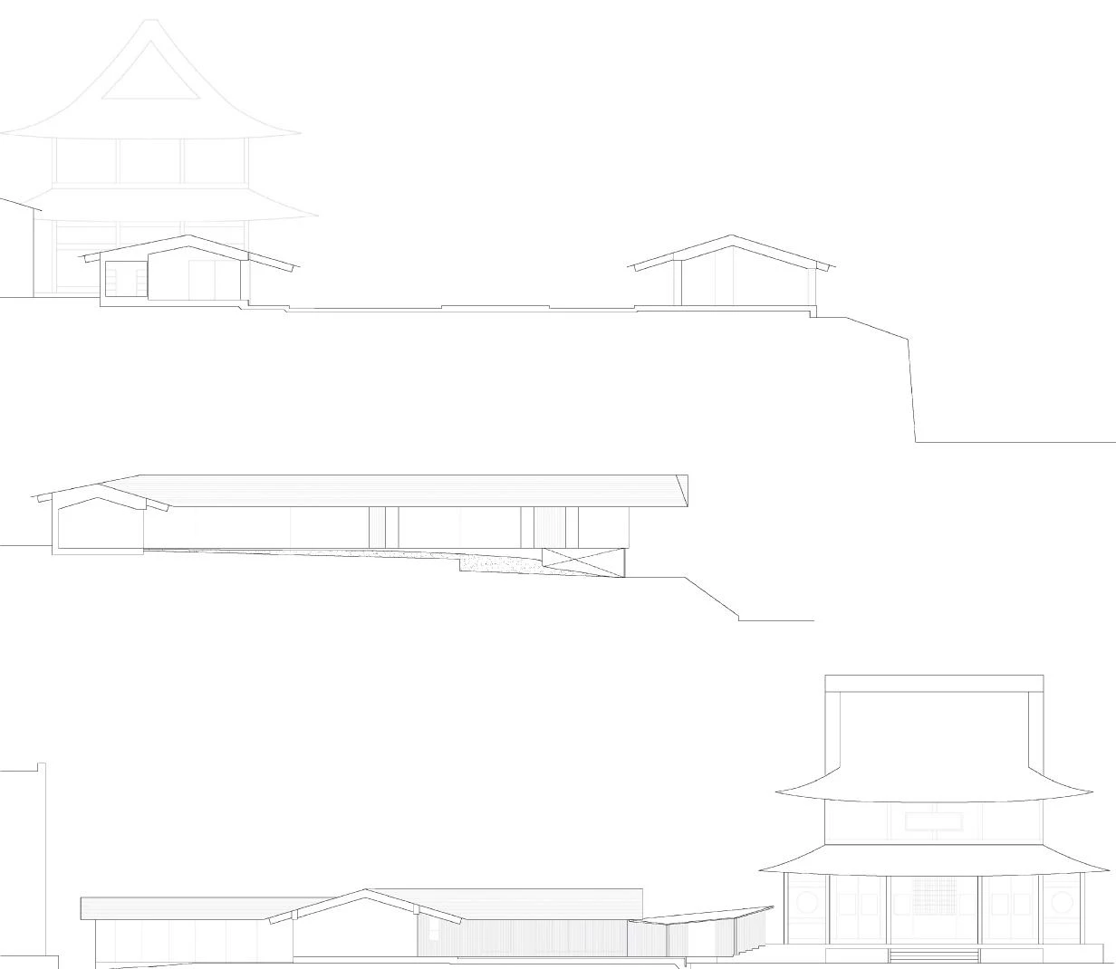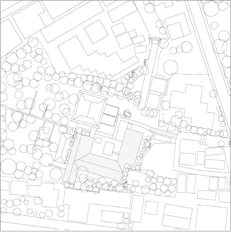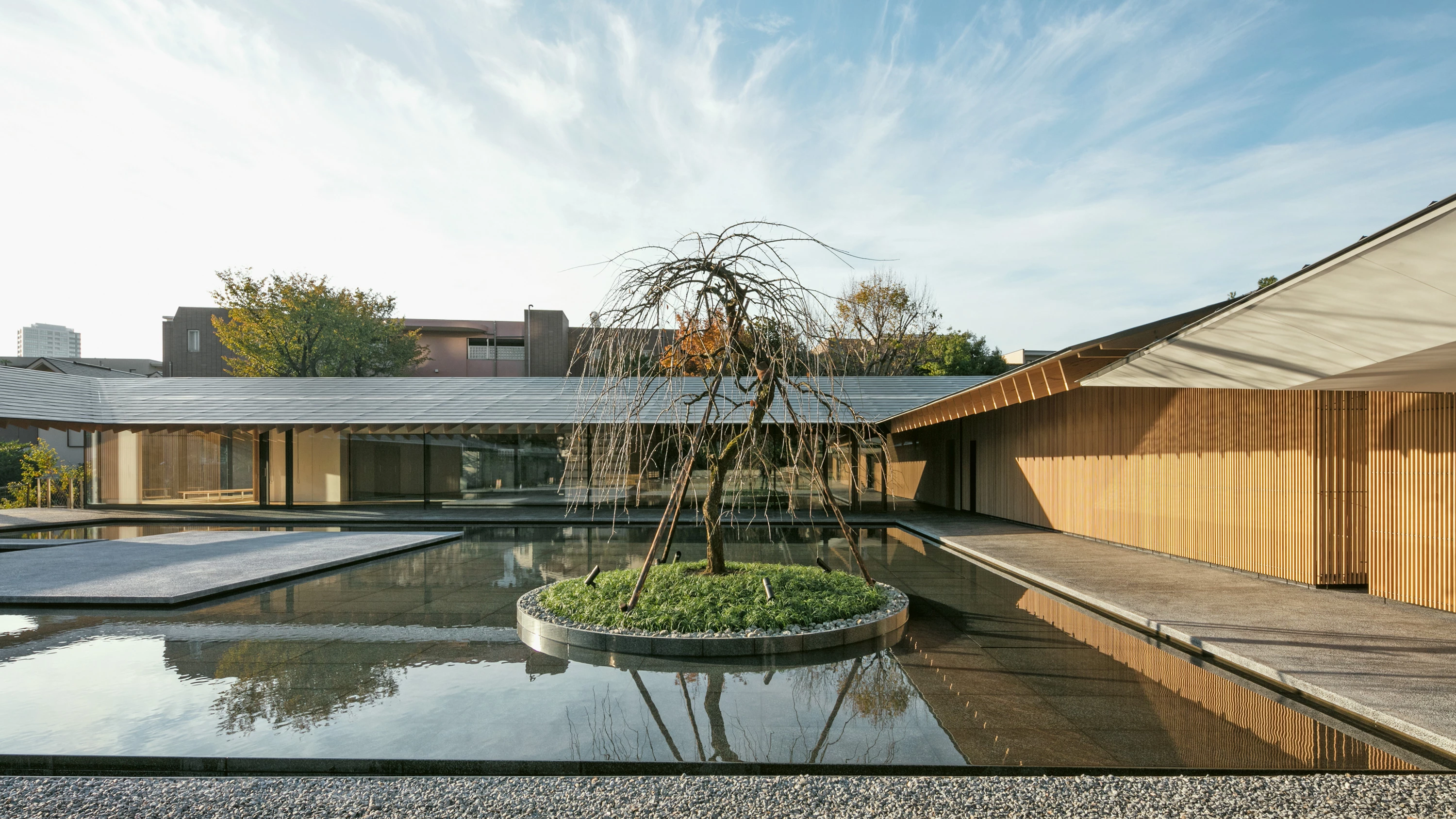El templo Zuishoji es el principal lugar de culto en Tokio de la secta Obaku, una de las tres escuelas del budismo Zen en Japón. El edificio del repositorio, clasificado en 1992 como jubun o Bien Cultural Importante, data del periodo Edo e incorpora rasgos singulares de la arquitectura tradicional china como la profundidad de los aleros o el énfasis axial. El proyecto desarrollado por Kengo Kuma & Associates reinterpreta estos elementos patrimoniales a través de una intervención contemporánea que se alinea con el eje principal del recinto sagrado y delimita un claustro semicerrado. Los nuevos volúmenes, que albergan las habitaciones de los sacerdotes, se distribuyen en torno a una lámina de agua que cuenta con un escenario para celebrar eventos. Construida con madera y metal, la cubierta está formada por una sucesión de vigas que siguen la geometría del tejado a dos aguas y avanzan más allá del límite de las salas, creando un alero continuo a lo largo de todo el perímetro. El amplio canto de las vigas de madera contrasta con la esbeltez de las columnas metálicas y subraya la horizontalidad del conjunto. Además de los espacios privados para los sacerdotes, el conjunto cuenta con una sala multiusos cerrada por grandes ventanas correderas de vidrio que conecta visualmente el jardín trasero con el patio central.