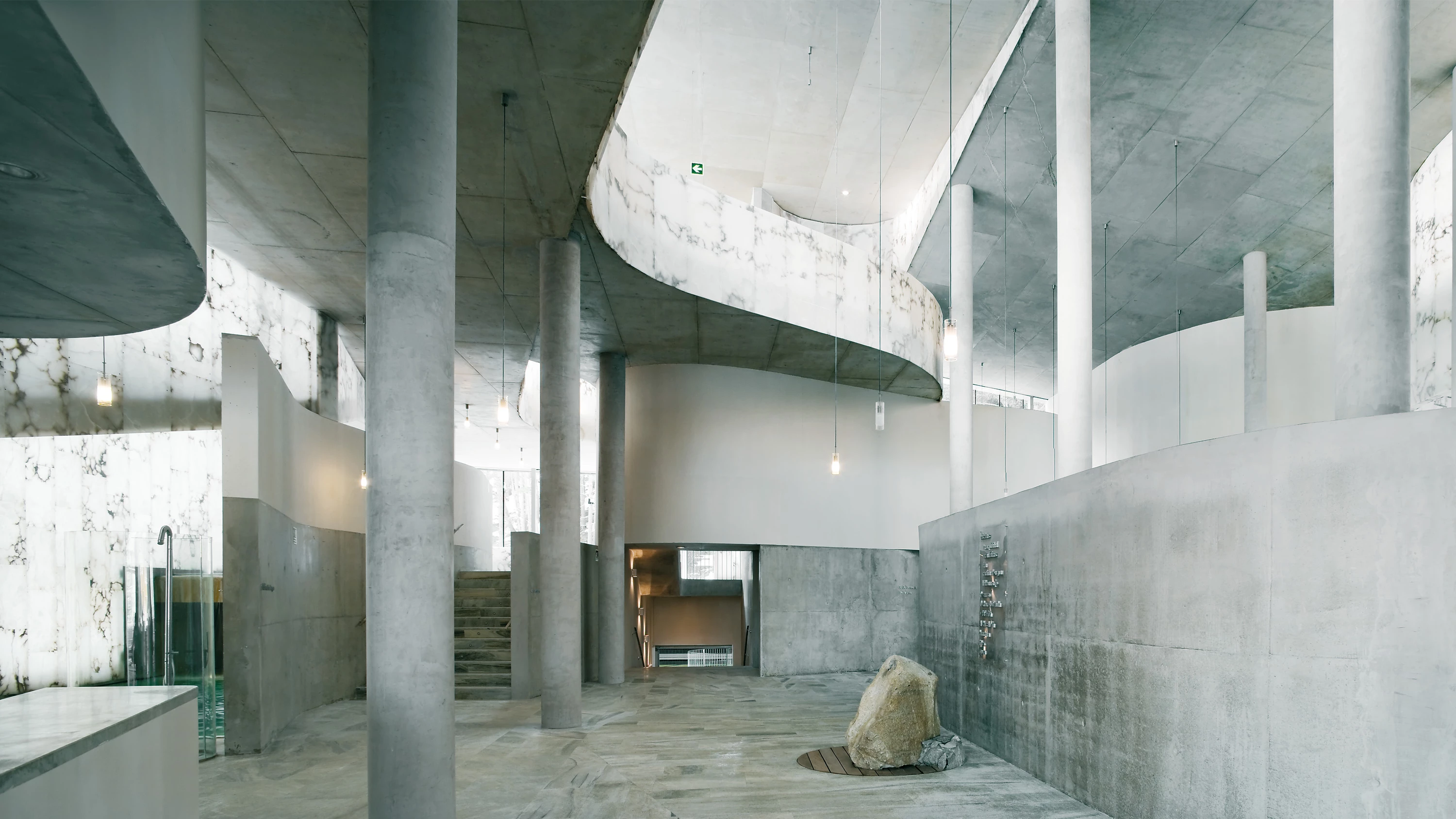 La planta de acceso a cota es un espacio de doble altura que pivota alrededor de una escalera circular en el centro del espacio y es el eje vertical del proyecto, conectando todas las plantas. La entrada y salida de los clientes, desde el vestíbulo a las instalaciones, se realiza en un único punto junto a la recepción. Antes de entrar, el visitante tiene acceso a la cafetería, tienda, peluquería y zona de información donde se explican los tratamientos y servicios de las instalaciones de las Termas. La planta de cabinas terapéuticas en el sótano cuenta con un patio inglés donde rebosa el agua de la fuente. La entreplanta conecta con el nuevo Hotel Mediodía y permite el acceso a las suites vip. La planta de las piscinas es la más compleja y extensa. La piscina de hidroterapia domina el espacio central de doble altura, con un gran ventanal hacia el monte. Todos los demás espacios —bar, sala relax, saunas y hamam, piscina de ejercicio, piscina de relax, piscina exterior, piscina de niños— son accesibles desde este gran distribuidor. La piscina de relax cuenta con una gran abertura al cielo y es, por tanto, un espacio exterior.