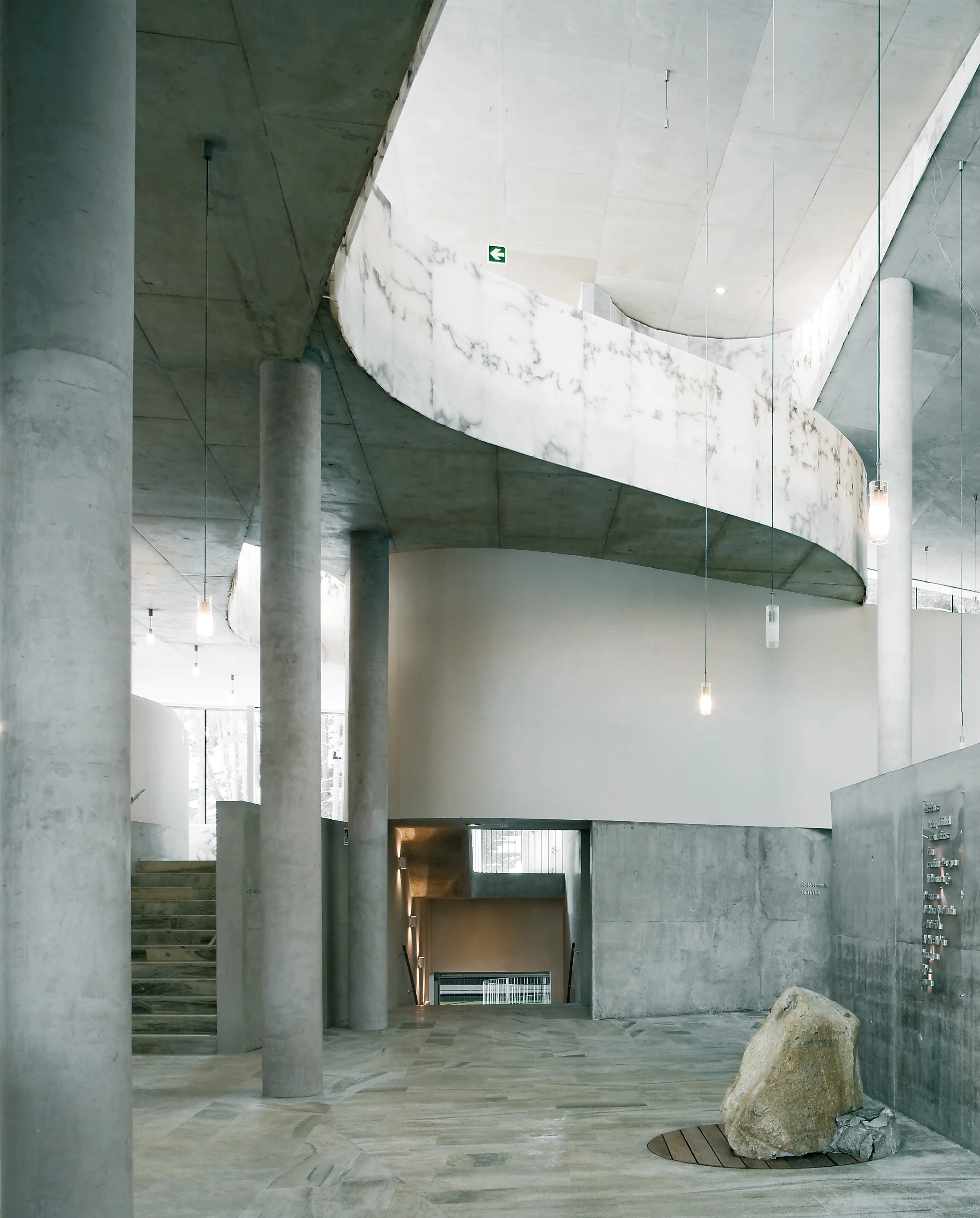 La primera dificultad del proyecto consistió en lograr el equilibrio entre un volumen exterior respetuoso con su entorno y un extenso programa, parte del cual hubo de soterrarse y en el que no se quería que faltase la luz natural y el contacto con el exterior. Se empezó modelando vacíos en los volúmenes y aperturas en los paramentos, buscando proyectar en los interiores una sensación de amplitud, abundancia de luz natural y acceso a las vistas del entorno natural, que liberasen al edificio de las difíciles condiciones del solar, acorralado entre la ladera de la montaña y una iglesia. El volumen del edificio se compone de una serie de muros curvilíneos que salen de la montaña y mueren en ella. Estos muros se van retranqueando en altura; como bancales se aproximan a la montaña, pero también la contienen.