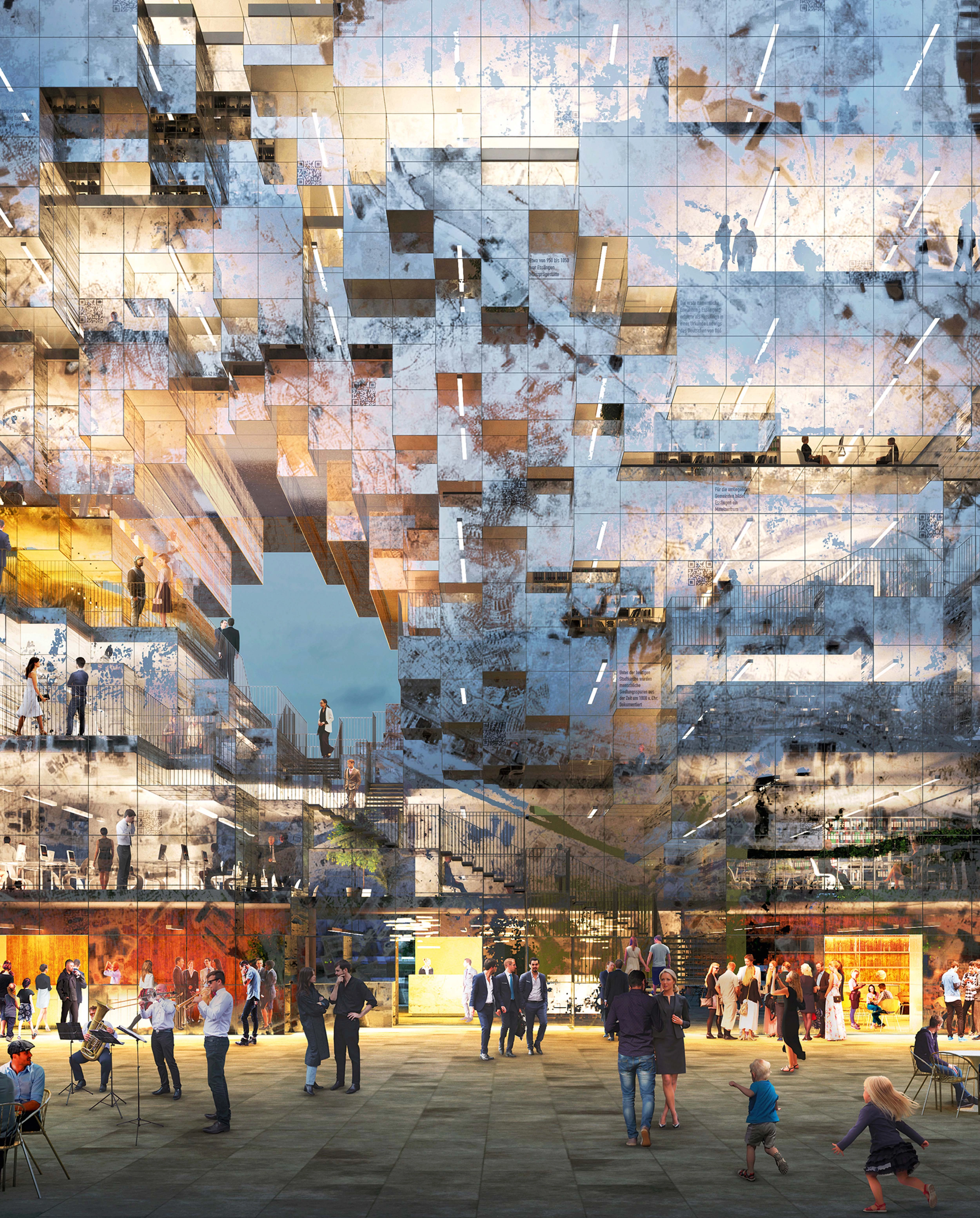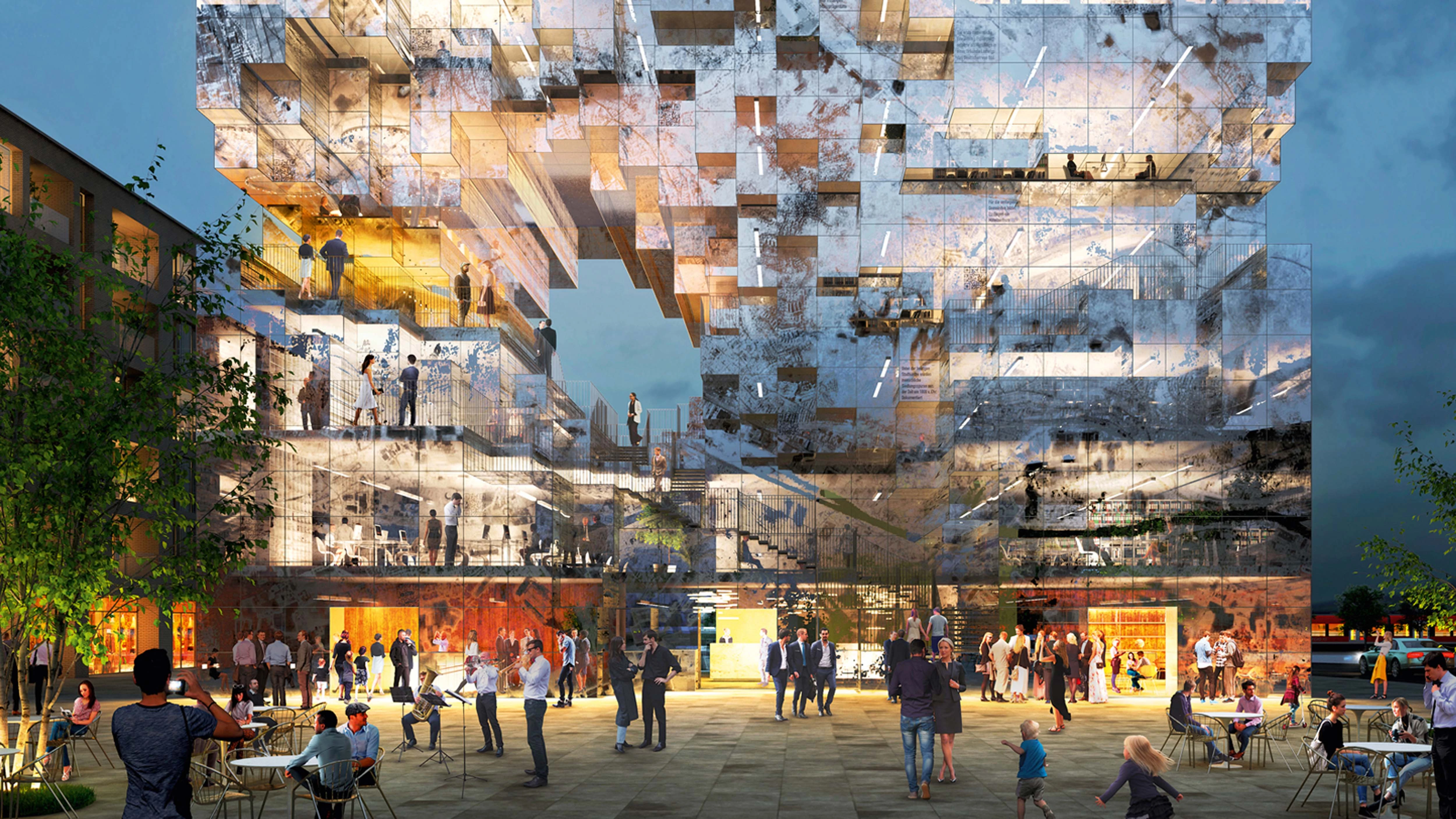 Una fachada interactiva de vidrio sinterizado con células fotovoltaicas recoge el mapa pixelado de la ciudad y contiene información sobre su historia y su gente. El edificio de oficinas se abre a la plaza con servicios como restaurante, cafetería y áreas de reunión... [+]