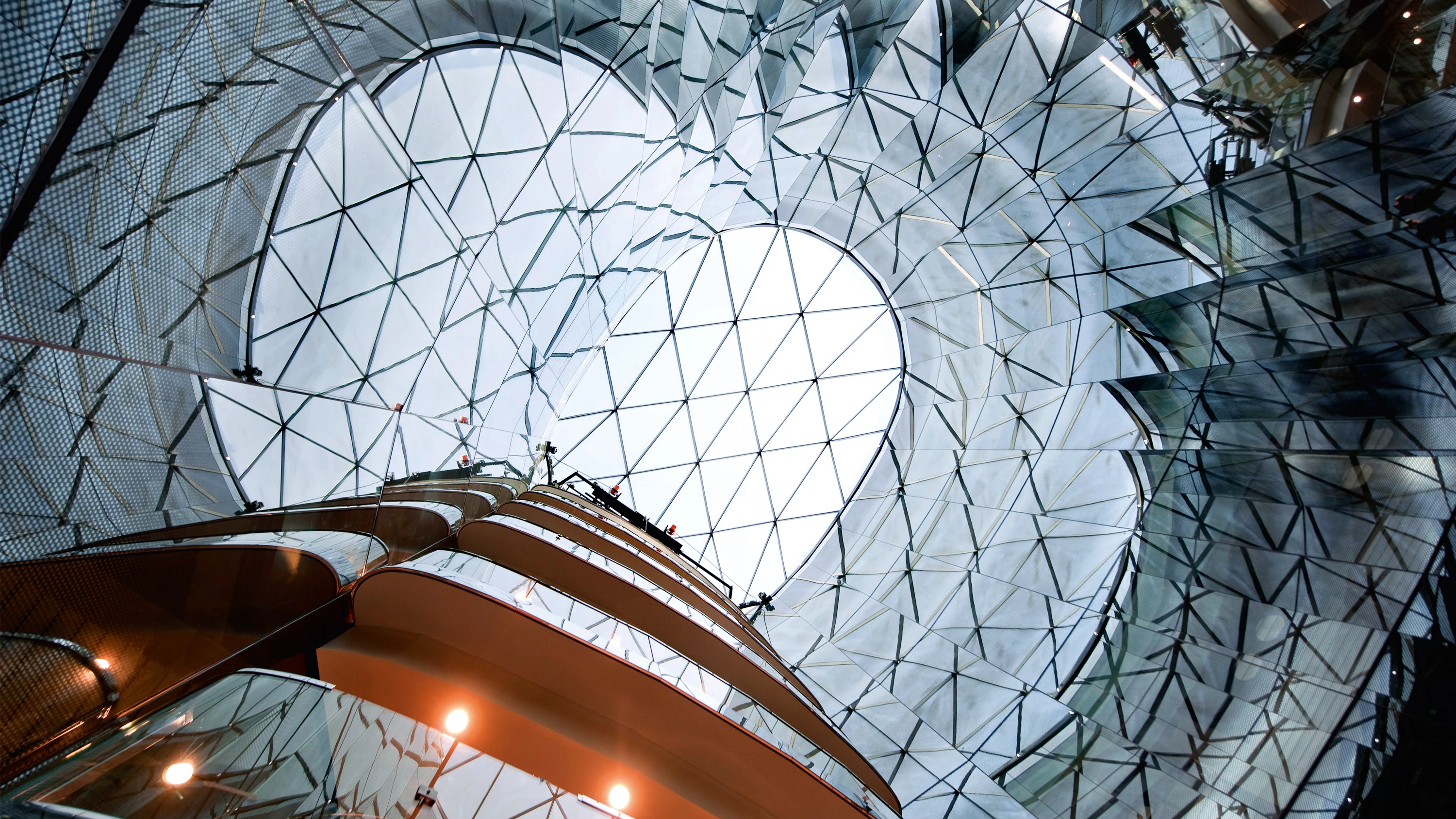 Dos atrios bañados de luz natural mediante sendos lucernarios de superficie poliédrica organizan el espacio interior, acondicionado de acuerdo a criterios de sostenibilidad, como la producción de energía por trigeneración, el uso de paneles fotovoltaicos, y la recogida y reciclaje de agua, estrategias combinadas que han justificado que el edificio haya obtenido el certificado medioambiental BREEAM con la calificación ‘excelente’.