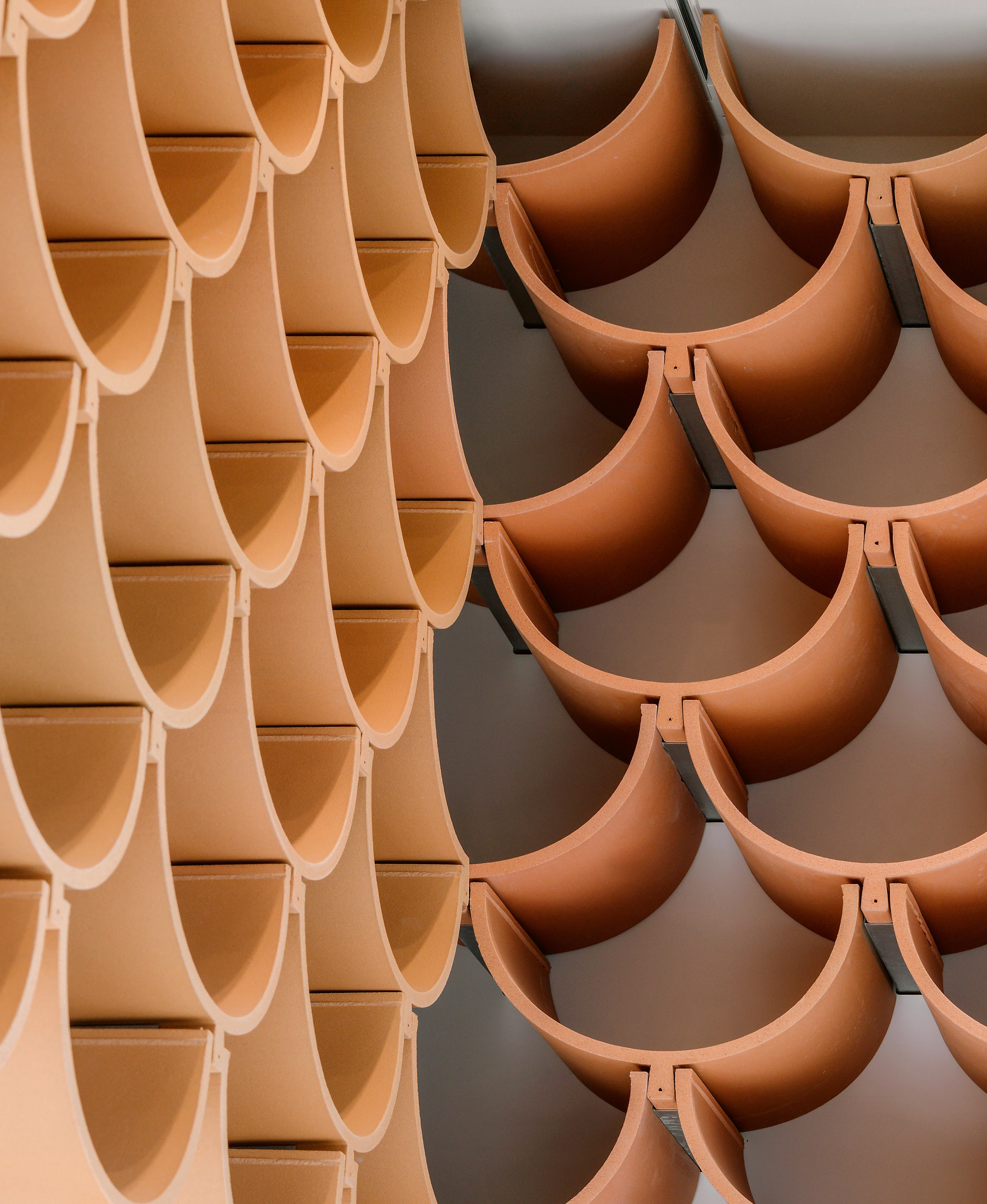 Frente a la Plaza de Cataluña en Barcelona, la tienda Camper reinterpreta la bovedilla cerámica tradicional al crear un elemento modular que resuelve todo el mobiliario, desde el mostrador a las estanterías o los bancos.