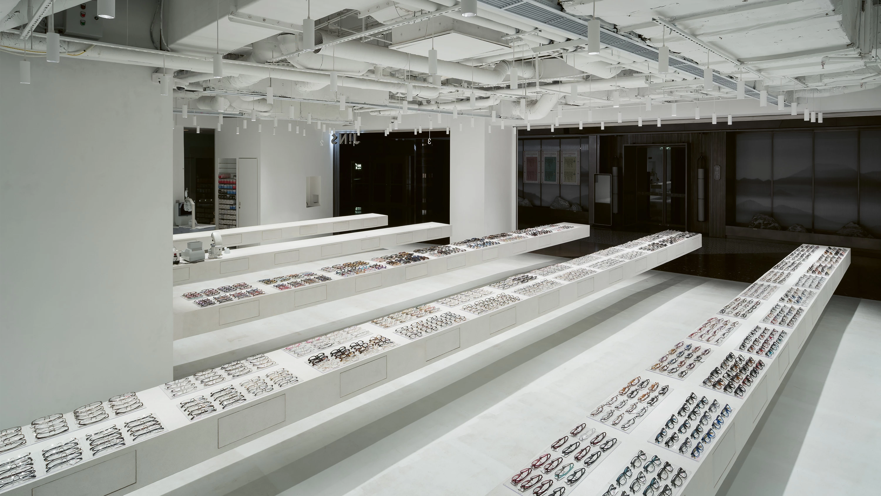 Ubicada en el distrito financiero de la capital económica de China, la tienda JINS se ha concebido como un gran vacío libre de servidumbres estructurales que hace posible tanto la circulación adecuada de los clientes como la presentación escenográfica y a la vez flexible de los productos en venta. Este gran vacío central queda colonizado con cinco mesas expositoras que se han dipuesto, de una manera inquietante, en voladizo, y cuya longitud máxima es de doce metros: un gesto esructural que se explica por el hecho de que las mesas funcionen, en realidad, como grandes vigas pretensadas de hormigón armado. El canto de estas mesas-vigas se ha reducido al máximo —hasta los 25 centímetros—, de tal manera que bajo ellas quede un vacío que refuerce la sensación general de ligereza que resulta característica de la tienda. Dispuestos en las bandas paralelas de los expositores-viga, los productos se colocan formando rigurosas series minimalistas.