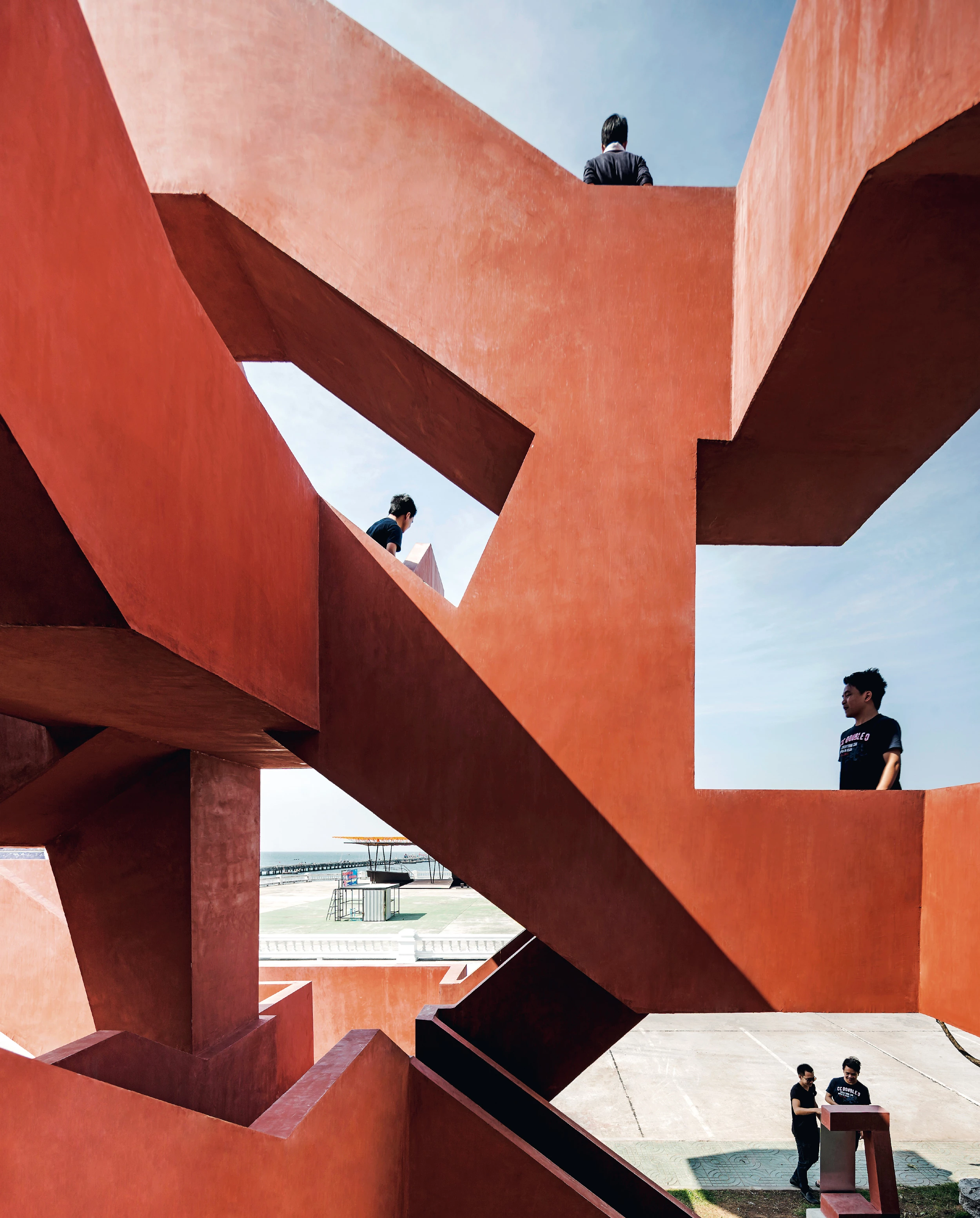 Configurada como una estructura de hormigón de 8,5 m cuyo núcleo soporta diez voladizos con escaleras y plataformas, la torre invita al usuario a la actividad y al intercambio; sus intrincados recorridos intersecados evocan la espacialidad laberíntica de Escher... [+]