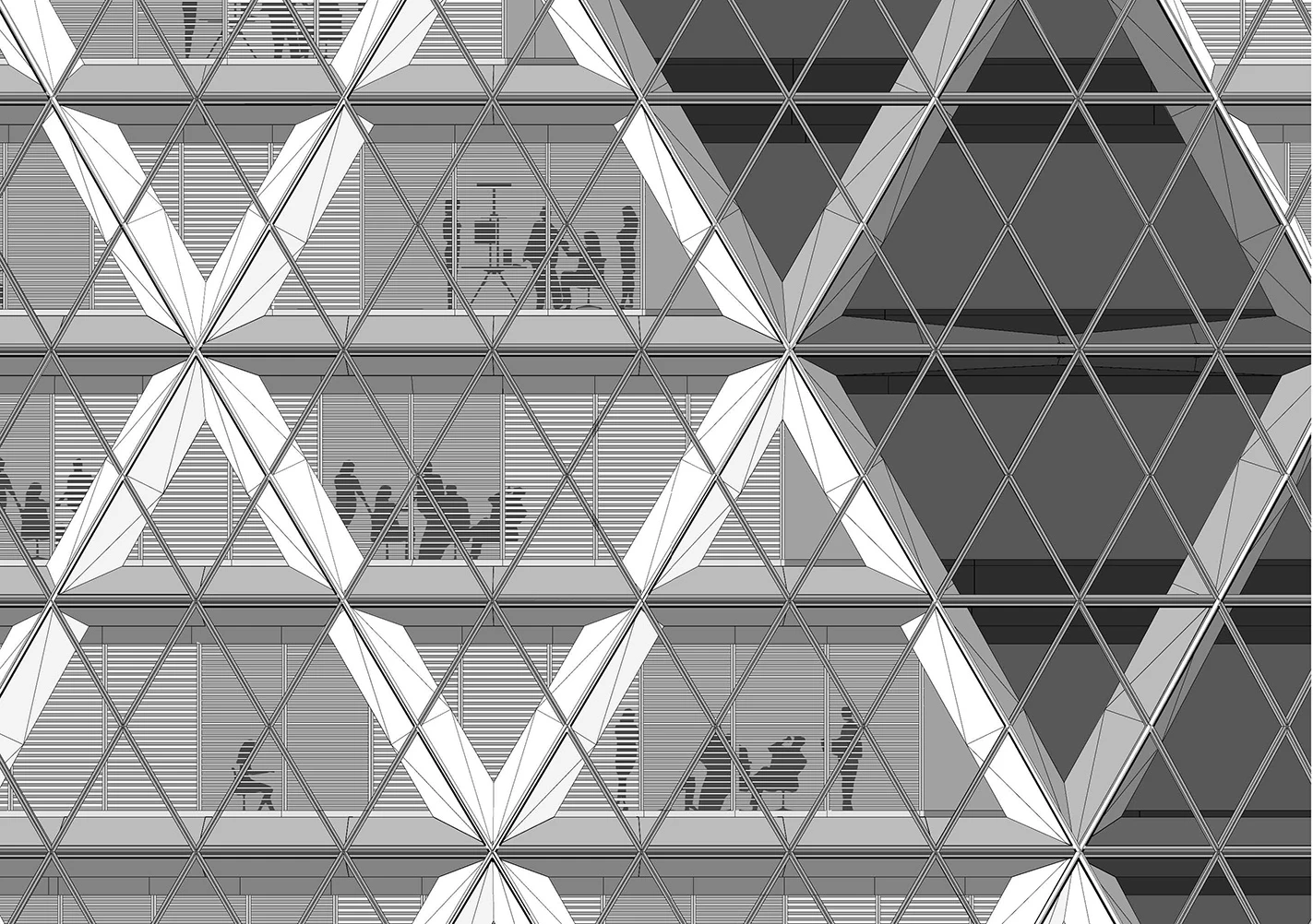 La planta circular impedía tratar de forma específica la fachada para responder a las exigencias de cada orientación; se decidió así envolver la estructura mediante un cerramiento doble que canaliza el aire temperado y alberga además las persianas, de manera que la ventilación natural suplementa la mecánica durante el 40 por ciento del año reduciendo el consumo energético. Dos tipos de piezas integran este cerramiento: una romboidal entre forjados, y otra formada por dos sectores triangulares planos que dejan una rendija entre sí desde la que se incorpora aire fresco al plénum de cada planta. Los atrios se cierran mediante vidrios simples practicables y otras piezas dobles y fijas, dejando que el edificio respire de forma lenta pero constante.[+][+]