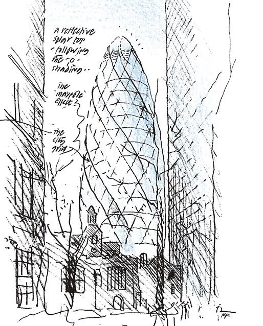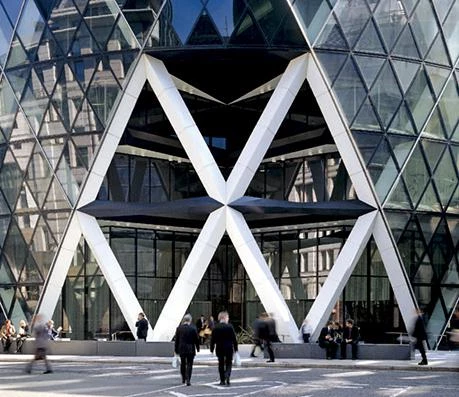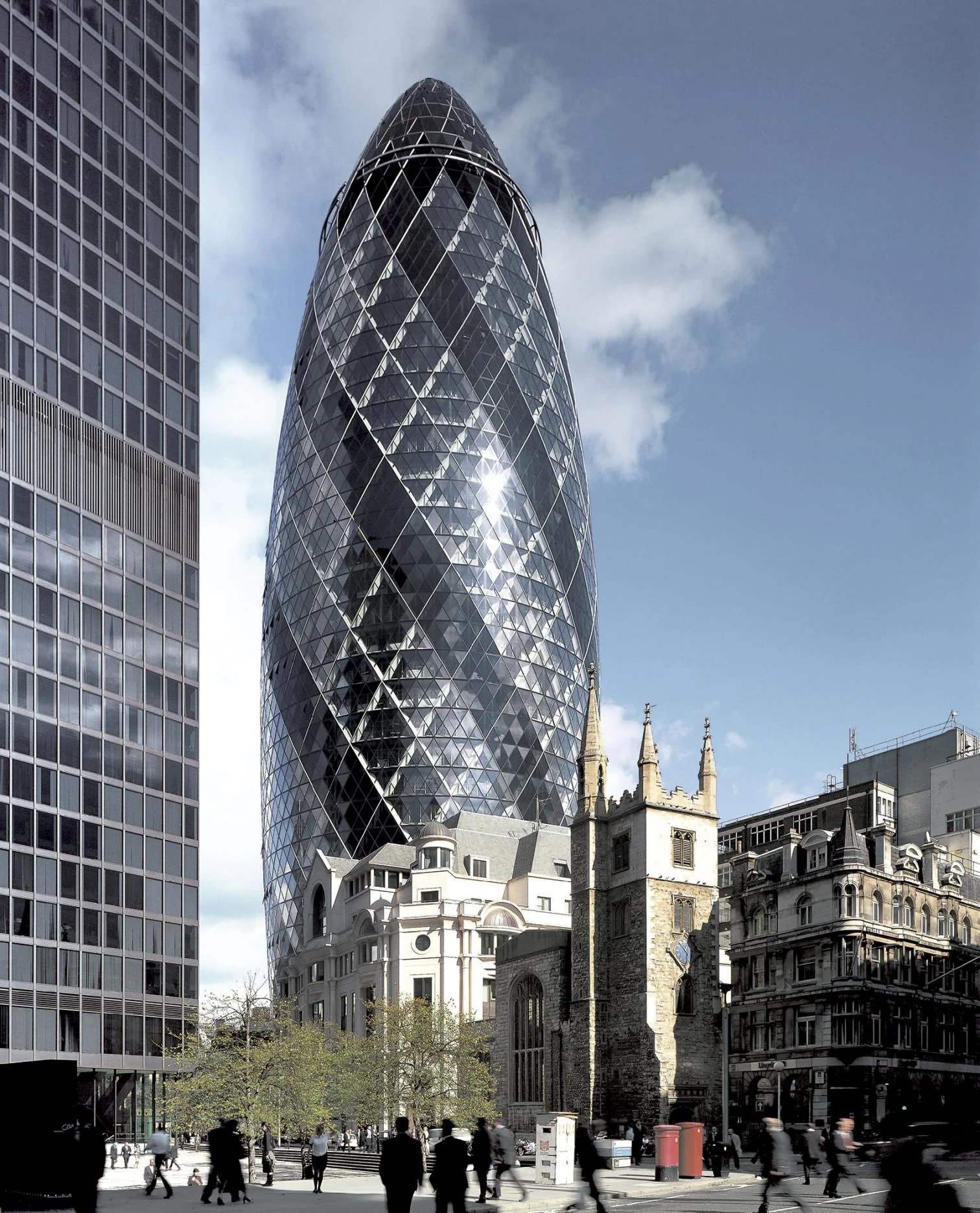En el corazón financiero de Londres, sobre el solar de la antigua Baltic Exchange, el edificio de Swiss Re en el número 30 de St Mary Axe domina, con sus 180 metros de altura, el perfil de la ciudad. De silueta fusiforme, su huella circular en el nivel de la calle permite esponjar el tejido urbano, generando una plaza pública delimitada por muretes que integran también el mobiliario urbano.
