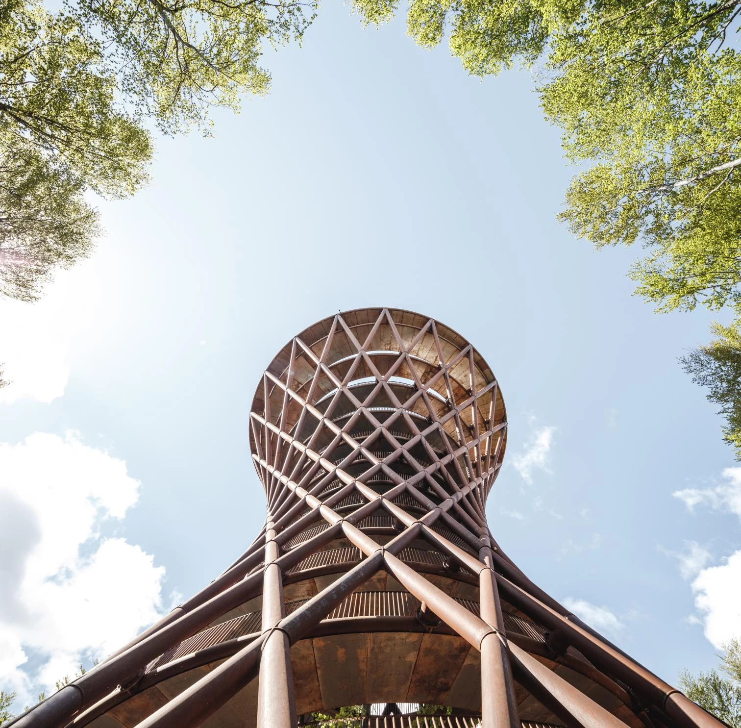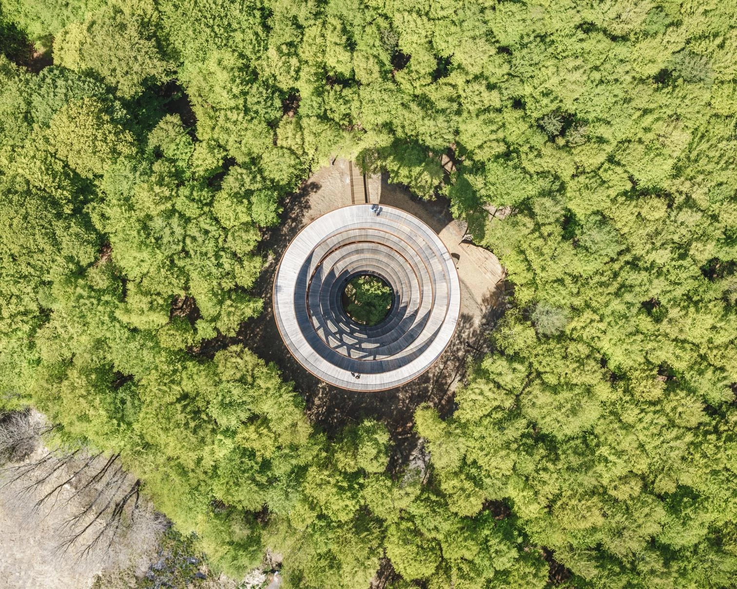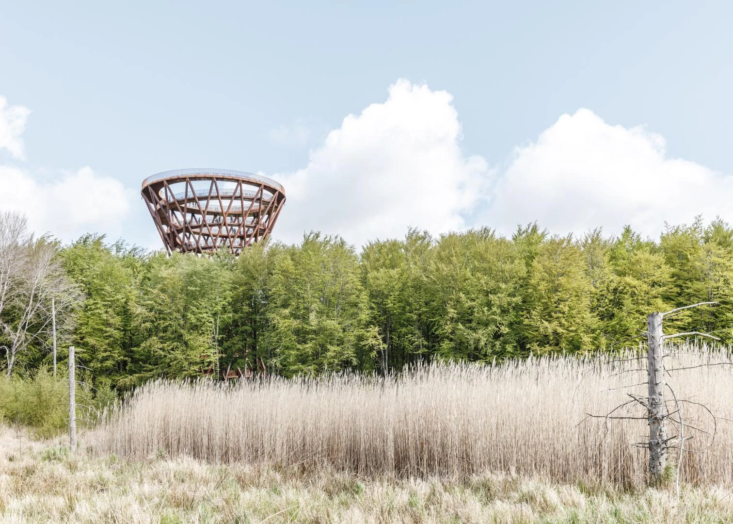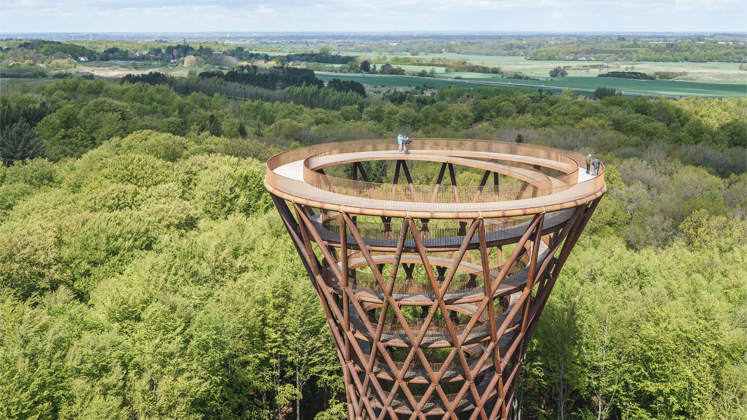 Obra del estudio de Copenhague EFFEKT, dirigido por Tue Foged y Sinus Lyngeesta, esta torre alberga una pasarela en espiral de madera de roble que permite ver por encima de la copa de los árboles del bosque de Gisselfeld Klostersen en Haslev, localidad situada a 60 kilómetros de la capital danesa. La torre de 45 metros de altura forma parte de Camp Adventure, el parque de escalada más grande de Dinamarca, y está ubicada al final de un sendero boscoso de 900 metros de largo. La estructura de perfil curvo se estrecha en la parte central a semejanza de un reloj de arena. Su armazón está formado por soportes diagonales de acero cortén entrecruzados, que se extienden desde el suelo hasta la parte superior, desde donde en días claros se pueden ver Copenhague y Malmø... [+]