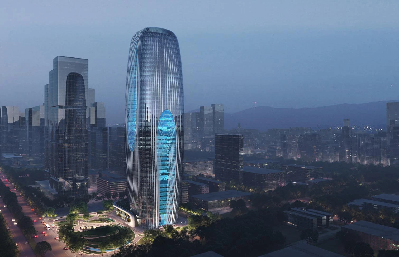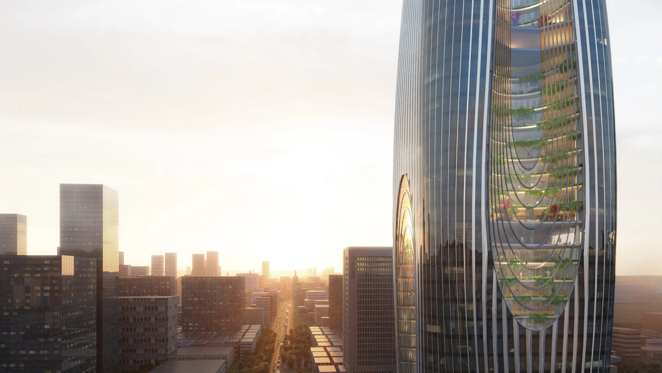 En la intersección entre las calles Jingye y Zhangbawu, en el distrito Yanta de la ciudad, esta torre de 210 metros de altura incluye 127.220 metros cuadrados de oficinas, tiendas e instalaciones auxiliares. La silueta suavemente curvada de la torre presenta diferentes capas vidriadas y amplios atrios, generando terrazas interiores con vegetación que evocan la ladera de una montaña. El diseño opta a la certificación LEED Gold y la calificación más alta de tres estrellas del Programa de Construcción Ecológica de China.