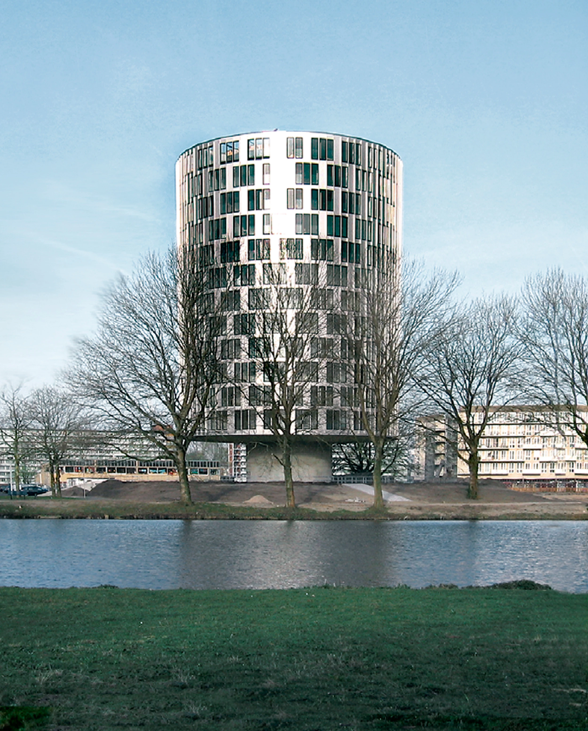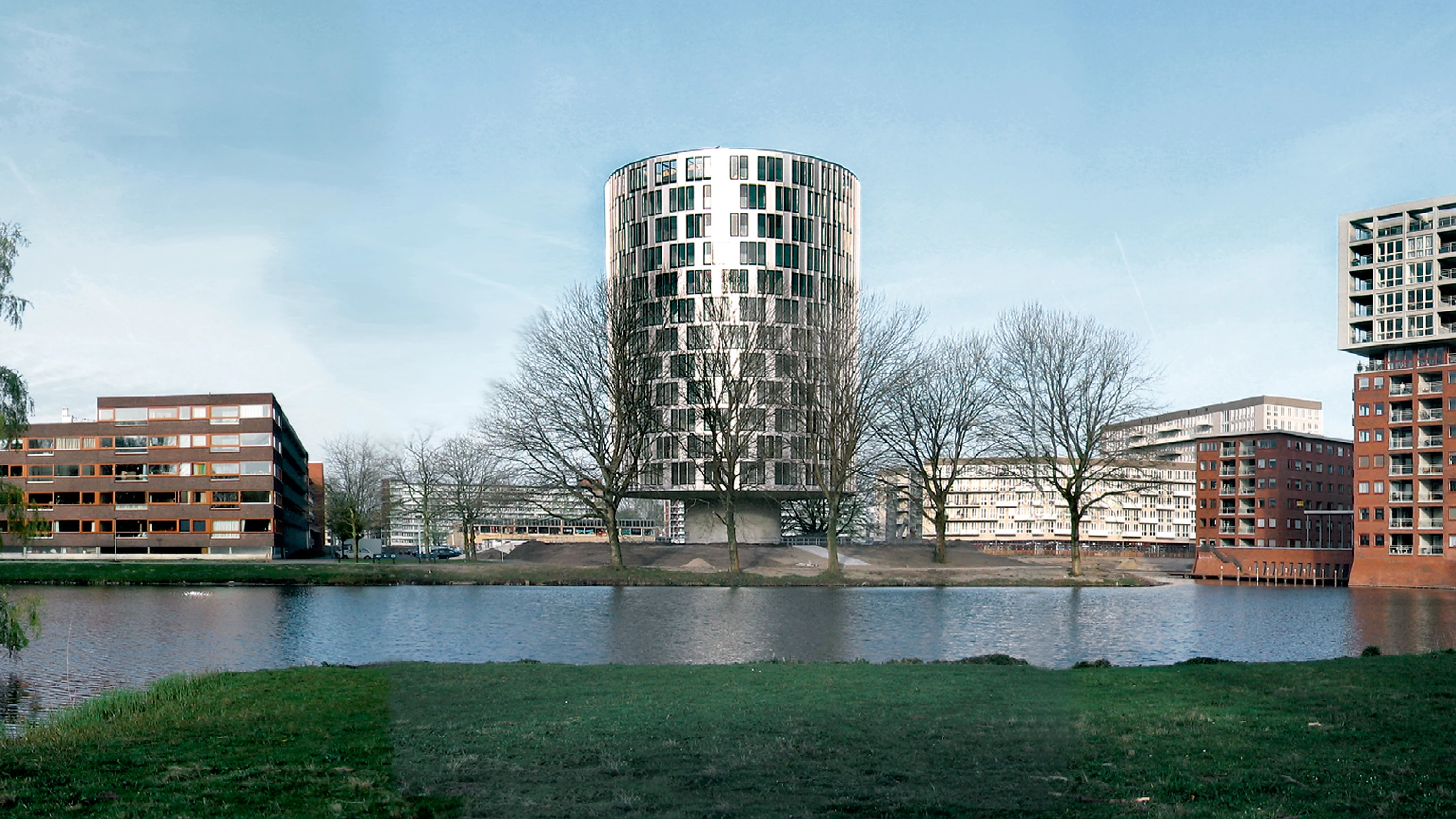 La torre de apartamentos en el lago Sloterplas forma parte de un plan de renovación para la zona que contempla la prolongación del bulevar existente, aplicando diferentes criterios urbanísticos a ambos lados de la calle: hacia el oeste se mantiene la estructura original de bloques ortogonales, mientras al lado este se levantan volúmenes aislados de diseño libre. Uno de ellos es la torre, que debe funcionar como baliza para el barrio remodelado; dadas las limitaciones en altura que impone la normativa, debe destacar en el entorno por su forma.