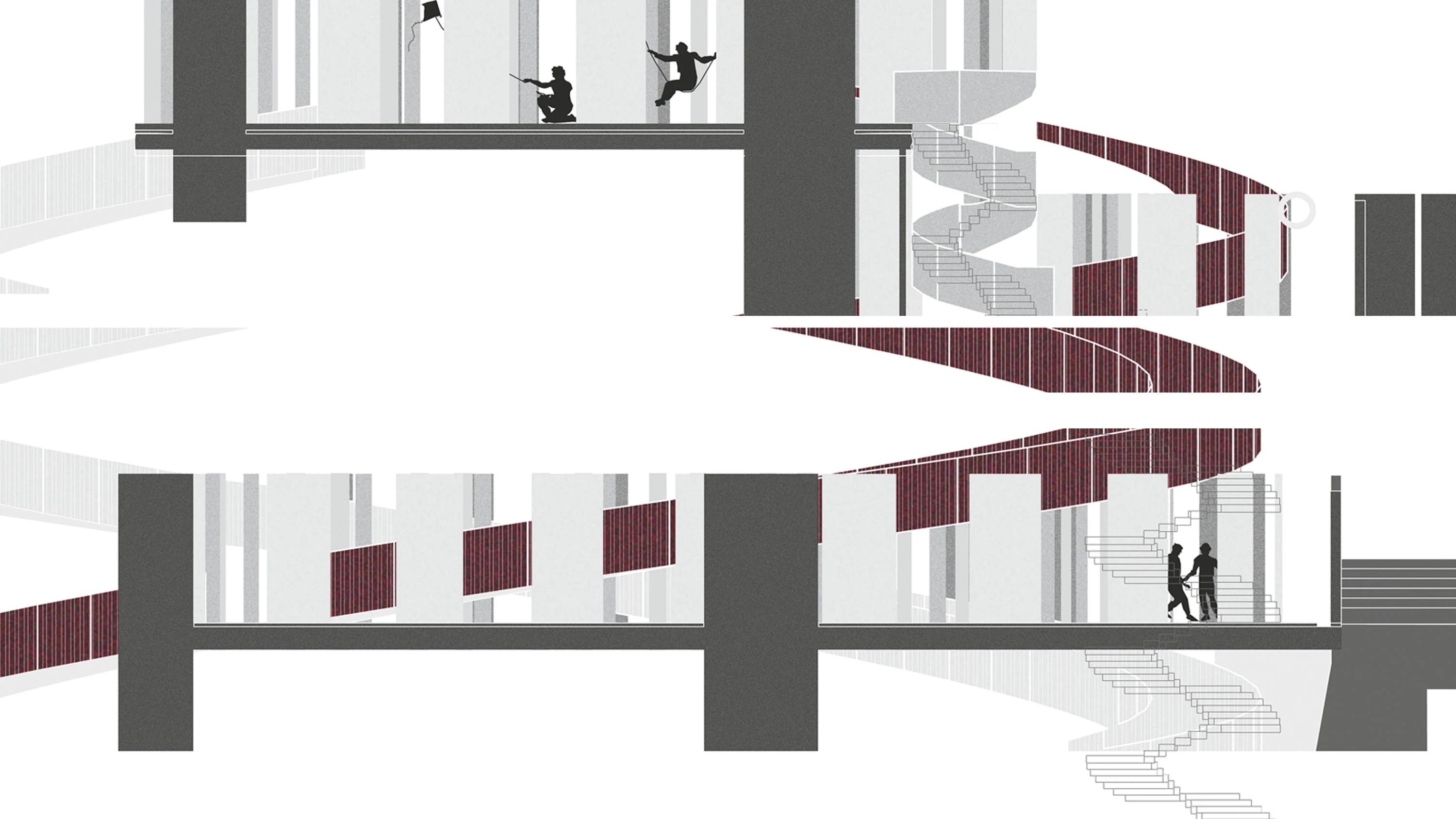 Concebido como un ‘condensador social’, el proyecto se implanta a los pies del Palacio Real de Madrid, en la recién rehabilitada ribera del Manzanares, buscando ser un intermediario entre la ciudad y el parque mediante un apilamiento de usos deportivos en altura. El conjunto está abierto al aire libre y los niveles inferiores se van protegiendo de las posibles lluvias gracias al conjunto de rampas y escaleras que no sólo cubren sino que también conducen el agua. Así, todos los materiales (el edificio se resuelve únicamente con acero y hormigón) están diseñados para aguantar la intemperie y, a través de sus acabados —antideslizantes en lugares húmedos y poco porosos en zonas donde se acumula más suciedad—, solventar los problemas funcionales del programa...[+]
