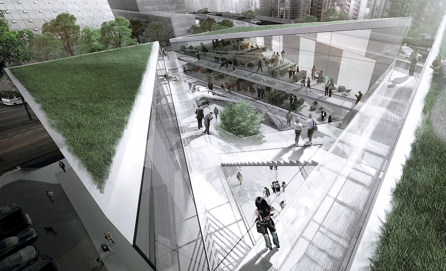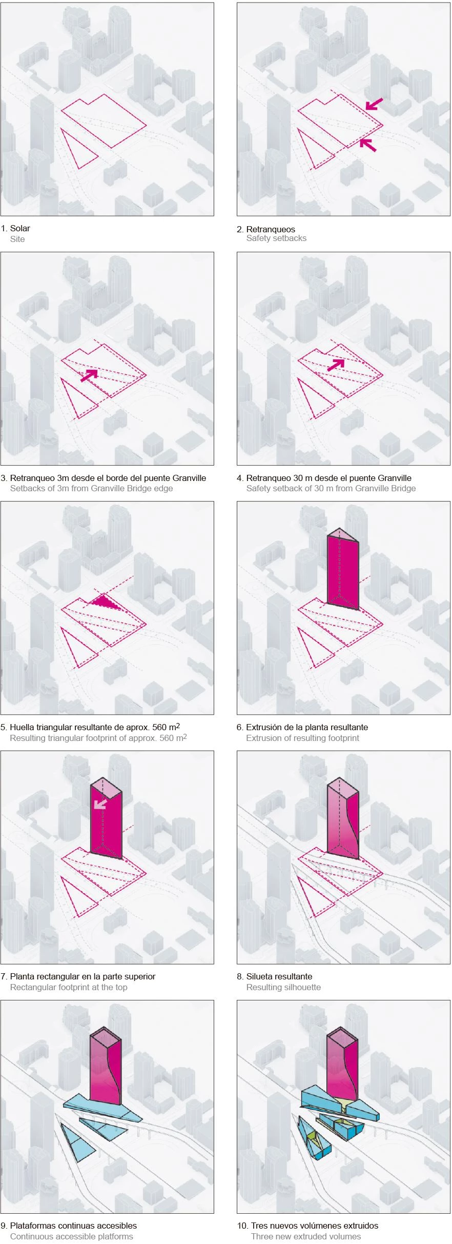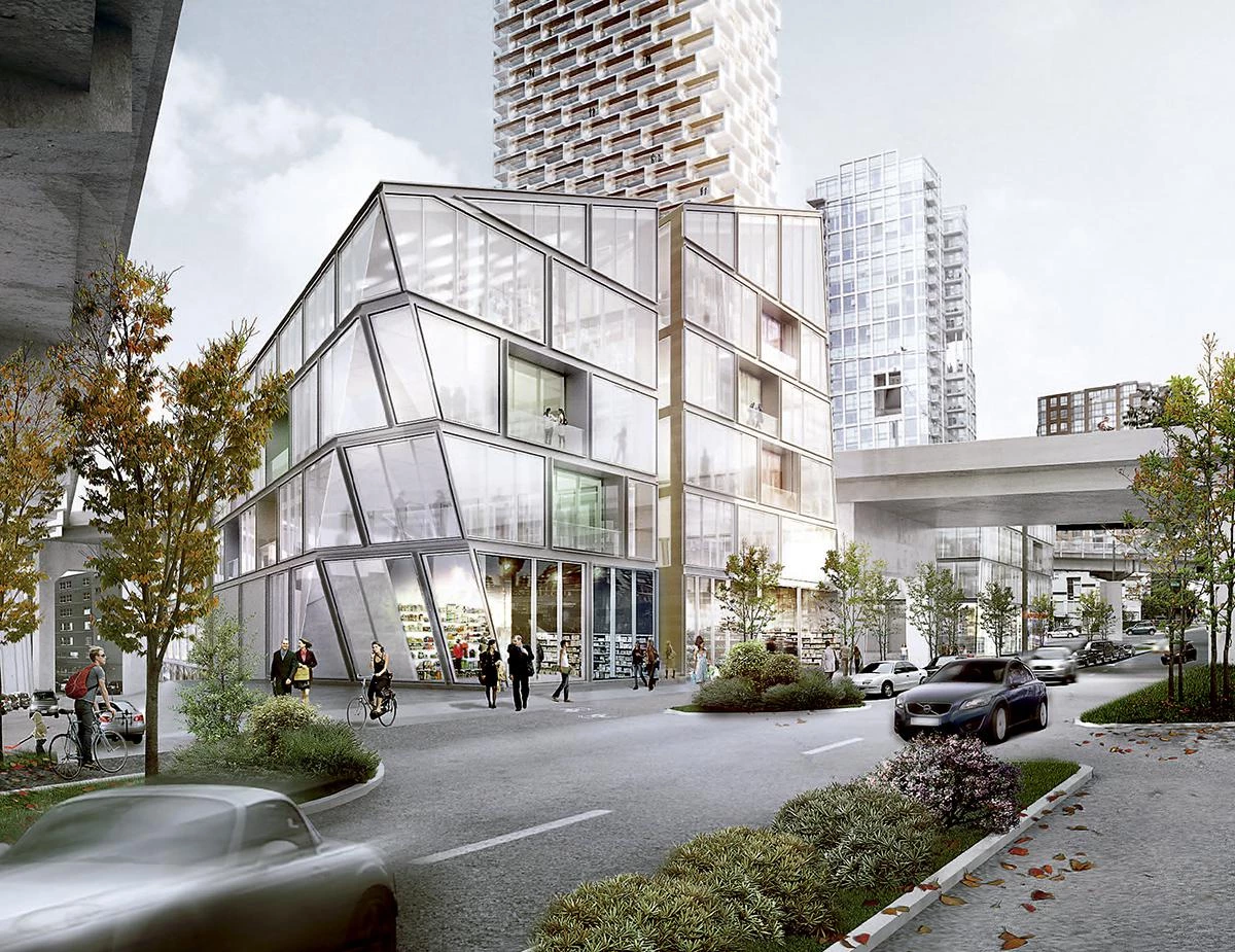 Bjarke Ingels BIG Bjarke Ingels GroupLa torre y el zócalo de usos mixtos proyectados en Vancouver pretenden dar continuidad a la corta aunque exitosa historia urbanística de la ciudad canadiense. La intervención se sitúa en la entrada desde el puente de Granville, en una posición tan estratégica como compleja, afectada por una autopista que atraviesa el solar. Lejos de ser un obstáculo, esta situación se convierte precisamente en el desencadenante del proyecto, que segrega los siguientes elementos: una torre de planta triangular, cuyo alabeo permite las vistas sobre el entorno montañoso de la ciudad; y un zócalo fragmentado, con espacios públicos de diversas escalas que prolongan la trama urbana y fomentan la actividad a pie de calle.