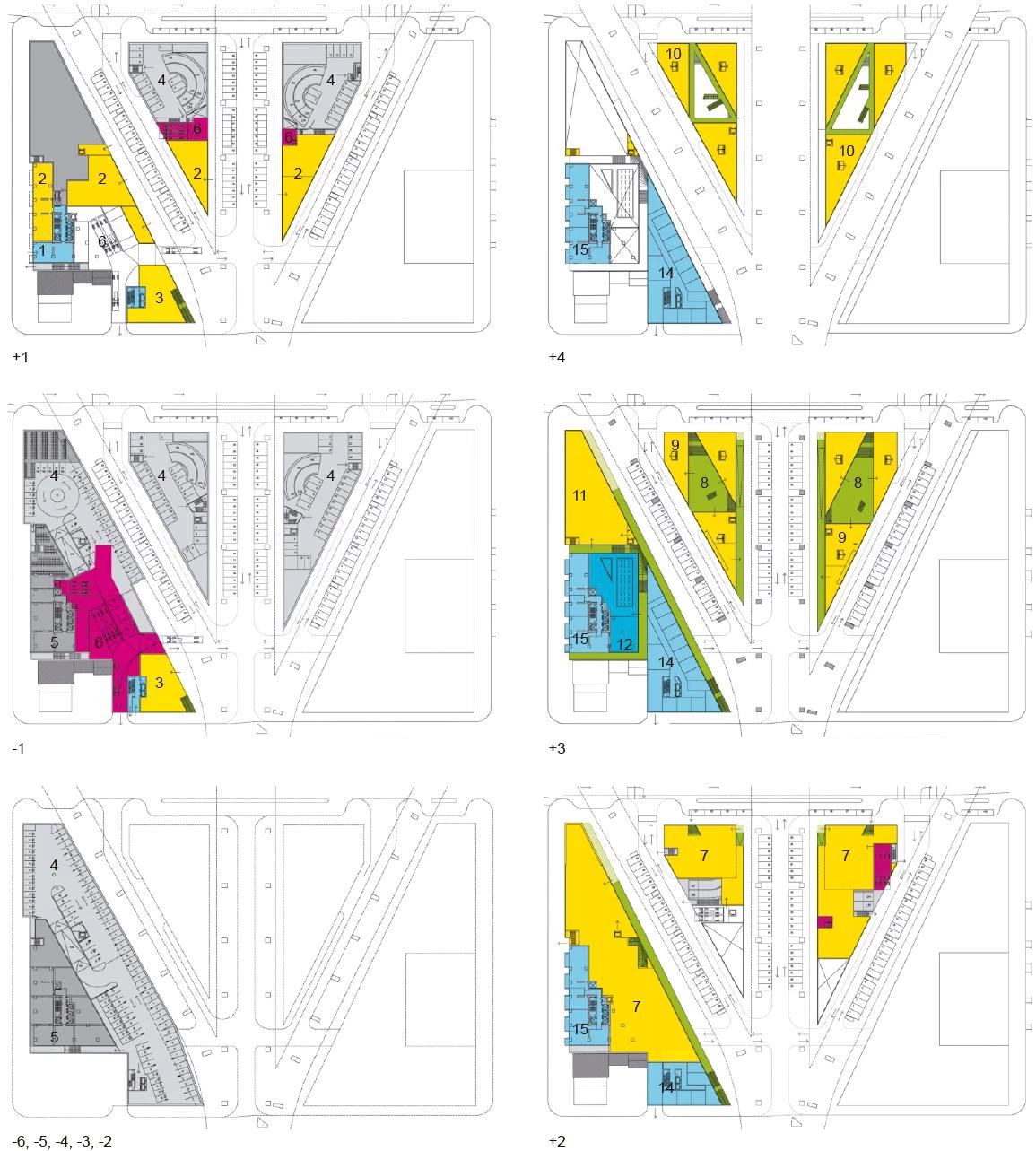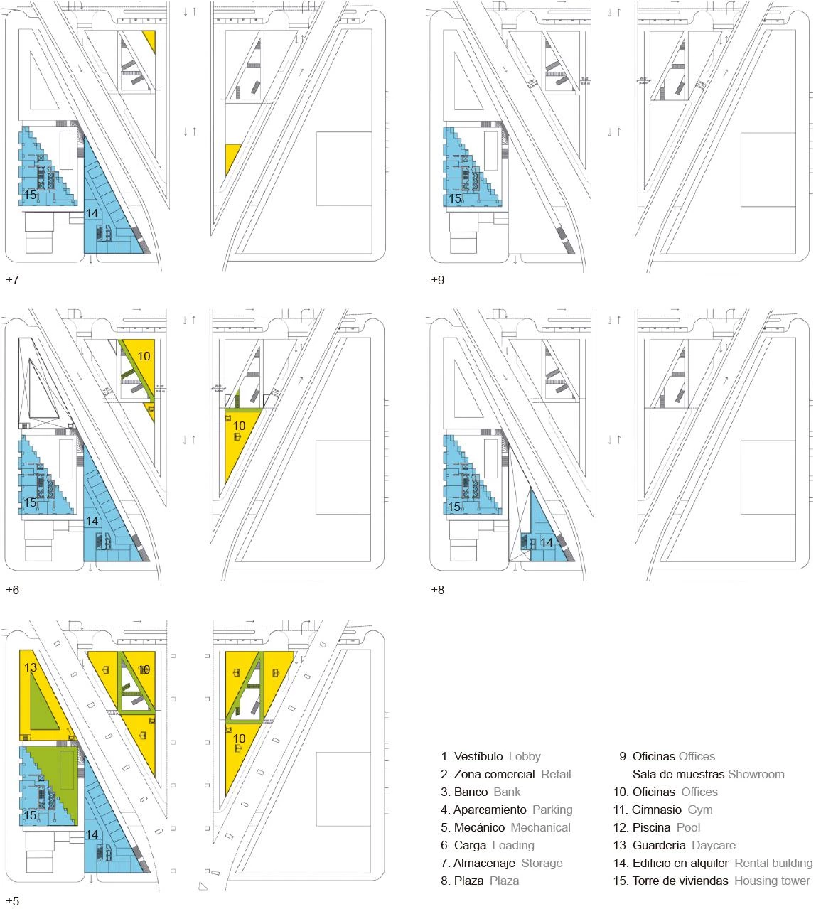 La huella de la torre surge como resultado de dos condicionantes. Por un lado, el retranqueo de treinta metros desde el puente Granville para evitar viviendas con ventanas y balcones expuestos al ruido del tráfico; y por otro, la preocupación por no arrojar sombra sobre el parque colindante al sur del solar. Partiendo de esta ineficiente forma triangular en su base, la torre asciende y se modela hasta adoptar una óptima planta rectangular. Se consigue así aumentar los espacios vivideros en la parte superior, y liberar la planta baja en favor de un espacio público.