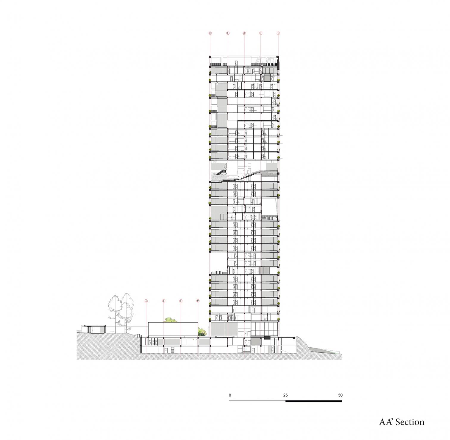 Triptyque Architects OfficeEste edificio de viviendas alcanza 124 metros de altura, redefiniendo el horizonte de Curitiba, la capital del estado brasileño de Paraná. Su fachada portante permite liberar los espacios interiores de las restricciones estructurales y la reversibilidad de las distribuciones. Respondiendo a la normativa local, la construcción presenta cortes en las caras norte y este. La retícula estructural se interrumpe para albergar espacios colectivos dedicados al deporte y al bienestar. Adaptada a la topografía irregular, la base de la torre establece una doble interacción: una conexión directa con la ciudad a nivel del suelo y la recreación de un espacio repleto de densa vegetación autóctona.