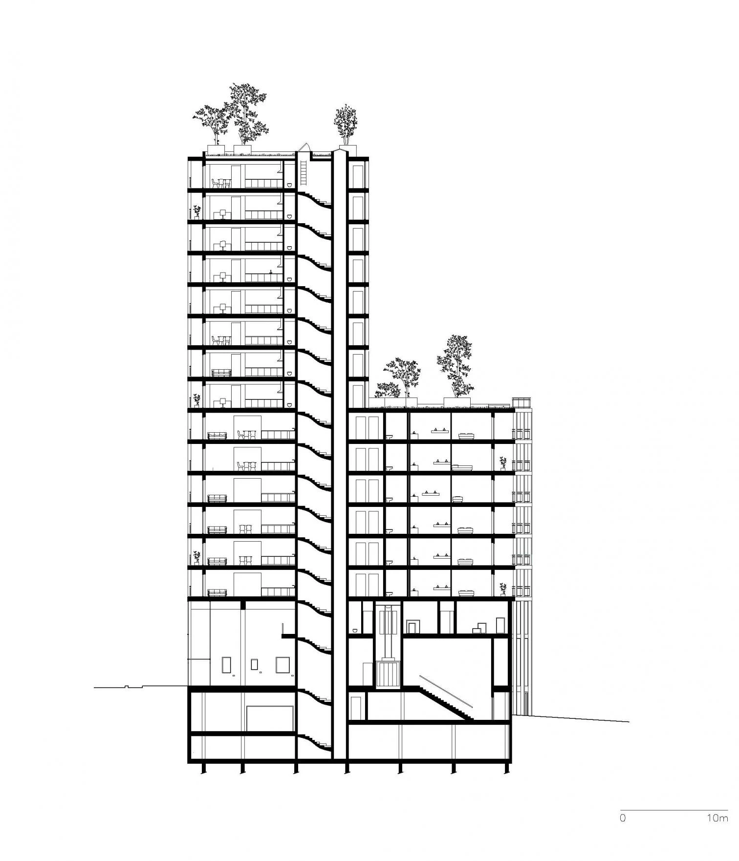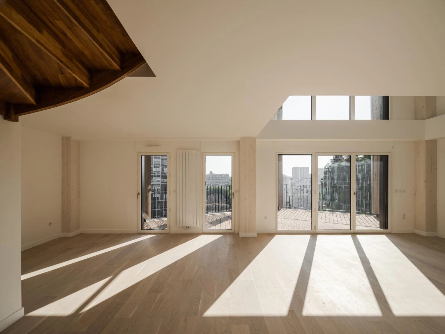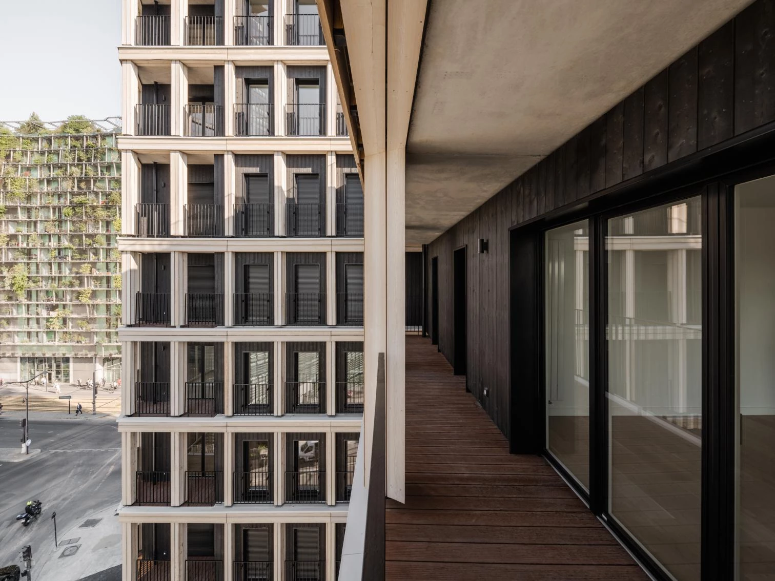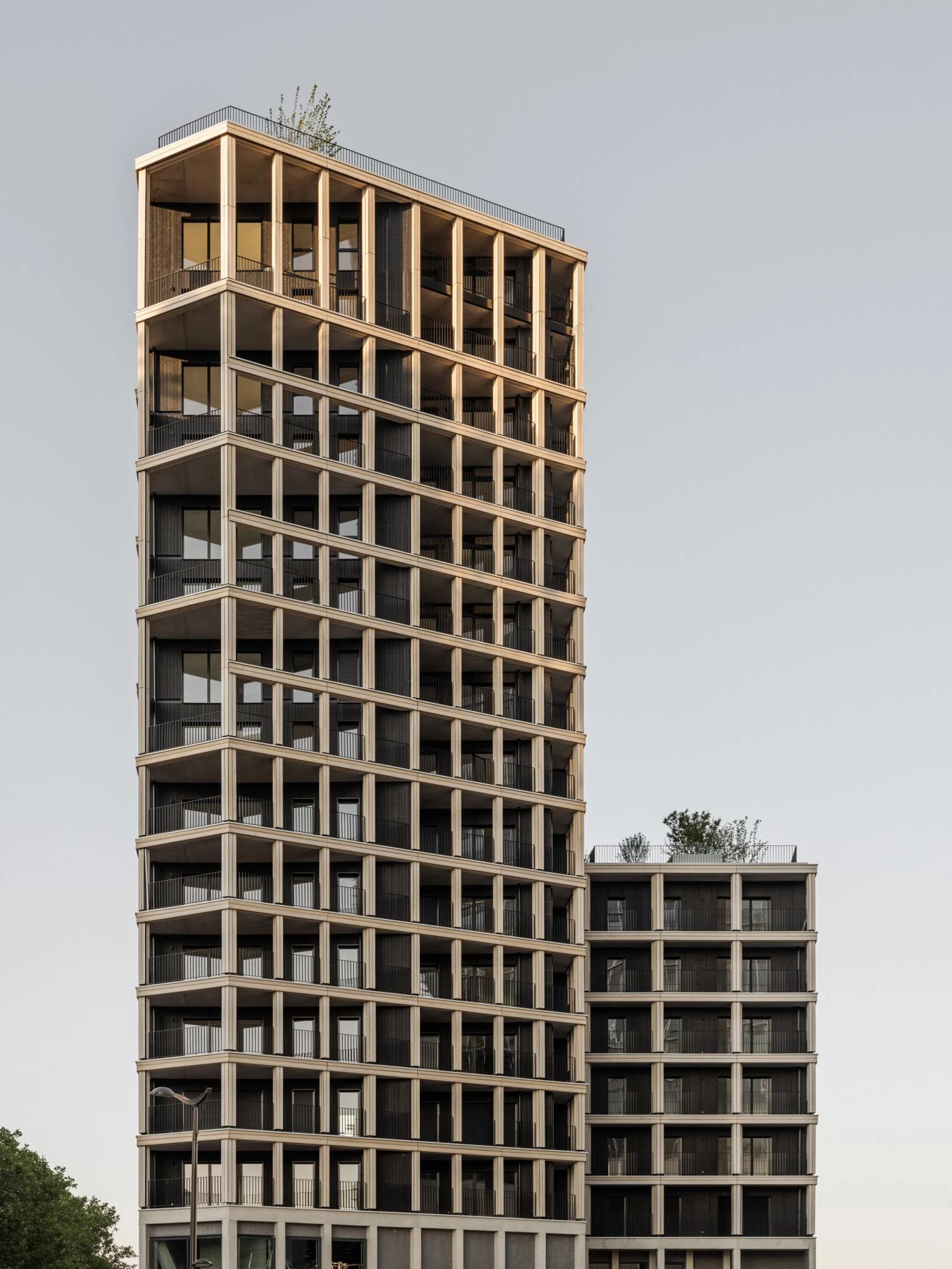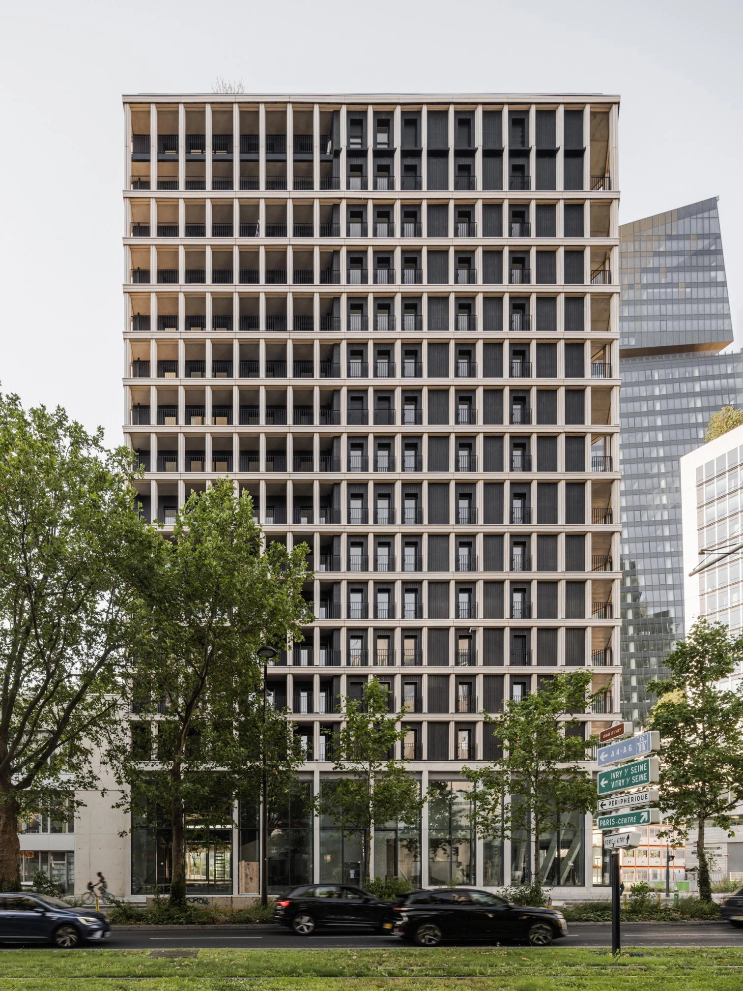 Moreau KusunokiSituado en el número 44 de la parisina Rue Jean-Baptiste Berlier, este conjunto de madera alcanza 50 metros de altura y está compuesto por dos volúmenes de 15 y 8 niveles para albergar 77 viviendas. Obra del estudio liderado por Nicolas Moreau y Hiroko Kusunoki, el edificio presenta una fachada reticular que enfatiza la verticalidad y el ritmo, equilibrando forma y función. El diseño está basado en el concepto de muro habitado, donde cada vivienda dispone de una terraza, que sirve de filtro para mantener distancia en el creciente entorno urbano densamente edificado. Se incorpora vegetación en las cubiertas y en la planta baja, donde un zócalo transparente se abre a la ciudad.