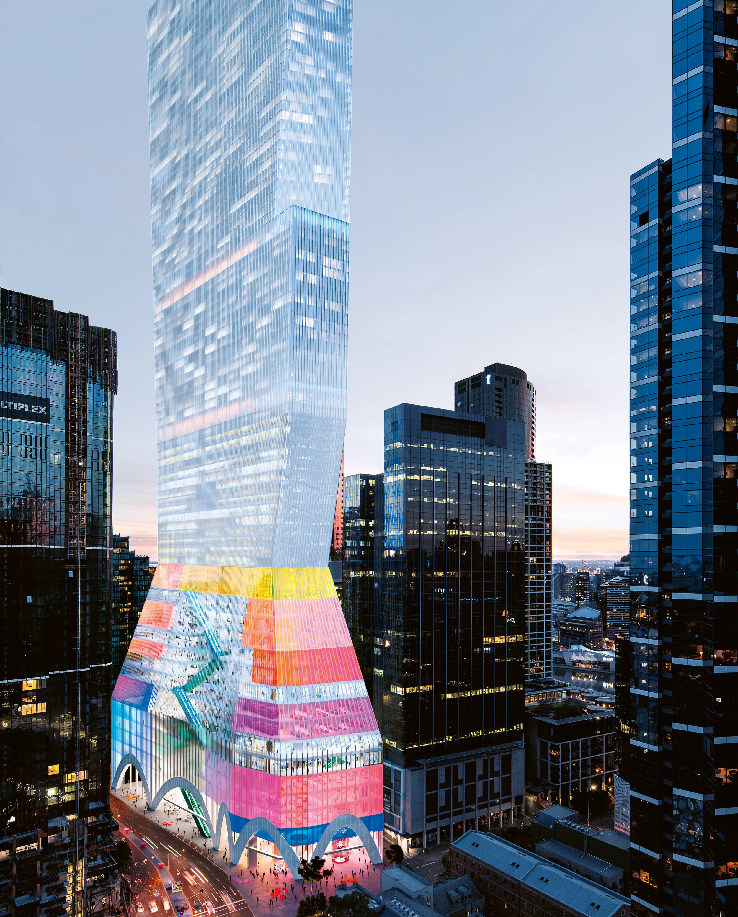 La base del edificio se concibe como una ciudad vertical abierta 24/7 que invita al público desde sus grandes arcadas. En la esquina entre Southbank y City Road se sitúa el BMW Experience Center, con un ascensor cilíndrico de vidrio para automóviles... [+]