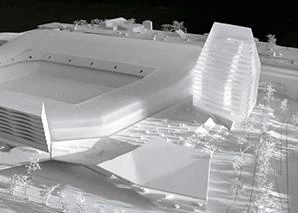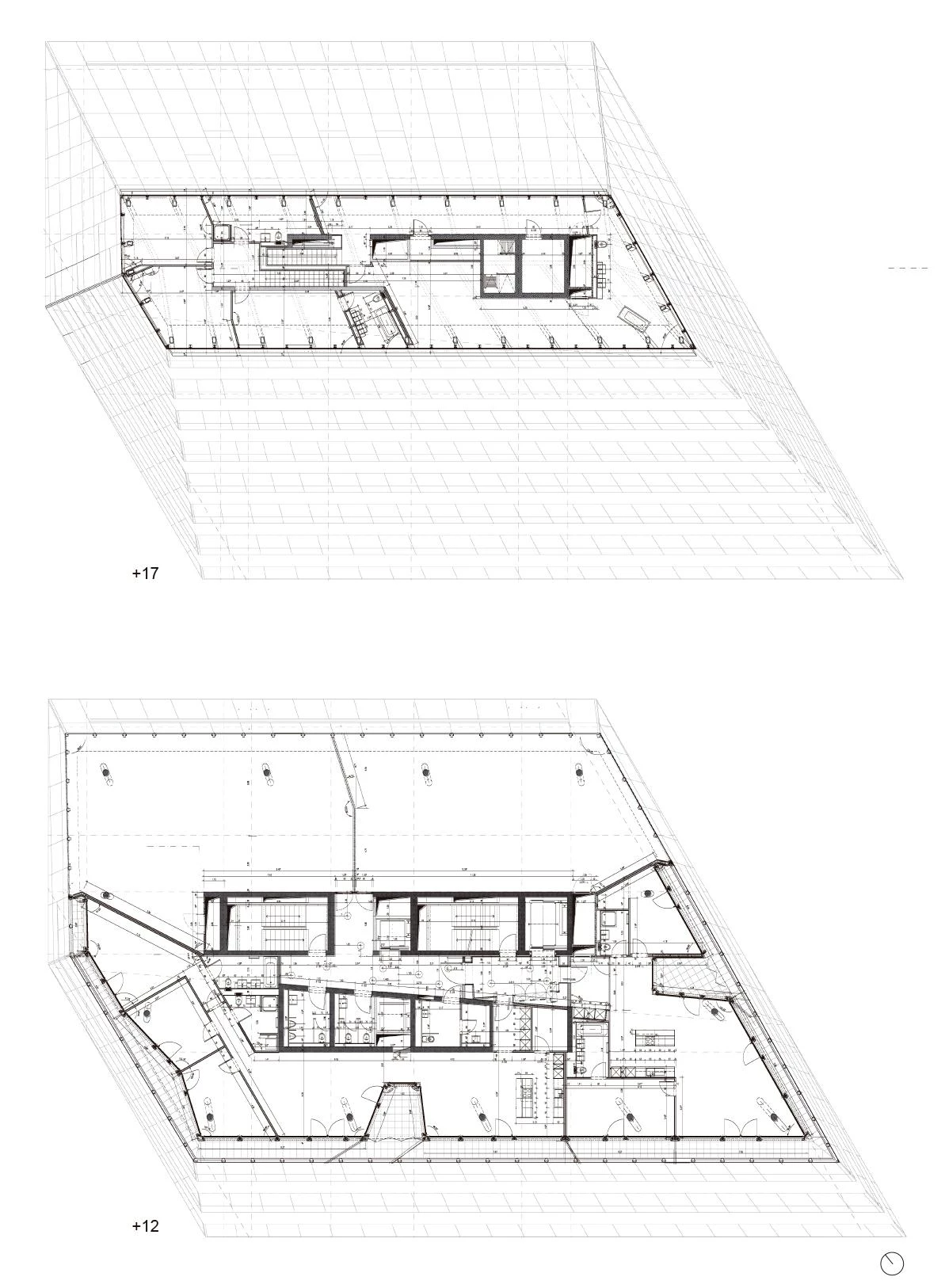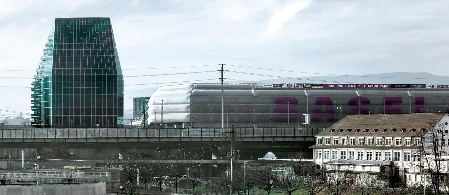 Situada en un extremo del conglomerado comercial, residencial y deportivo de St. Jakob Park, desarrollado en torno al estadio del equipo de fútbol local —y de cuyo diseño es en parte responsable el estudio Herzog & de Meuron—, la torre St. Jakob da la bienvenida a aquellos que se acercan a Basilea en tren o desde la autopista. Es, precisamente, esta condición de ‘puerta de entrada’ a la ciudad la que da sentido a su vocación de hito vertical, al que se contrapone la pieza horizontal y topográfica con el concesionario de Mercedes-Benz en el lado sur, y que completa la actuación. Así, el edificio del concesionario se encaja con precisión entre el basamento del St. Jakob Park y la ribera del cercano río Birs. Diseñado como una estructura abierta y transparente, sus forjados forman una superficie continua de tres niveles unidos mediante rampas, lo que también tiene un eco en la cubierta plegada del edificio. Entre la torre y el concesionario se ubica una plataforma elevada 6,10 metros con respecto al nivel perimetral del estadio, concebida como un espacio de circulación y de encuentro, un lugar para ver y ser visto donde también podrán desarrollarse futuros eventos al aire libre. Ubicada en el frente este del complejo, en dirección a la localidad cercana de Muttenz, la plataforma es un espacio público moldeado como una topografía artificial que facilita el acceso a las instalaciones deportivas y que suaviza la transición entre la zona urbanizada y la revitalizada ribera del Birs. La torre, por su parte, debe su forma a condicionantes ligados a su ubicación, su programa interno, los ejes visuales predominantes y las sombras que proyecta. Los apartamentos residenciales ocupan fundamentalmente la fachada sur y las plantas superiores, mientras que los espacios del lado norte se reservan para el sector servicios. En conjunto, la torre de 17 plantas puede leerse como un volumen cristalino rasgado por las líneas horizontales que marcan la presencia de las terrazas de los apartamentos. Sin embargo, tras la línea estricta formada por los antepechos de las terrazas, las viviendas presentan una fachada de vidrio de geometría quebrada, generando entrantes y salientes en planta que enriquecen y dirigen las vistas. La fachada norte y más cercana a las vías del tren y a la autopista se ha concebido, por el contrario, como una superficie continua por motivos acústicos. Constructivamente, la torre contiene un núcleo estructural y de servicios en el centro de su planta, así como pilares inclinados de acero alrededor de su perímetro. Una secuencia de forjados de hormigón armado completa la estructura del proyecto.