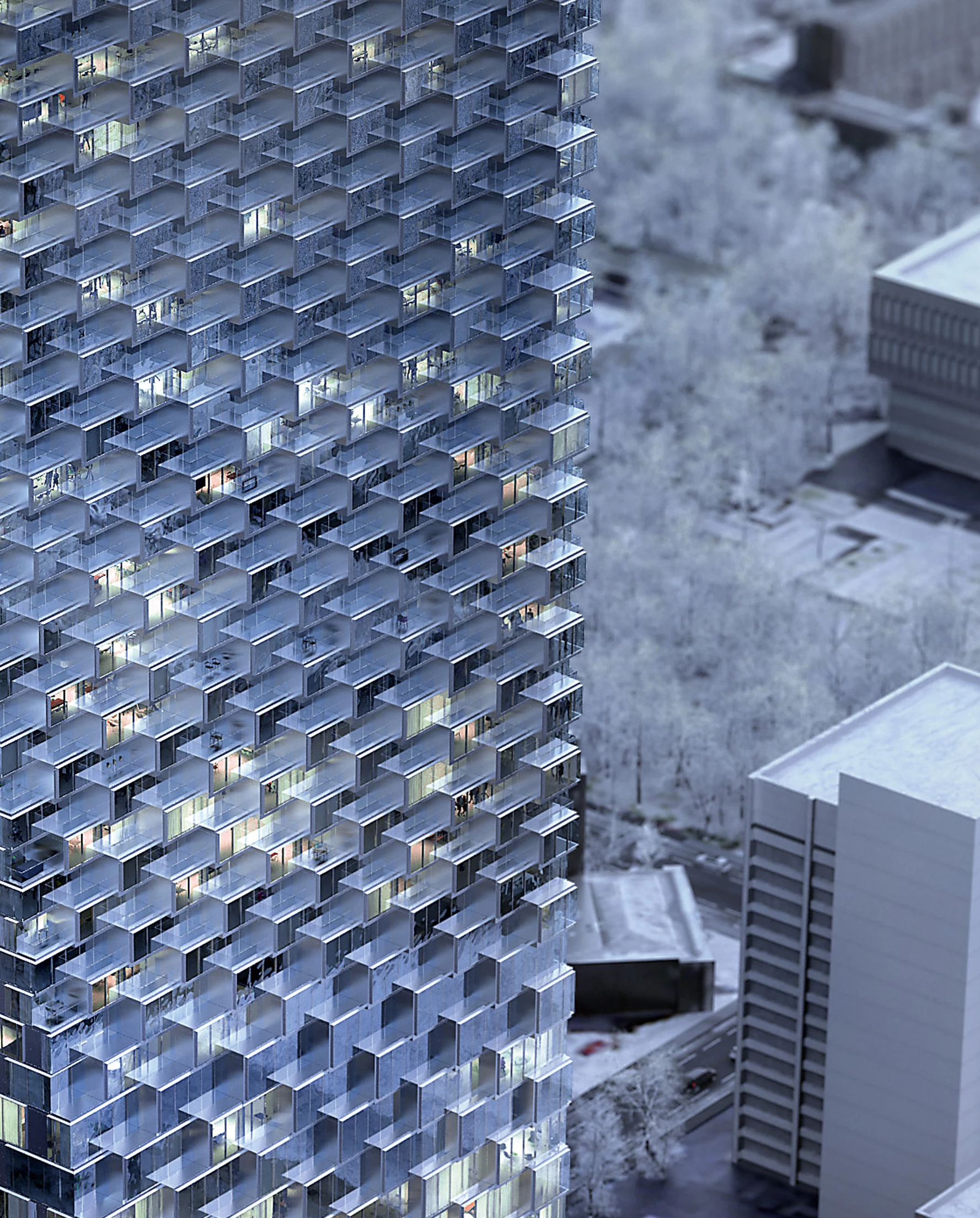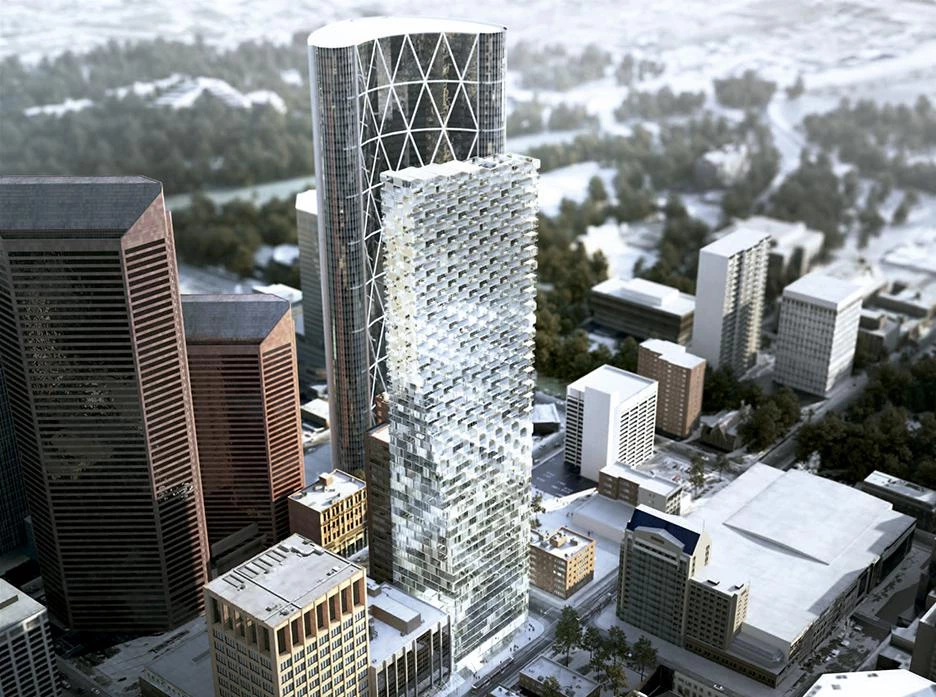 Con 227 metros de altura y 58 plantas, la torre Telus Sky será uno de los edificios más altos de la ciudad (sólo veinte metros más bajo que el edificio The Bow de Foster + Partners, situado en las inmediaciones). La torre reemplazará al existente centro de arte en la séptima avenida del centro de la ciudad e incluirá una galería dedicada a exponer trabajos de artistas locales que muestren la diversidad y creatividad cultural de la región. Además de la galería, el proyecto ofrecerá 40.000 metros cuadrados de oficinas, de los cuales 15.000 serán ocupados por la compañía de telecomunicaciones Telus, 1.400 por espacios comerciales; y 341 unidades residenciales en las plantas superiores. La textura de la fachada se desarrolla a partir de una piel lisa de vidrio que envuelve las oficinas y se va transformando a medida que asciende hasta convertirse en una composición tridimensional de balcones. La silueta resultante expresa en un solo gesto la unión de los dos programas principales: vivienda y oficina. Uno de los objetivos de la compañía Telus es señalar su compromiso con el medio ambiente, haciendo de la nueva sede un ejemplo de edificación energéticamente responsable que aspira a lograr la acreditación LEED platino, la certificación ambiental más alta.