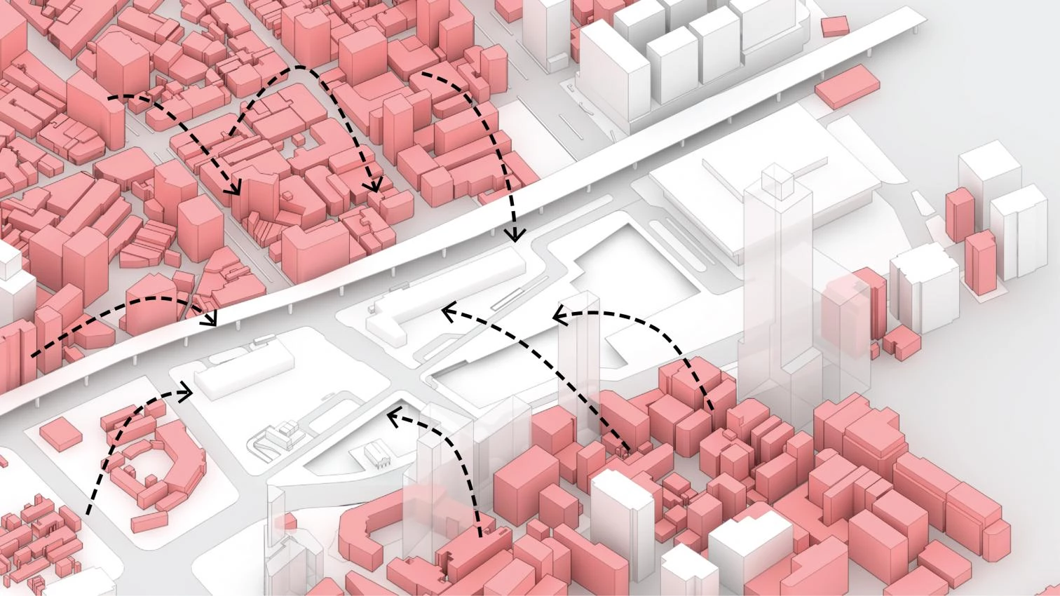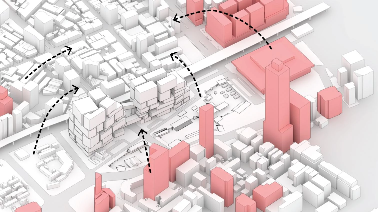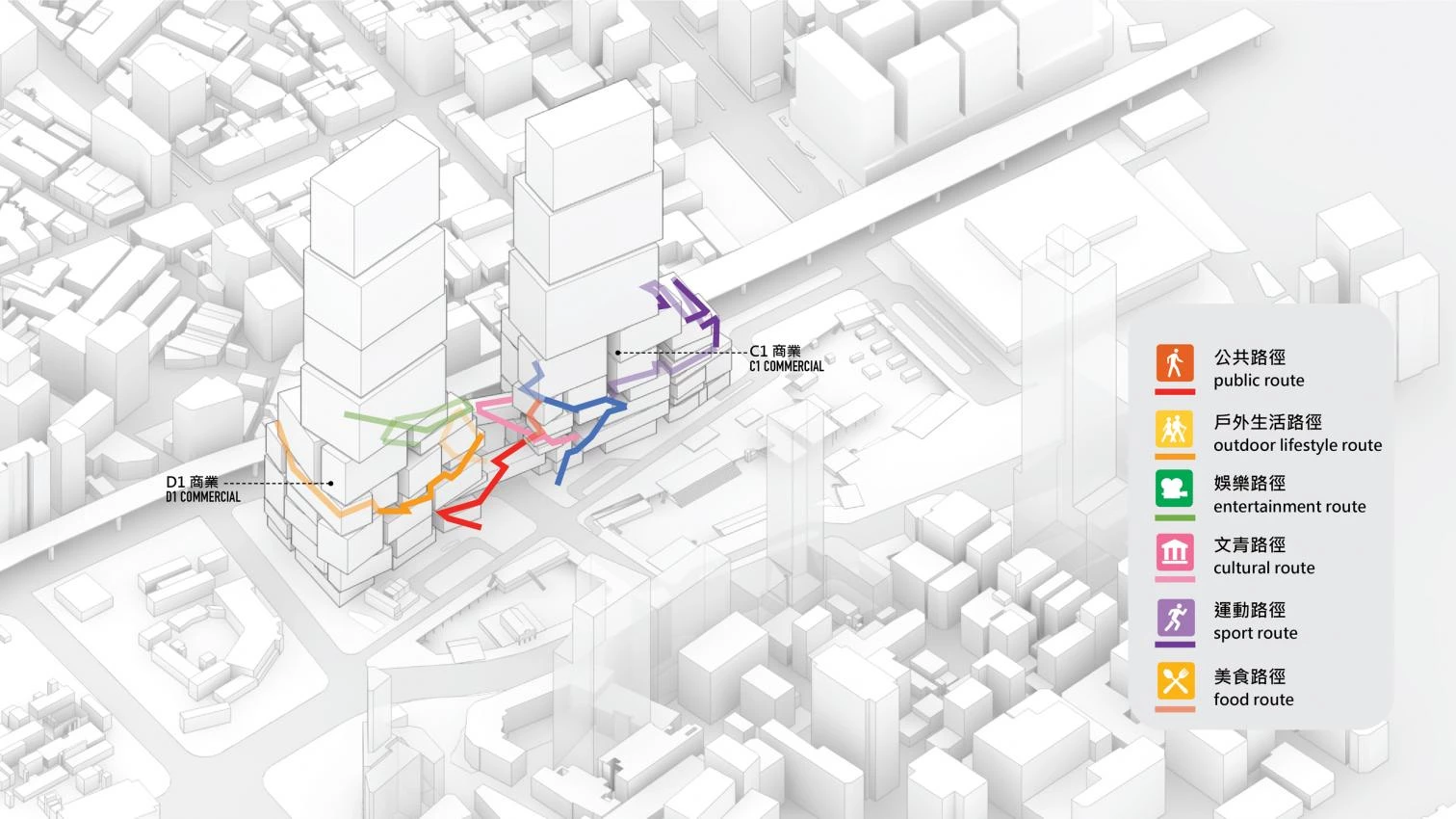 El diseño de la firma de Róterdam MVRDV busca revitalizar el área de la estación central de Taipéi, situada en el distrito de Zhongzheng. Sobre la estación existente se levantan las dos torres con 337 y 280 metros de altura, que combinan oficinas, dos hoteles, dos cines y tiendas. La composición fragmentada está formada por bloques envueltos con pantallas interactivas que aumentan su tamaño en su ascenso. De esta manera, las cajas inferiores destinadas a locales comerciales son más pequeñas y están organizadas alrededor de atrios para adaptarse a la escala de los edificios circundantes. En el exterior, las escaleras mecánicas y las pasarelas conectan los veinte pisos inferiores del apilamiento vertical y las terrazas cubiertas de vegetación que coronan los volúmenes comerciales.La intervención contempla además la remodelación de las plazas existentes. En el proyecto de MVRDV colaboran además CHY Architecture Urban Landscape, Topotek 1, Envision Engineering, ARUP, RWDI y Mercury Fire Engineering Consulting.