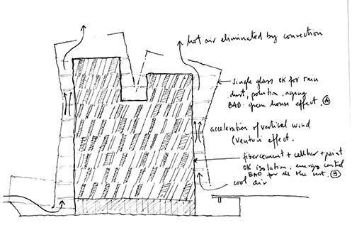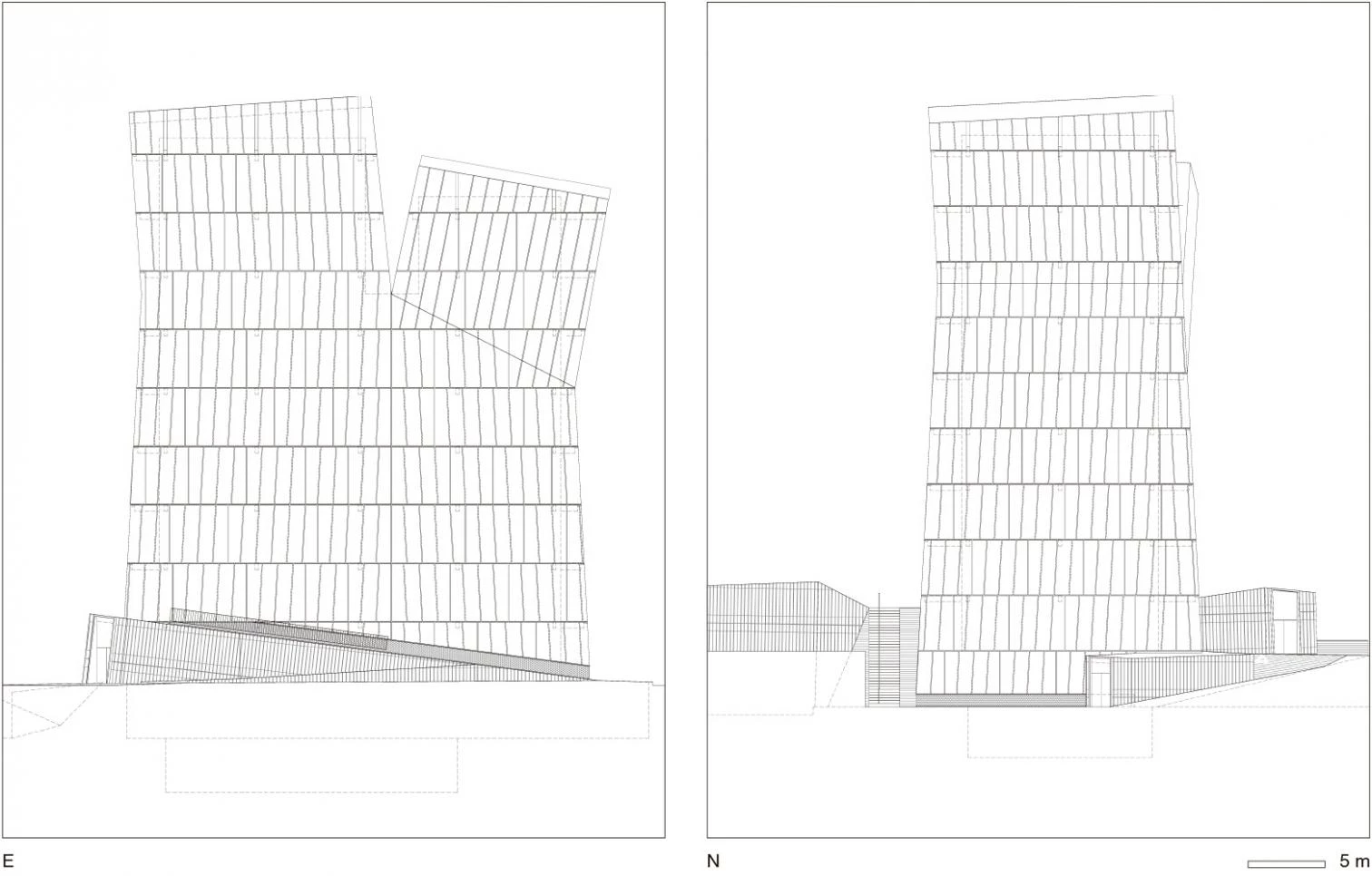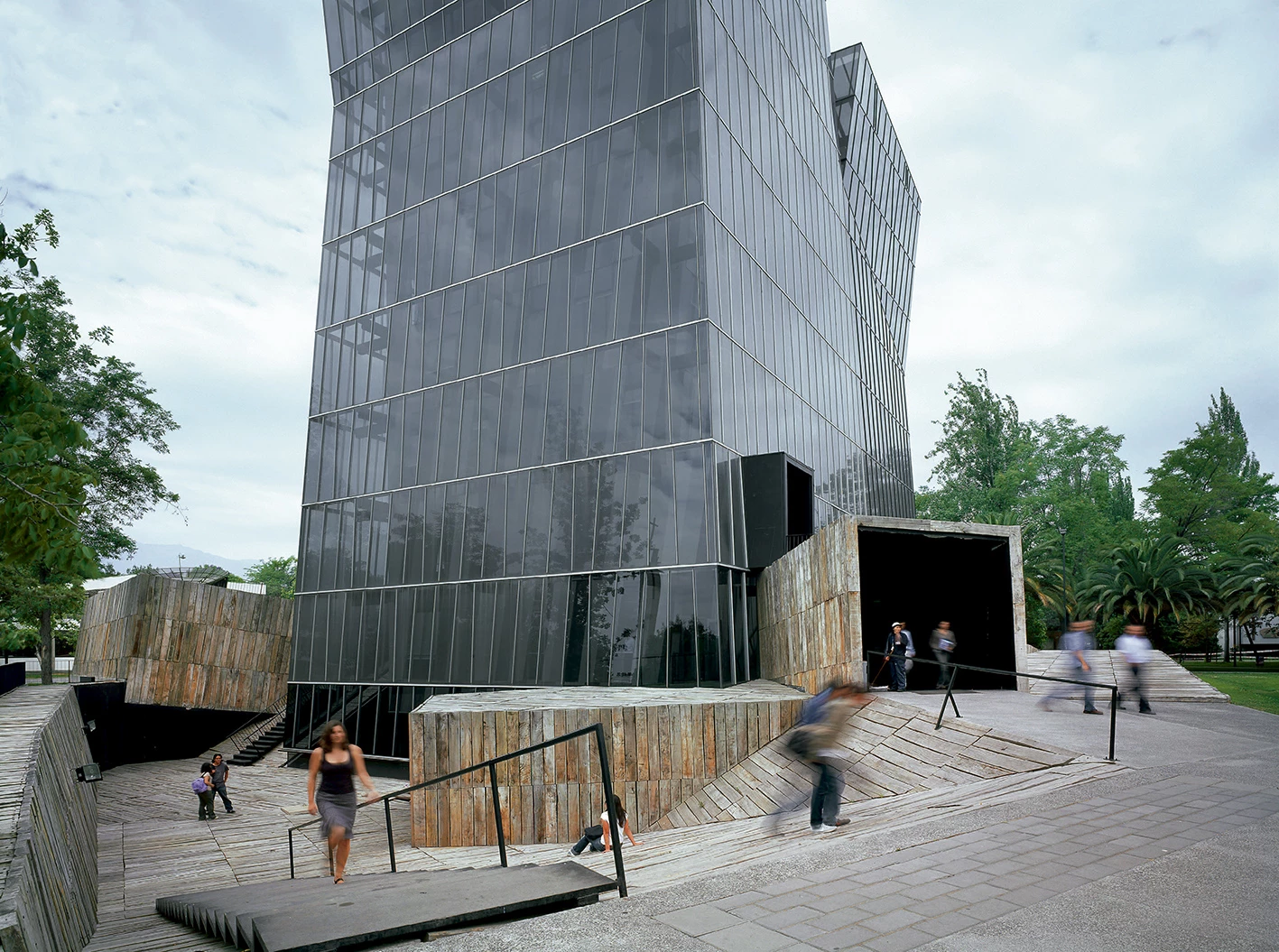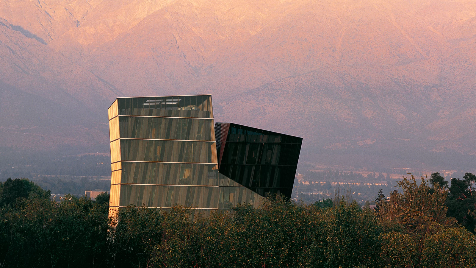 Las Torres Siamesas de Santiago nacen como un encargo de la Universidad Católica para albergar todos sus equipos informáticos y salas relacionadas en una torre de vidrio que tuviese una presencia tecnológica. El proyecto reflexiona sobre la integración de las nuevas tecnologías en la enseñanza, y ofrece espacios diversos para fomentar el aprendizaje: una base formada por un relieve de planos inclinados de madera para las charlas informales, o salas de estudio y trabajo informático donde la clásica iluminación fuerte se transforma en una penumbra que evita los reflejos sobre las pantallas. La piel de vidrio supone un problema para el clima de Santiago, ya que exige hacerse cargo del efecto invernadero que se crea en el interior. La solución empleada consiste en una doble piel, cuya capa exterior está formada por vidrio sencillo (malo para el control energético pero duradero y bueno para uso exterior), y una interior de fibrocemento (con cualidades inversas). Esta especialización resulta menos costosa, y permite introducir entre ambas una cámara de aire que funciona naturalmente como chimenea perimetral para eliminar el calor, generando succión por efecto Venturi. La forma bicéfala de la torre potencia este efecto, y además estiliza sus proporciones consiguiendo que parezca una torre más esbelta.