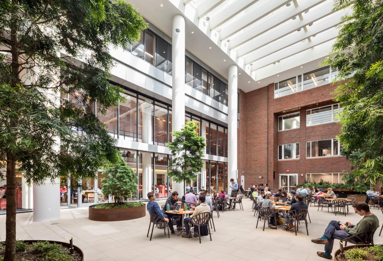 Los volúmenes añadidos presentan fachadas transparentes de vidrio que permiten el acceso de luz natural al interior y muestran su actividad, abriéndose a la calle y a un nuevo patio central ajardinado, alrededor del cual se organizan los elementos del programa. La transformación incluye una nueva entrada al campus, oficinas, espacios comunes y de reunión, un comedor, aulas, y una circulación interna continua entre los edificios.