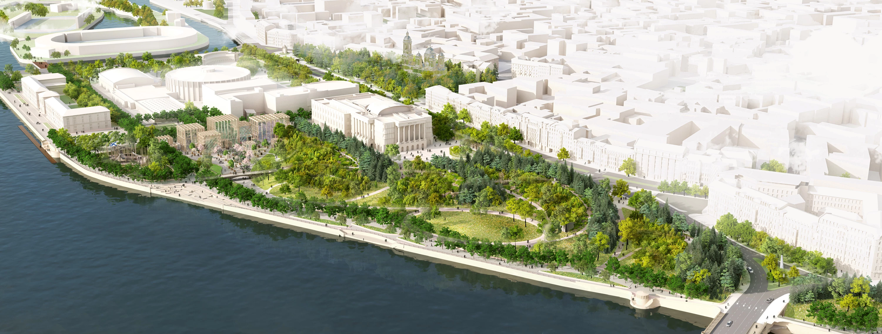La vegetación dispuesta en diferentes zonas ecológicas atiende a las estaciones del año. Se incluyen distintos elementos programáticos —un teatro flotante, un laberinto, una pradera multifuncional, etc—. Un anillo verde unirá puntos importantes de la ciudad...