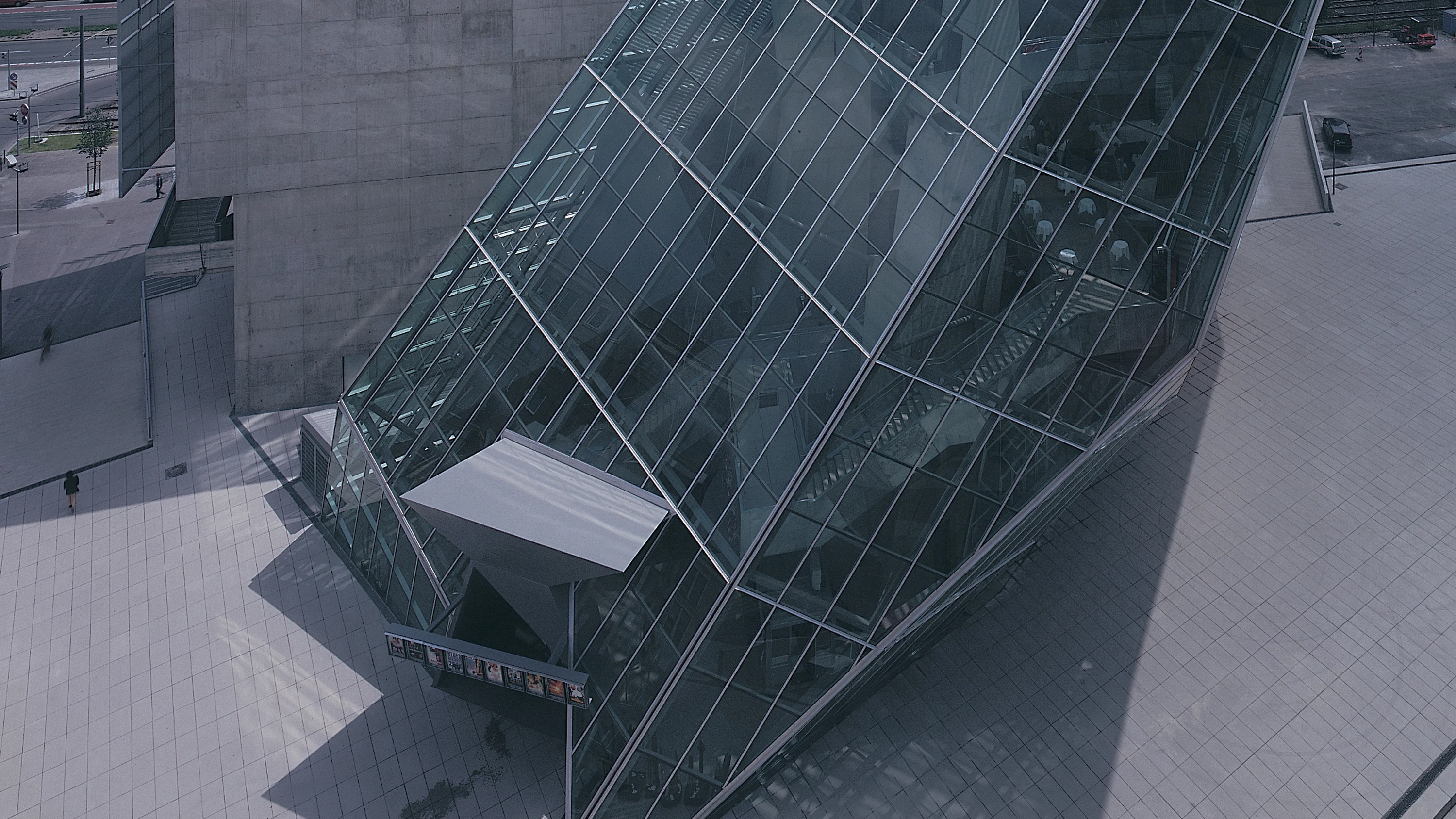 El nuevo edificio está formado por dos partes conectadas entre sí. Una pastilla ortogonal aloja ocho salas de cine con asientos para 2.600 personas. Cuatro de las salas más pequeñas están situadas bajo tierra, mientras que las cuatro restantes se albergan, encajadas entre ellas como cuñas, en una pastilla de seis alturas. Pegado al flanco noroeste de esta especie de búnker se presenta un volumen cristalino y sesgado que sirve de vestíbulo a todas las salas. Las escaleras de incendios descienden en cascada a todo lo largo del costado del bloque, mientras que la estructura del vestíbulo se retuerce en una serie de inusitadas contorsiones generadas por ordenador. El áspero hormigón visto del bloque de salas lo convierte en un contrapunto denso y terrenal al dinamismo y la ligereza del vestíbulo. Sin embargo, parece que la calidad casi de cuarzo de la maqueta original no se ha traducido plenamente en el edificio terminado. Lo que prevalece es, por el contrario, una suerte de austeridad industrial que confiere al cine la apariencia de una fábrica derruida o de una plataforma petrolífera parcialmente desmontada.