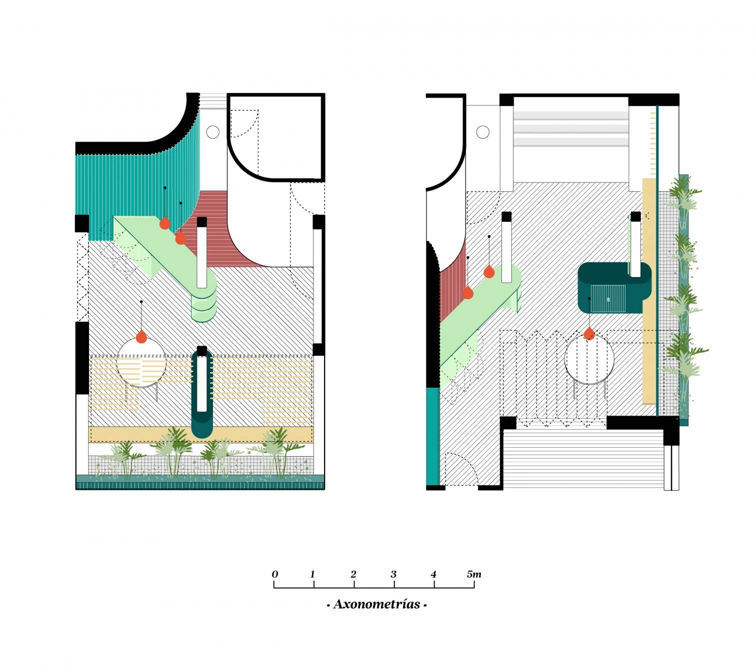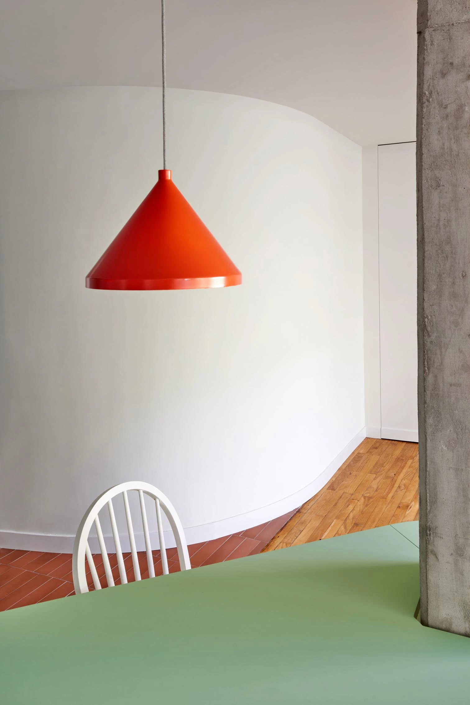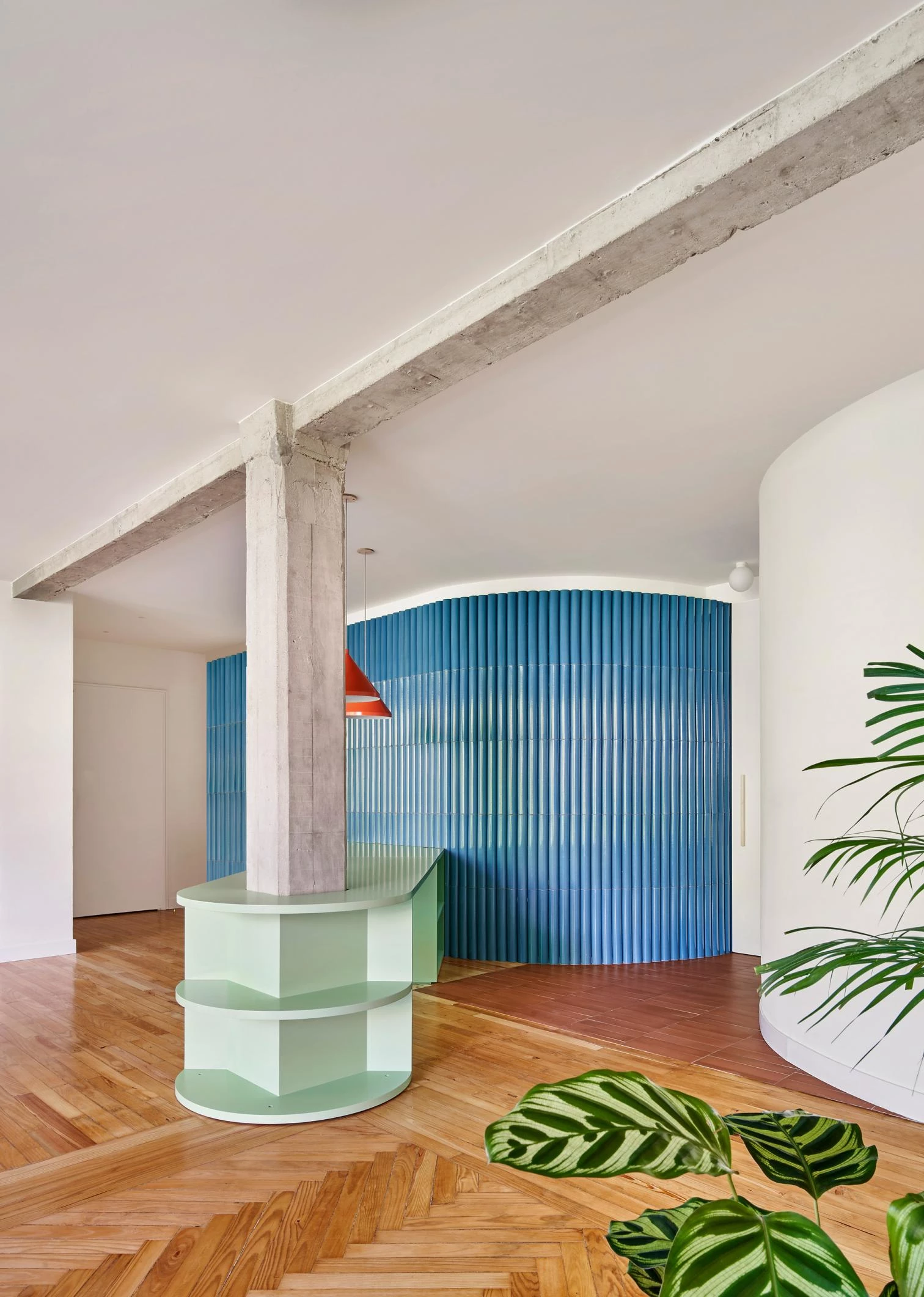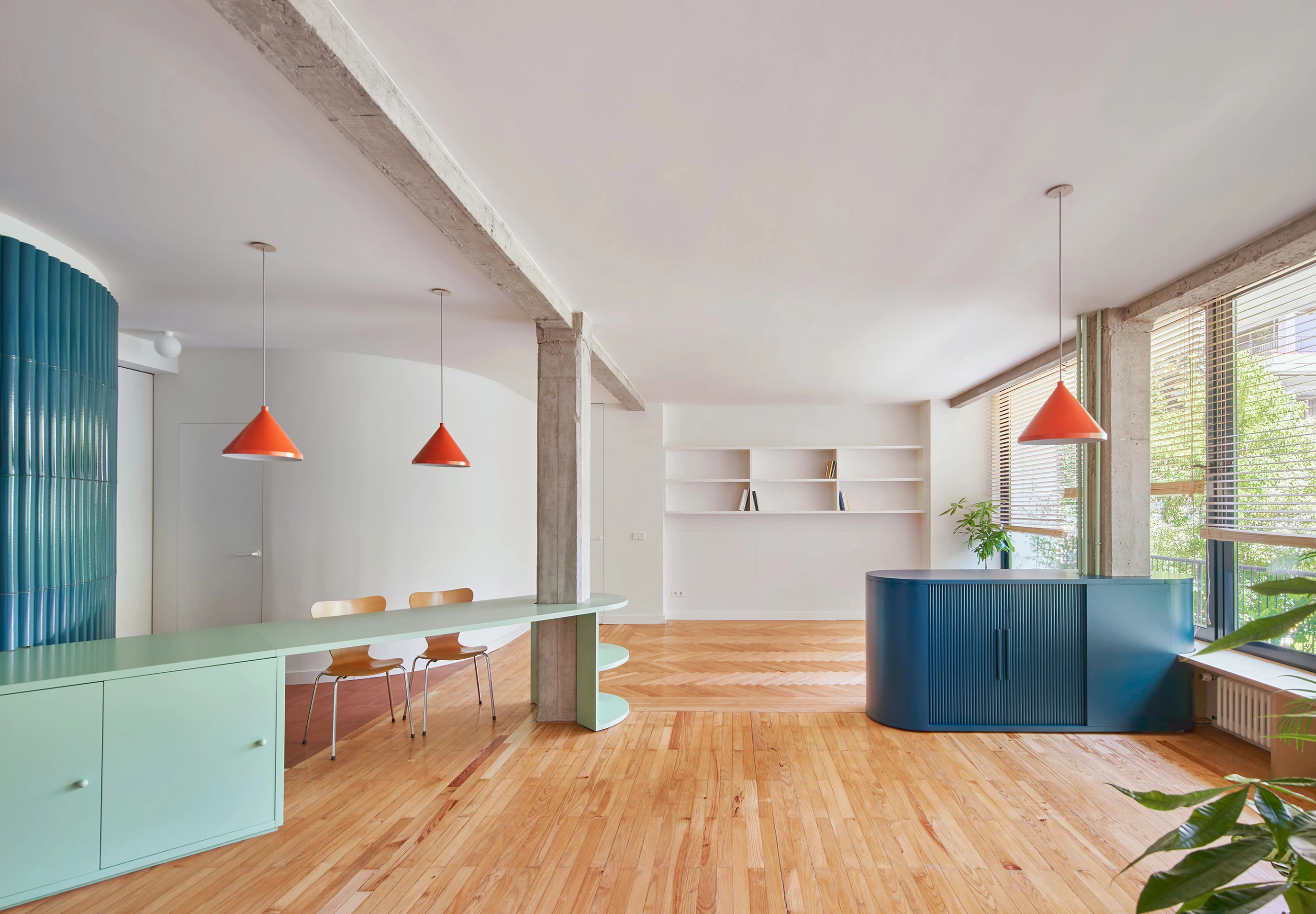 El proyecto unifica las numerosas compartimentaciones de las zonas comunes existentes, recuperando la terraza-balcón y el muro curvo de la escalera que se reviste con grandes piezas cerámicas curvas fabricadas artesanalmente. Una vez despojado el inmueble de tabiques, la estructura y los tubos de calefacción quedan a la vista. El mobiliario realizado a medida y artesanalmente configura las domesticidades. El amplio ámbito colectivo de la vivienda permite realizar distintas actividades a través de dos arquitecturas-mueble que abrazan los pilares de hormigón, sirviendo de punto de partida desde el que crece toda la intervención.