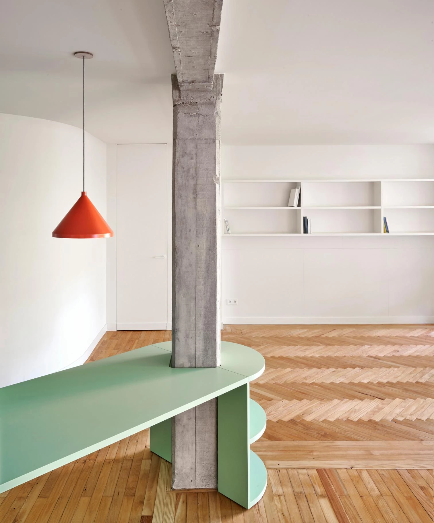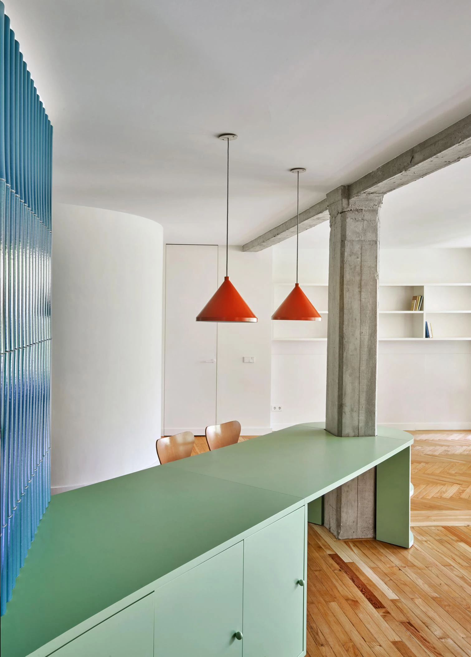 El primer mueble-pilar de 4 metros de longitud articula el espacio de entrada a la vivienda a través de un giro. Este mueble con tres cajones es una mesa, una alacena y una pequeña biblioteca. Frente a él, un segundo mueble-pilar sirve de filtro entre el salón y el comedor, albergando un minibar y una televisión oculta. En el desarrollo de esta pieza, Emilio, un carpintero local, investiga la técnica aplicada en las puertas de persiana que solía utilizar su abuelo para fabricar los antiguos bureaus de la década de 1920. Ahora esta técnica se aplica aquí en vertical en vez de horizontal.