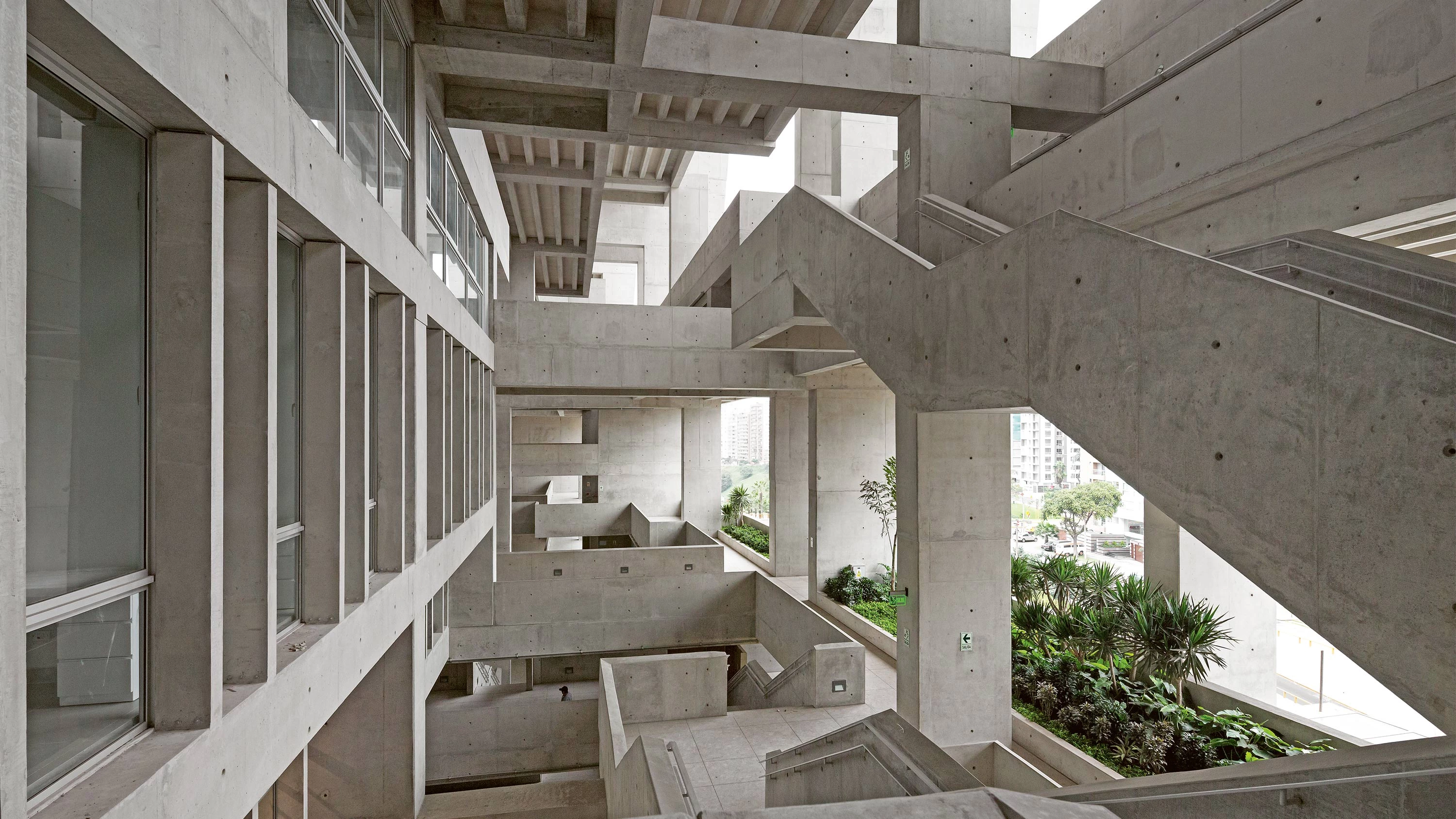 Los acantilados de cuarenta metros de altura que definen la relación de la ciudad de Lima con el océano Pacífico fueron el punto de partida de este proyecto. El edificio se concibe como un ‘acantilado’ que continúa el borde del mar, una nueva geografía hecha por la humanidad. Esta estrategia fundamental dota a la institución de una identidad rotunda y reconocible, protege el interior de la autopista situada en el límite norte de la parcela y determina la organización del programa en una secuencia vertical, desafiando así el tipo convencional de los campus universitarios. Mientras que la cara norte actúa como un acantilado o muro, la cara sur desciende de forma escalonada hacia el barrio residencial de Barranco. En cuanto al programa, los volúmenes más grandes de laboratorios se disponen en los niveles inferiores; las aulas, de tamaño decreciente se apilan verticalmente; las plantas superiores acogen las oficinas y despachos para profesores. El conjunto se corona con la biblioteca, envuelta por una logia perimetral con vistas panorámicas de la ciudad y del mar. Para fomentar la interacción social entre los estudiantes, todas circulaciones permanecen expuestas a la brisa marina ya que, gracias a su localización y a la influencia de las corrientes, las temperaturas se mantienen en el rango de los veinte grados todo el año.