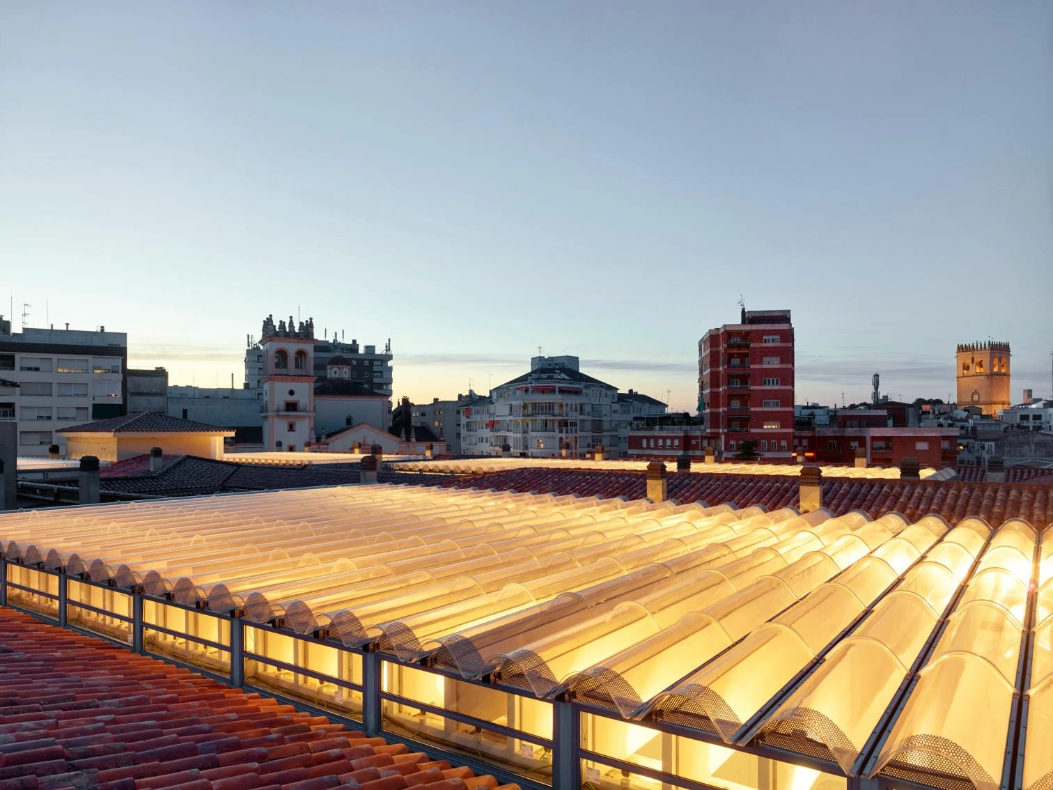 Paneles curvos de metacrilato conforman los cerramientos horizontales que cubren los patios, lo que hace posible su aprovechamiento para albergar usos de forma ininterrumpida a lo largo de todo el año.