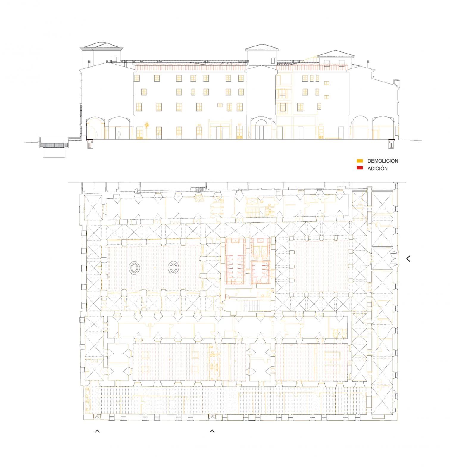 La planta baja se concibe como un gran intercambiador urbano, un espacio devuelto a la ciudad que integra programas heterogéneos y dinámicos, a los que se accede por las distintas fachadas. La cubrición de los patios permite su uso ininterrumpido todo el año. Las plantas superiores albergan usos igualmente públicos, pero estructurados en un gradiente progresivo de privacidad y silencio. Las plantas primera y segunda albergan la Biblioteca, el Archivo Provincial y la Escuela Oficial de Idiomas. Estos programas se zonifican según la propia división estructural del edificio. Se saca partido de la configuración compartimentada y fragmentaria que imponen los muros de carga para generar una colección de espacios de pequeño y medio tamaño, acogedores y humanizados. La planta tercera alberga salas de coworking. Se propone este programa por su fuerte carácter asociativo y su capacidad de dinamizar otros usos relacionados.