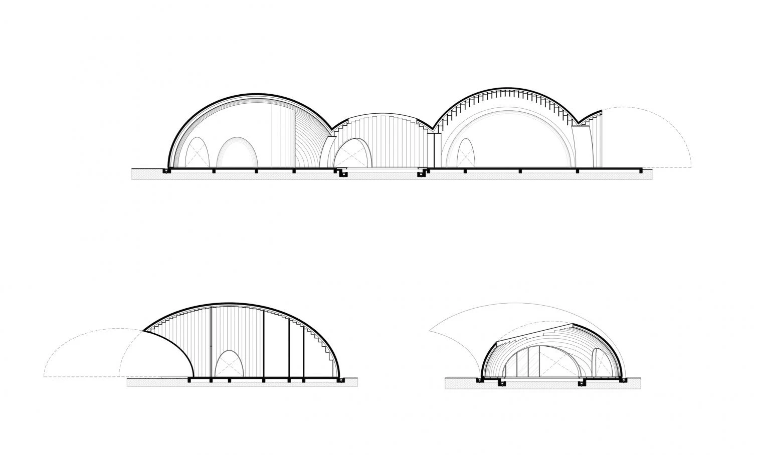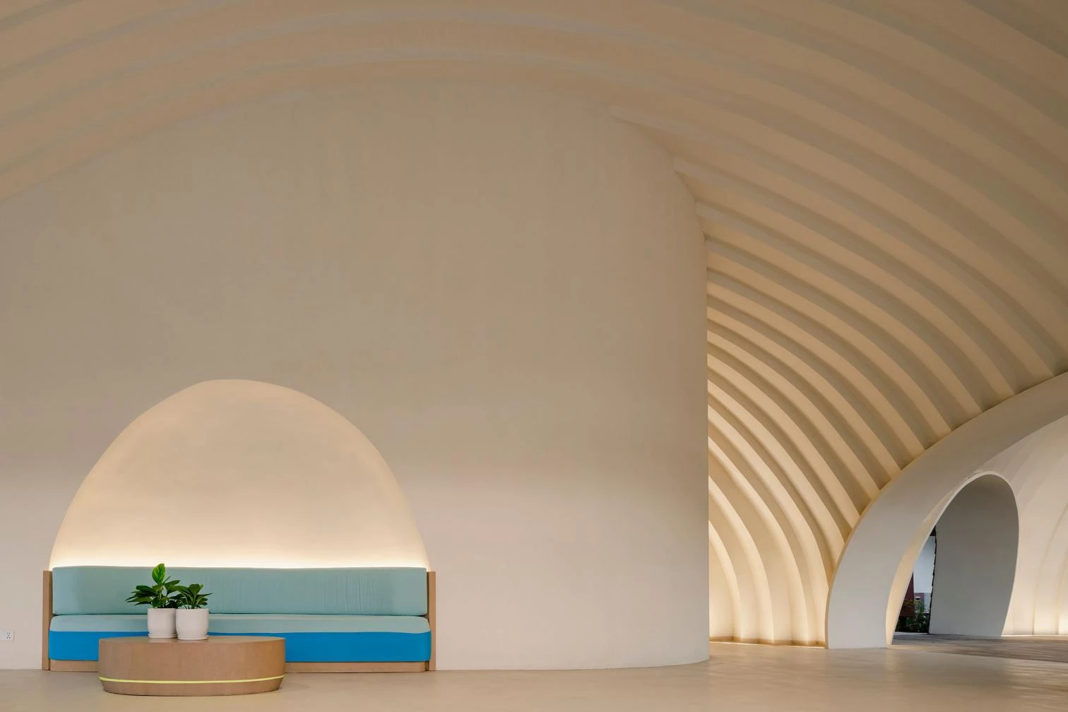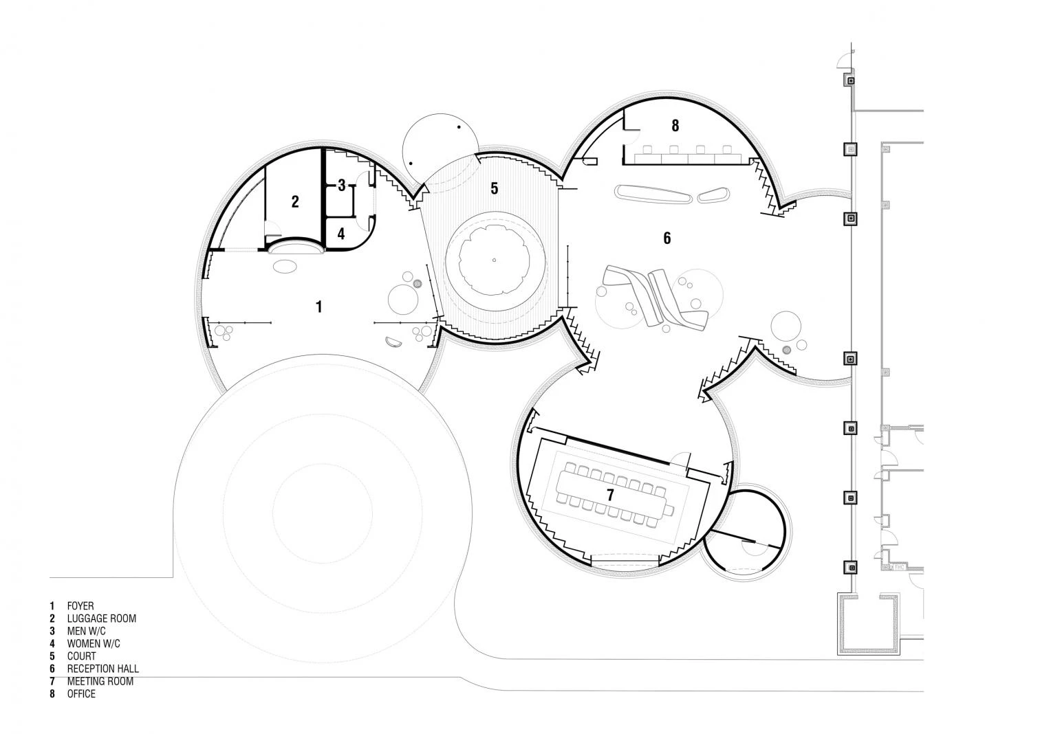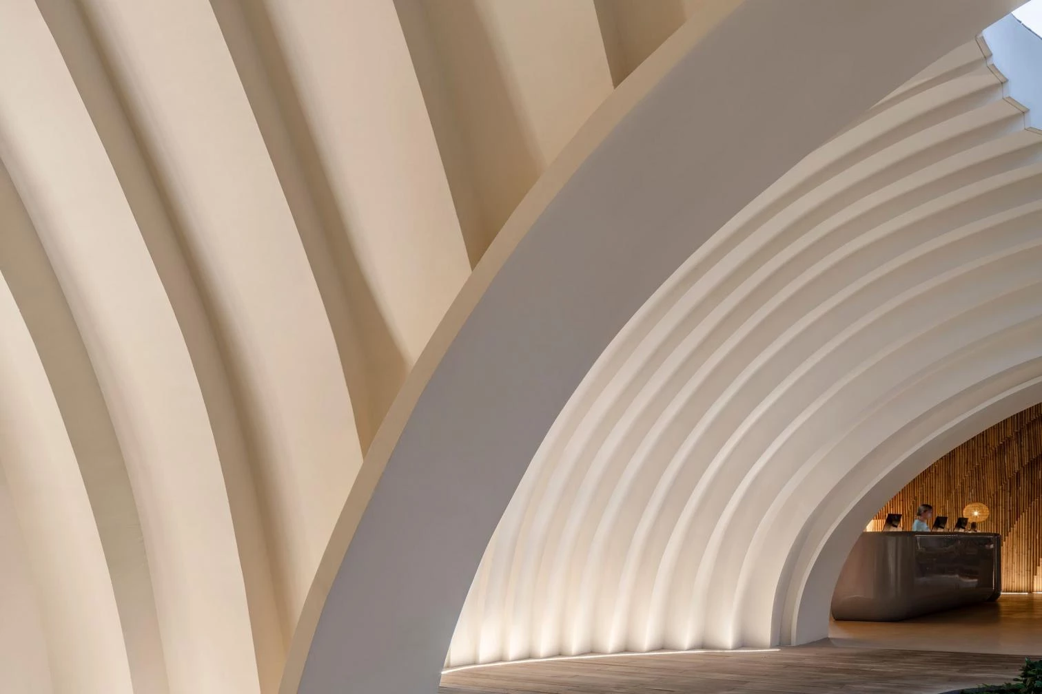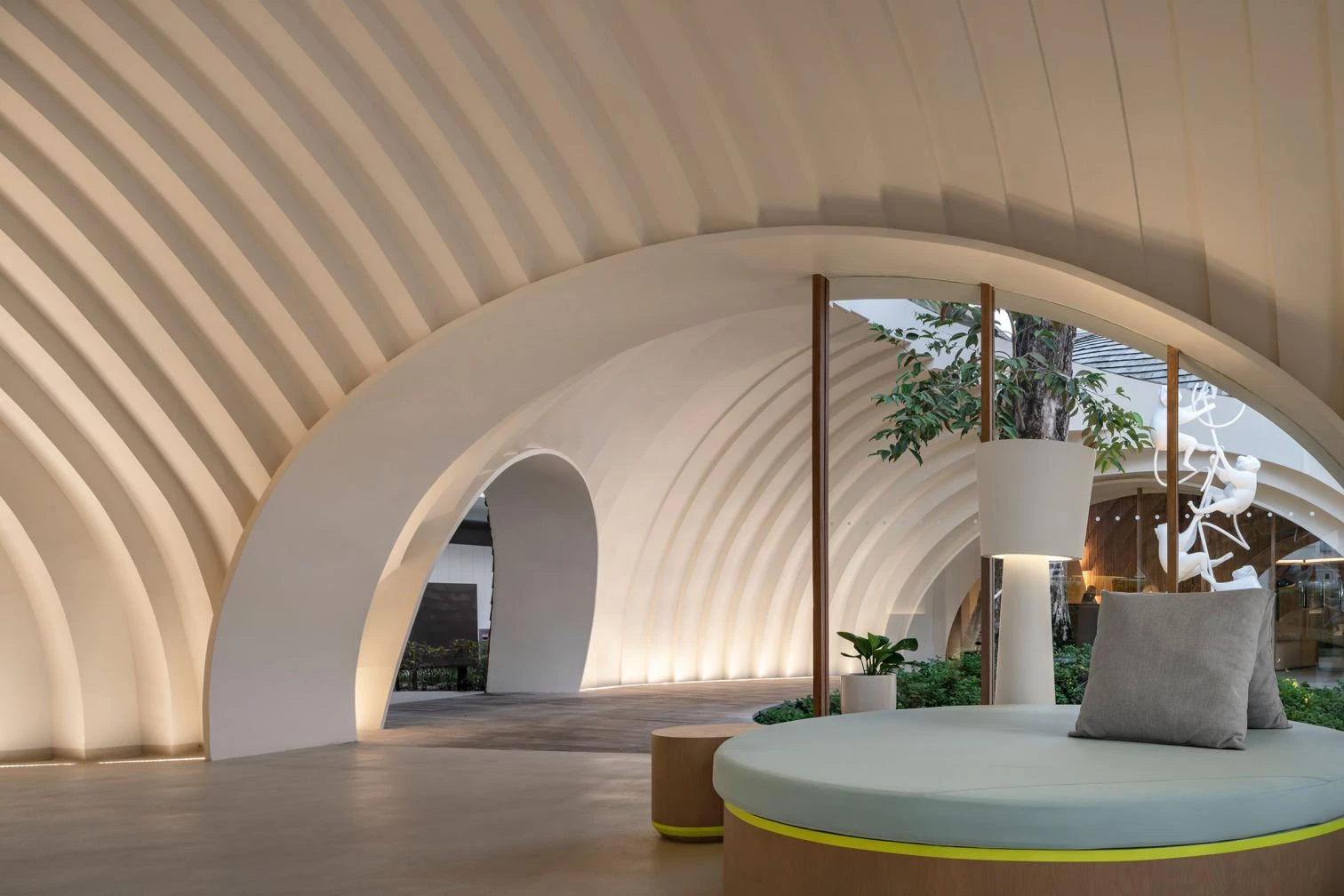 Inspirados en la cáscara del coco, los pabellones entrelazados están cubiertos con piezas de madera. Considerando las condiciones existentes en el emplazamiento, los volúmenes se orientan sobre el eje principal que mira al mar en dirección noreste. En el recorrido lineal se encuentra un gran ciruelo delimitado por geometrías esféricas.