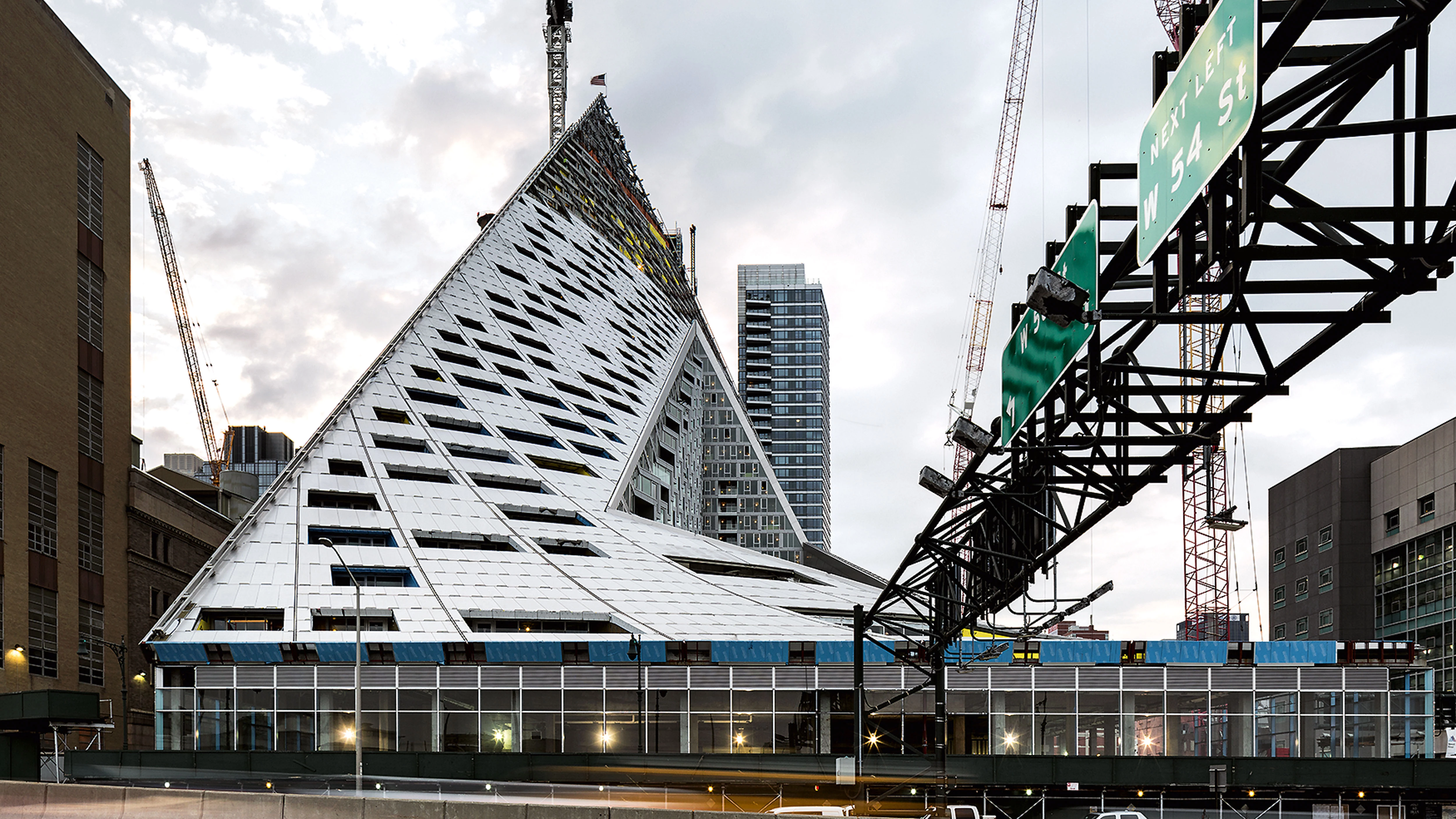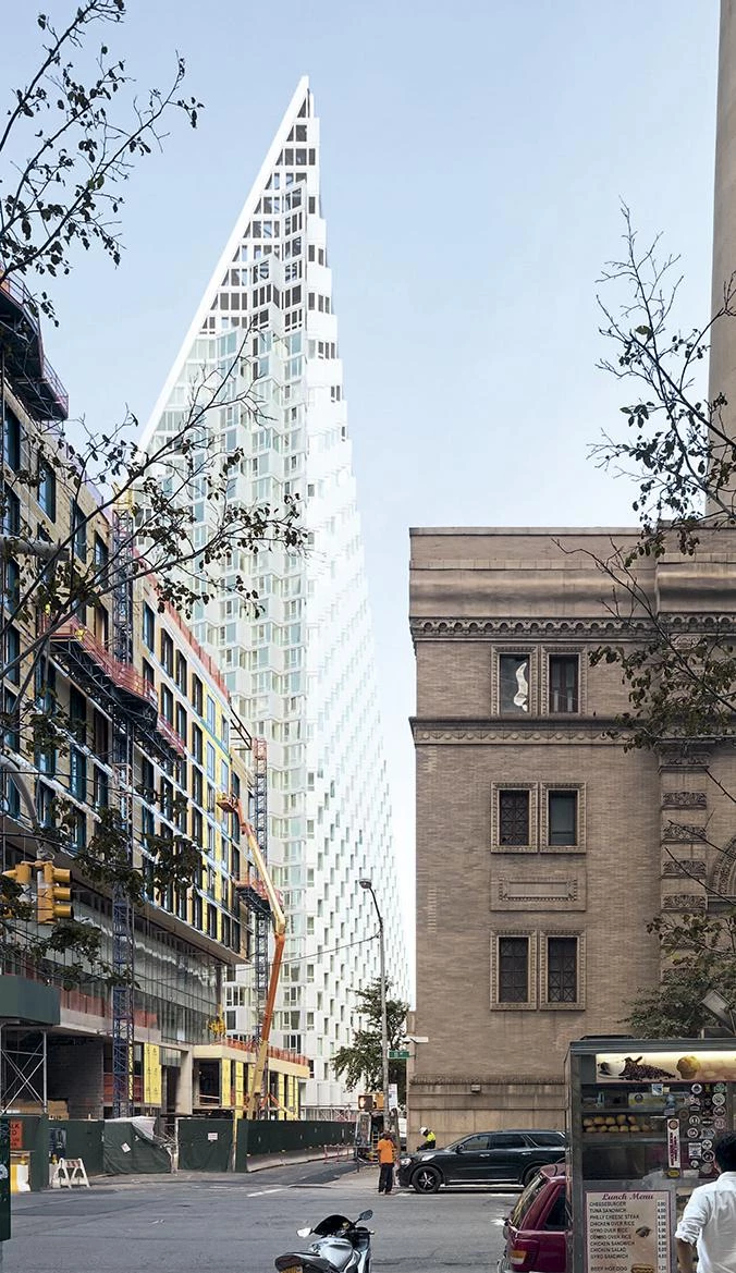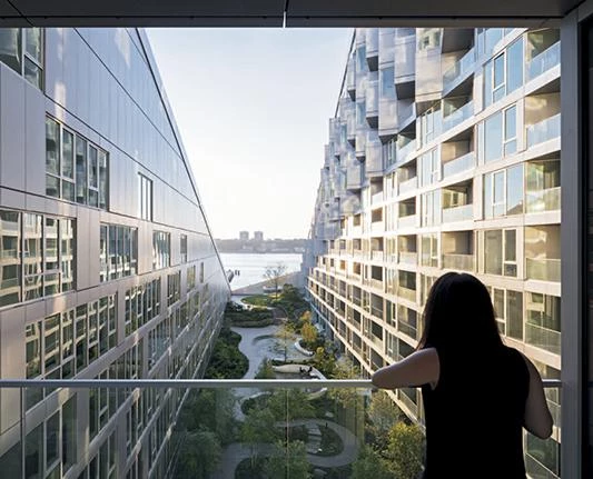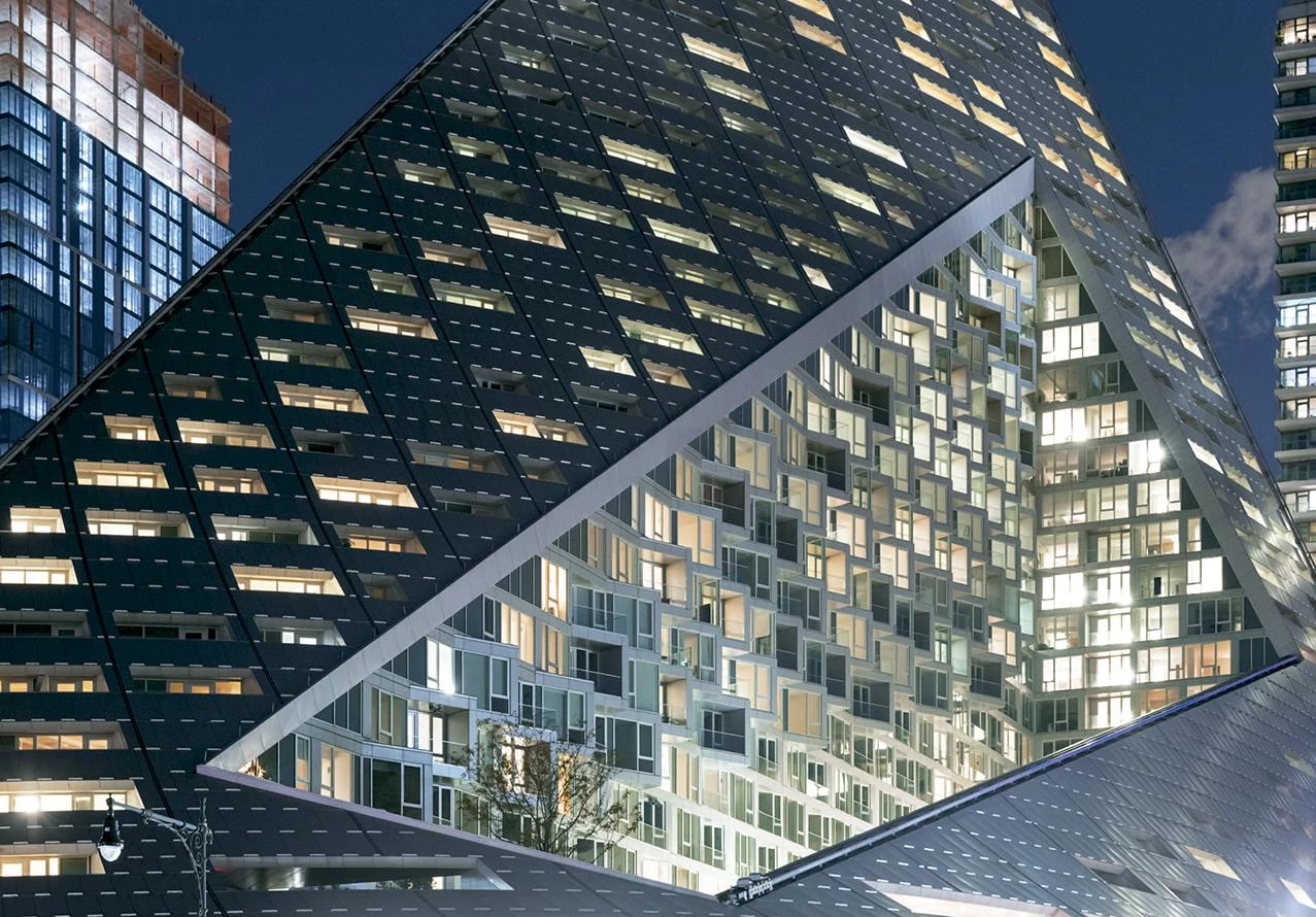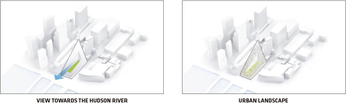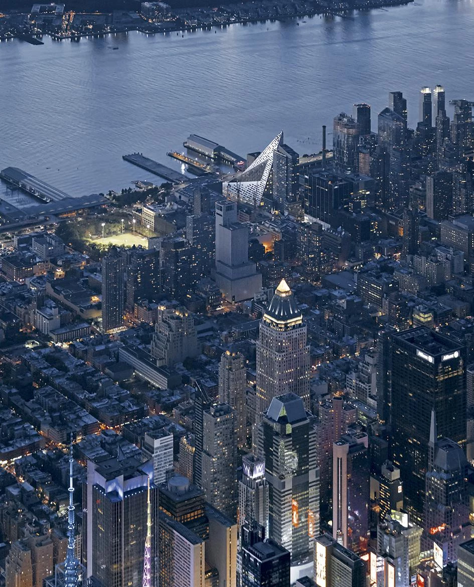 A orillas del río Hudson, el número 625 de la West 57th Street se plantea como un híbrido entre un bloque perimetral europeo y un rascacielos neoyorquino. Gracias a su alzado triangular, el proyecto combina las ventajas de ambos: la compacidad del patio proporciona densidad, intimidad y seguridad, al tiempo que se conservan las amplias vistas y la ligereza propias de una torre. Manteniendo tres de las esquinas del bloque a ras de suelo y elevando la cuarta a una altura de 142 metros, se consigue una potente conexión visual del patio con el río, a la vez que se permite la entrada de luz natural al interior del edificio. La llamativa cubierta en pendiente consiste en una superficie reglada que se perfora con terrazas de distinto tamaño, todas ellas orientadas al Sur. Cada apartamento cuenta con una ventana en voladizo que permite aumentar la entrada de luz natural y conseguir vistas sobre el río. Además, todas las viviendas están provistas de uno o varios balcones que promueven la interacción entre los habitantes del inmueble y los transeúntes.