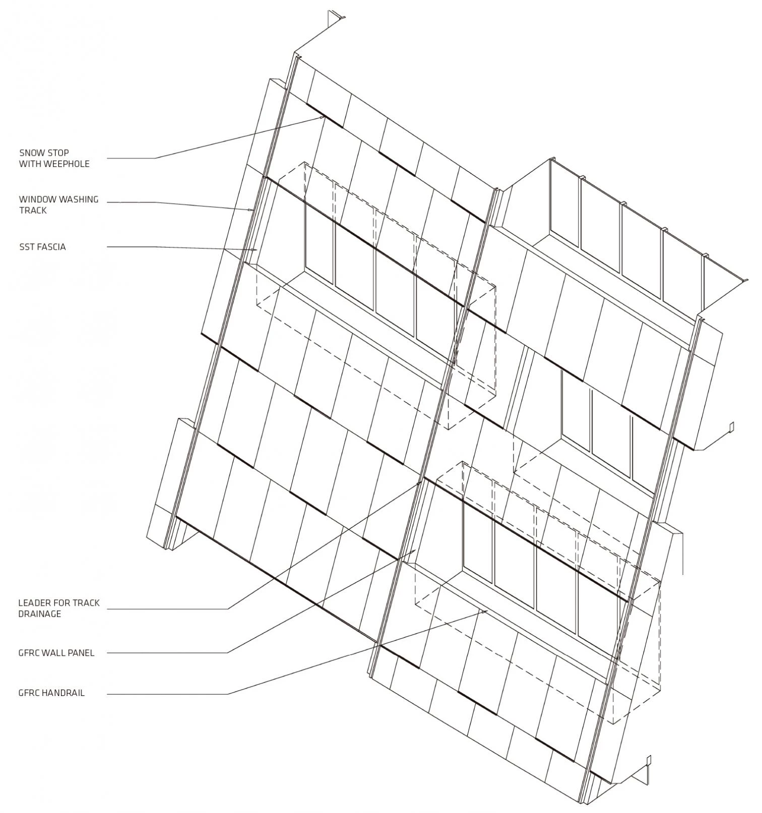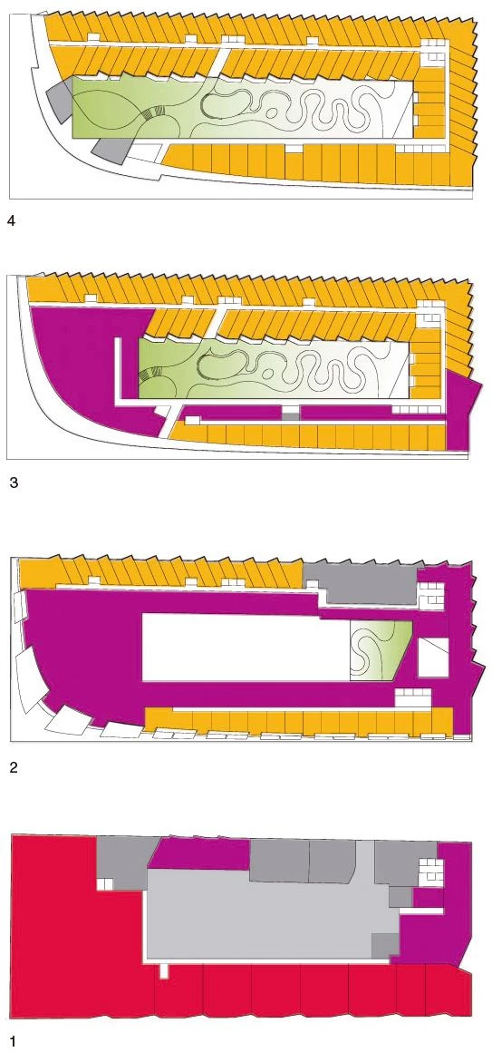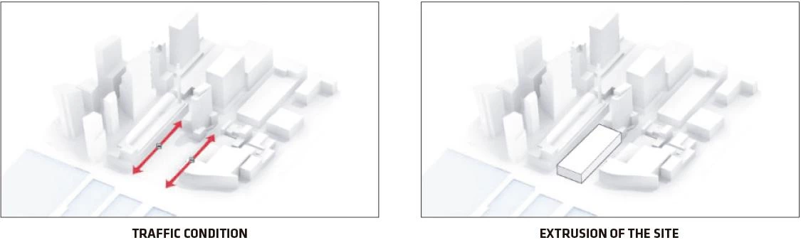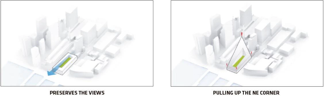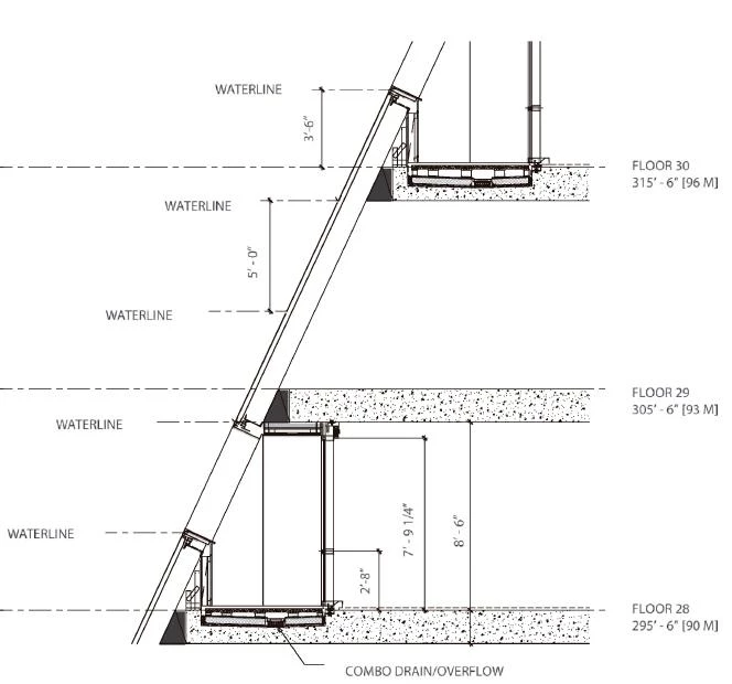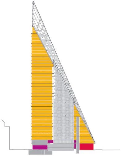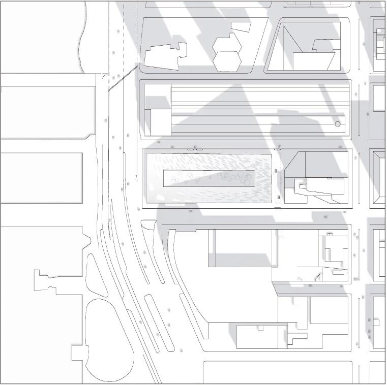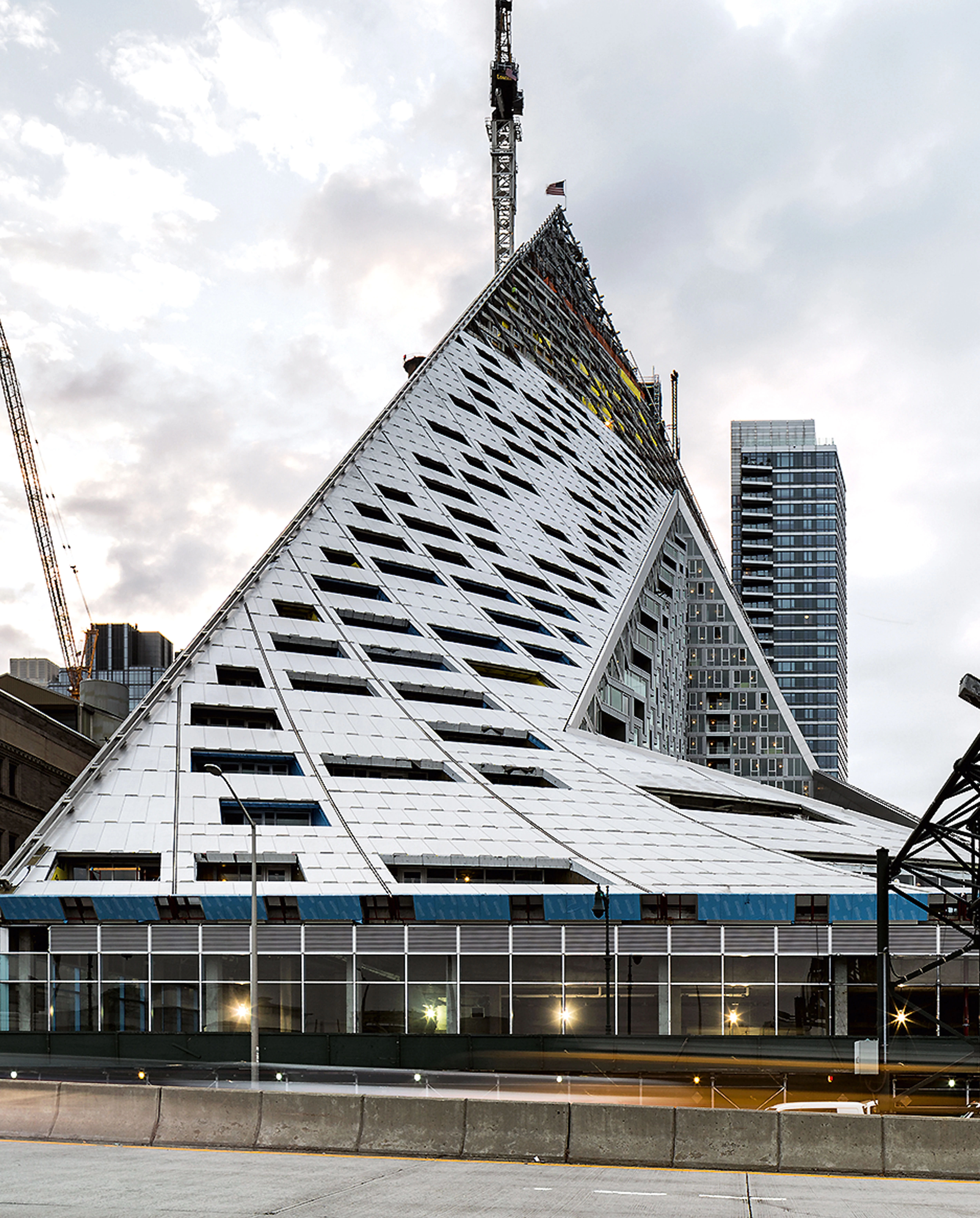 A orillas del río Hudson, el número 625 de la West 57th Street se plantea como un híbrido entre un bloque perimetral europeo y un rascacielos neoyorquino. Gracias a su alzado triangular, el proyecto combina las ventajas de ambos: la compacidad del patio proporciona densidad, intimidad y seguridad, al tiempo que se conservan las amplias vistas y la ligereza propias de una torre. Manteniendo tres de las esquinas del bloque a ras de suelo y elevando la cuarta a una altura de 142 metros, se consigue una potente conexión visual del patio con el río, a la vez que se permite la entrada de luz natural al interior del edificio. La llamativa cubierta en pendiente consiste en una superficie reglada que se perfora con terrazas de distinto tamaño, todas ellas orientadas al Sur. Cada apartamento cuenta con una ventana en voladizo que permite aumentar la entrada de luz natural y conseguir vistas sobre el río. Además, todas las viviendas están provistas de uno o varios balcones que promueven la interacción entre los habitantes del inmueble y los transeúntes.
