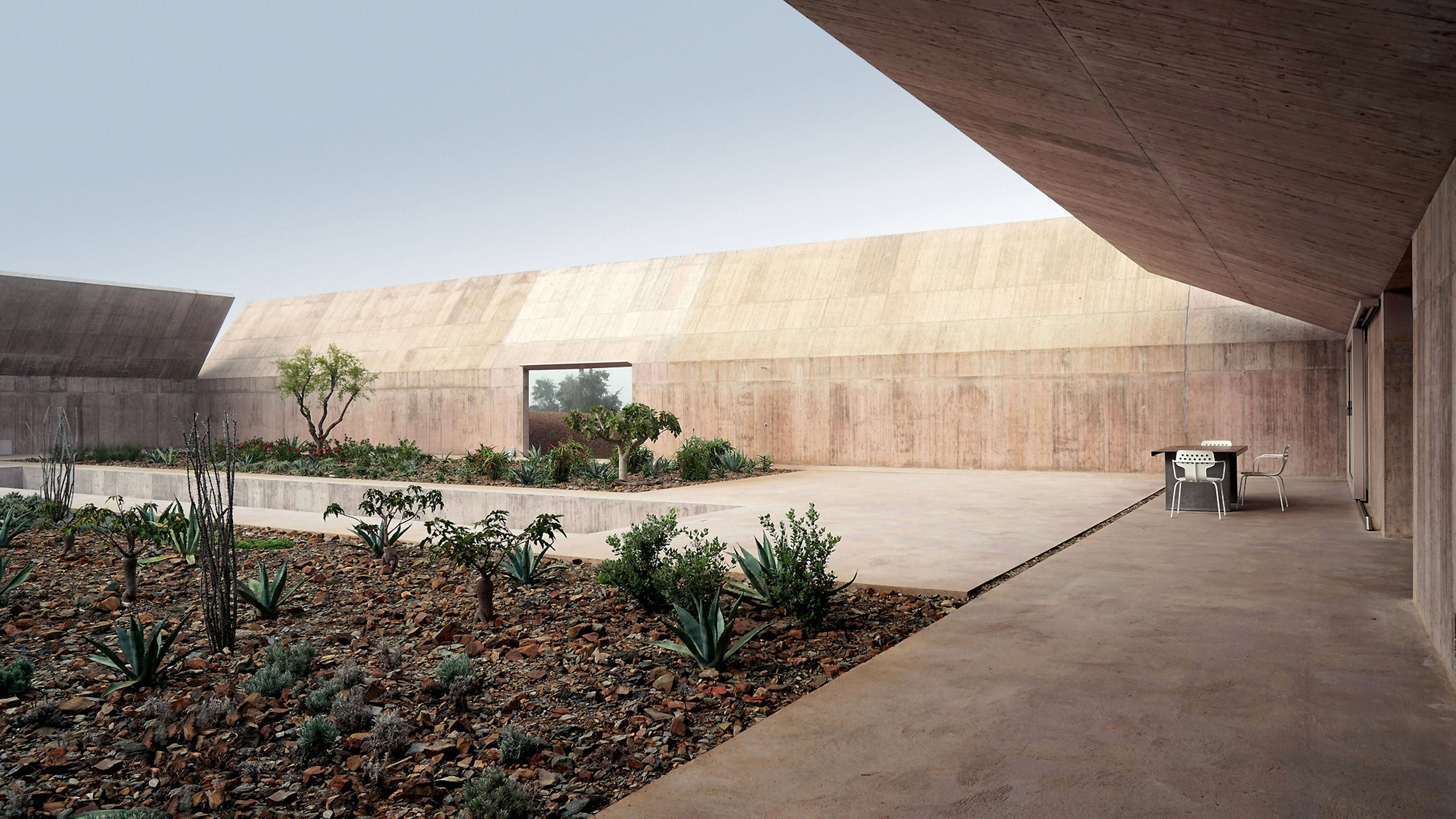 Los cuatro muros de hormigón que rodean la villa Além se ocultan de cualquier mirada ajena entre los alcornoques de un frondoso bosque, en un paraje recóndito de la región portuguesa del Alentejo, a 10 kilómetros de la costa atlántica. El clima de la zona donde se sitúa el edificio, templado y seco, sirve como pretexto para generar este sólido perímetro exterior, que alcanza hasta 5,5 metros de altura y que se pliega para proporcionar sombra y protección frente al viento; al tiempo que cumple la función de albergar un jardín ortogonal interior que regula la temperatura y humedece el aire. En el centro de este gran jardín, una lámina de agua longitudinal marca la dirección del eje de simetría del conjunto. La vivienda se construye, al igual que los muros exteriores, utilizando hormigón in situ de tono rojizo; y se emplaza, como un elemento secundario, en uno de los cuatro frentes de la parcela, al borde del extremo sur de la piscina. En el austero interior, tras una pared curva que separa el salón del resto de los espacios, se esconden las estancias que, como los dormitorios, tienen un carácter más privado.