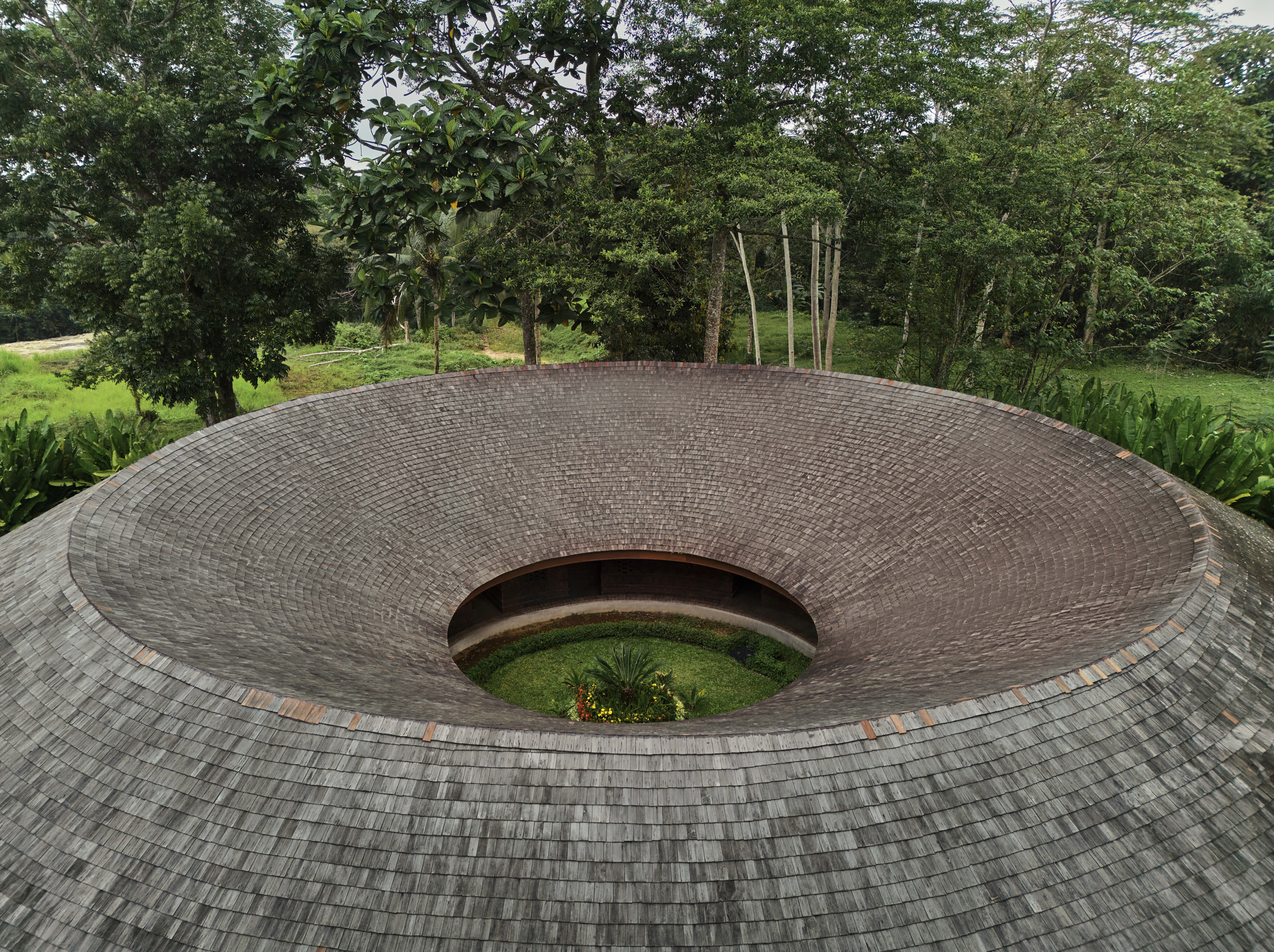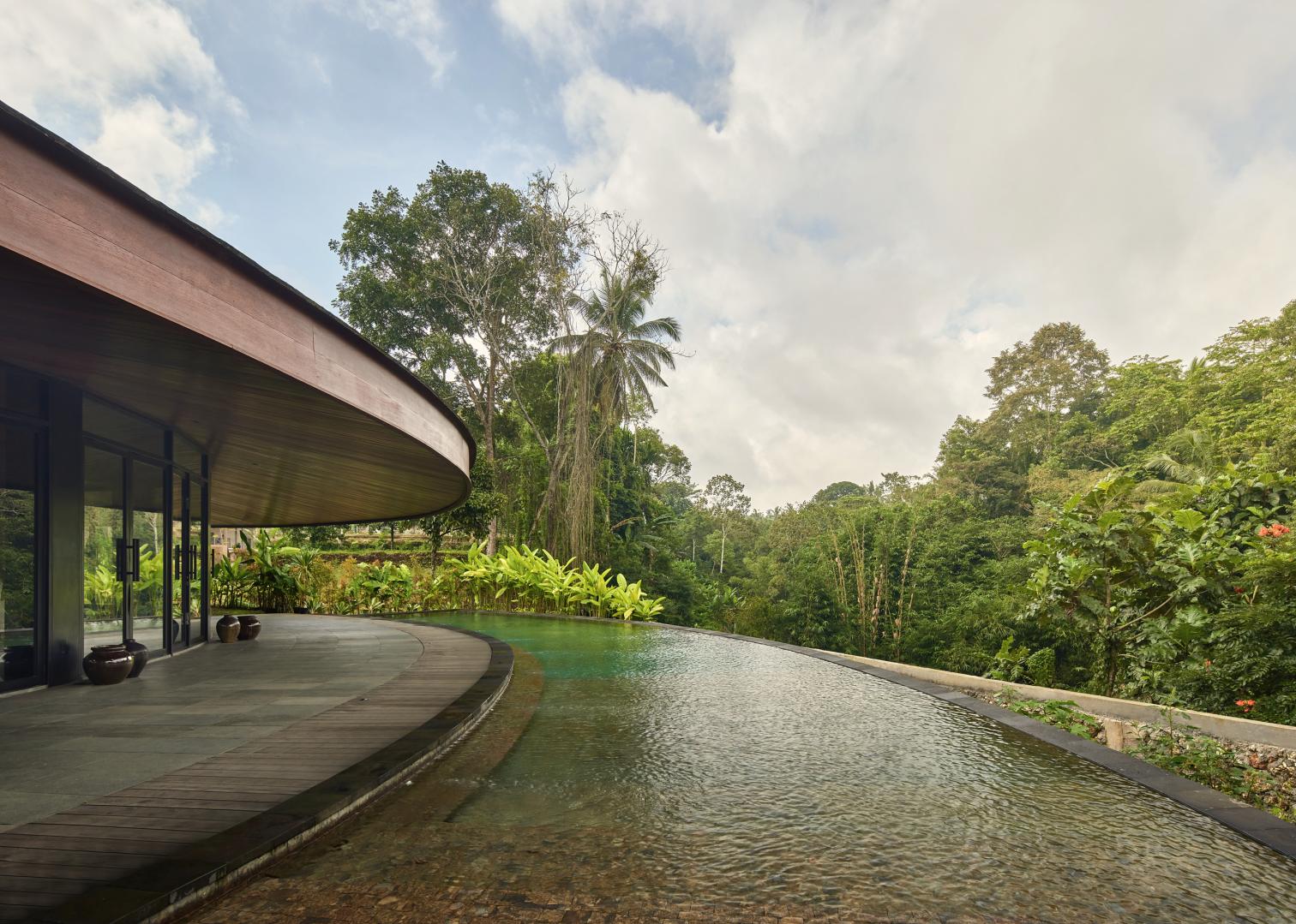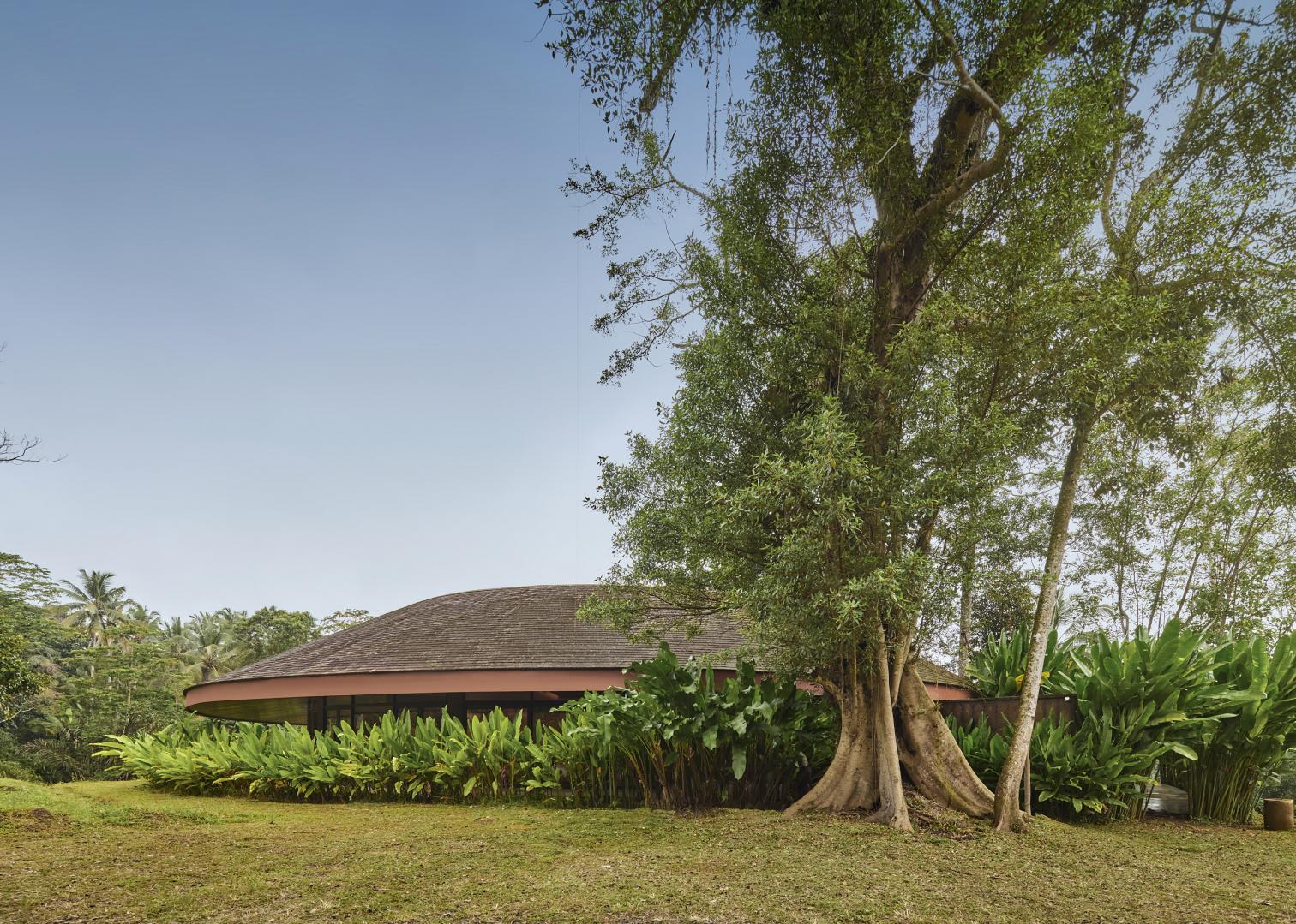 Con una superficie de 475 metros cuadrados, Villa Omah Prana está concebida como un refugio circular integrado en el paisaje. Su cubierta inclinada y continua unifica los volúmenes, mientras que el vacío central con vegetación permite la entrada de luz y la ventilación natural. A lo largo del arco exterior, una piscina en forma de medialuna acompaña la geometría circular de la construcción, completando la experiencia que proporciona esta singular casa.