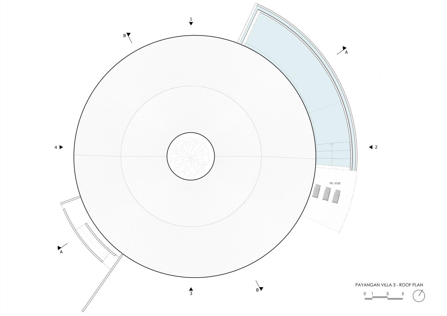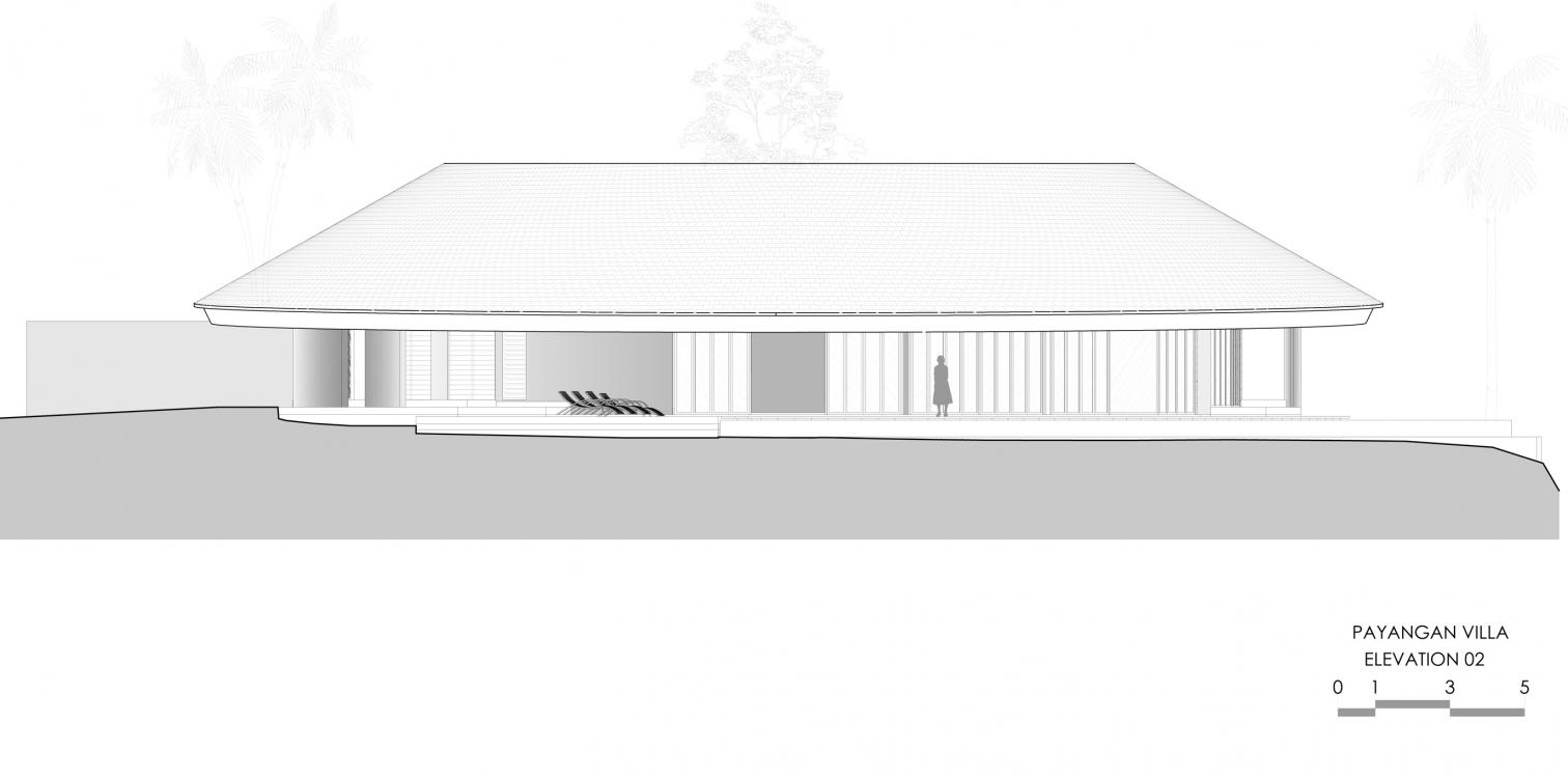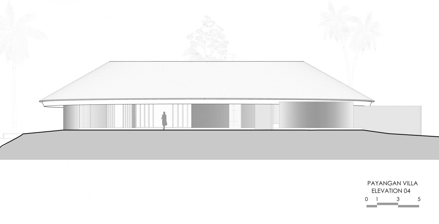 Con una superficie de 475 metros cuadrados, Villa Omah Prana está concebida como un refugio circular integrado en el paisaje. Su cubierta inclinada y continua unifica los volúmenes, mientras que el vacío central con vegetación permite la entrada de luz y la ventilación natural. A lo largo del arco exterior, una piscina en forma de medialuna acompaña la geometría circular de la construcción, completando la experiencia que proporciona esta singular casa.