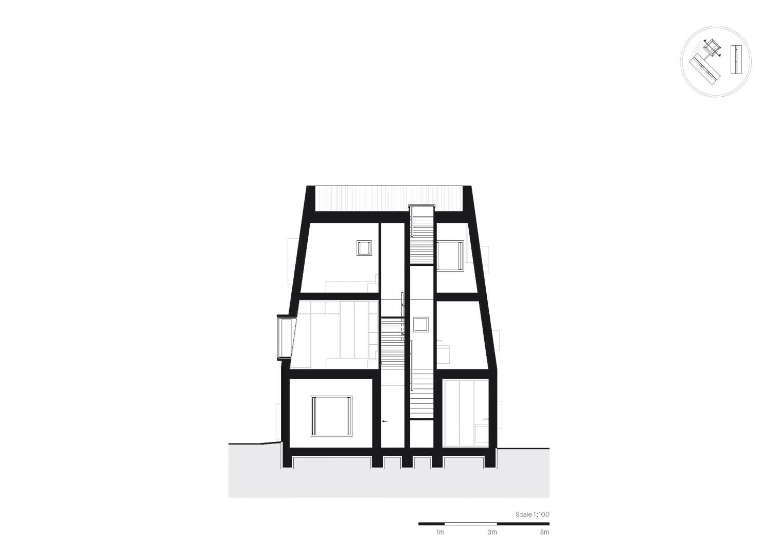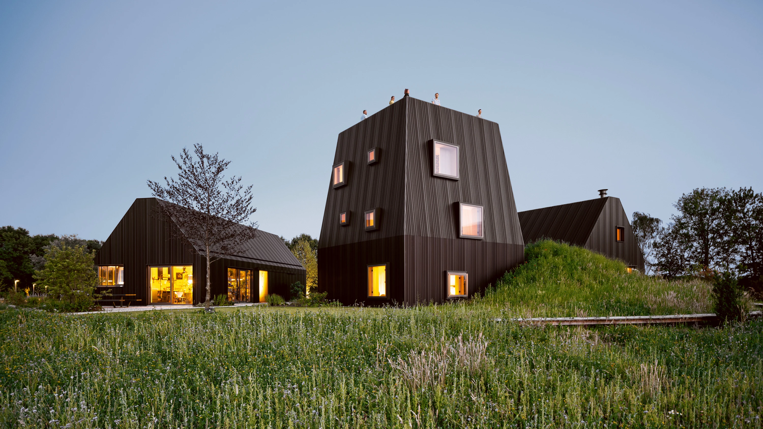 La inspiración en los tipos tradicionales explica también tanto el carácter facetado de la casa —que alude a la cubierta a dos aguas al mismo tiempo que crea riqueza volumétrica— como los materiales empleados: bronce y aluminio que recubren la envoltura y cuya textura acanalada —expresión del sistema constructivo— alude al corrugado de los tejados de chapa de las granjas de la zona.