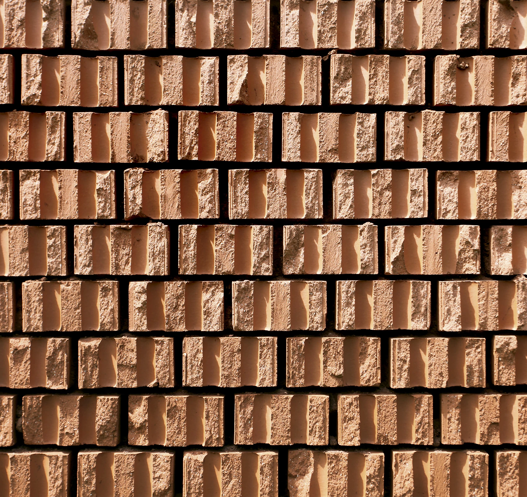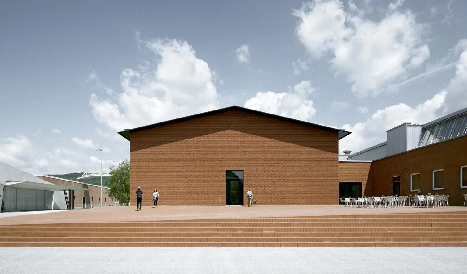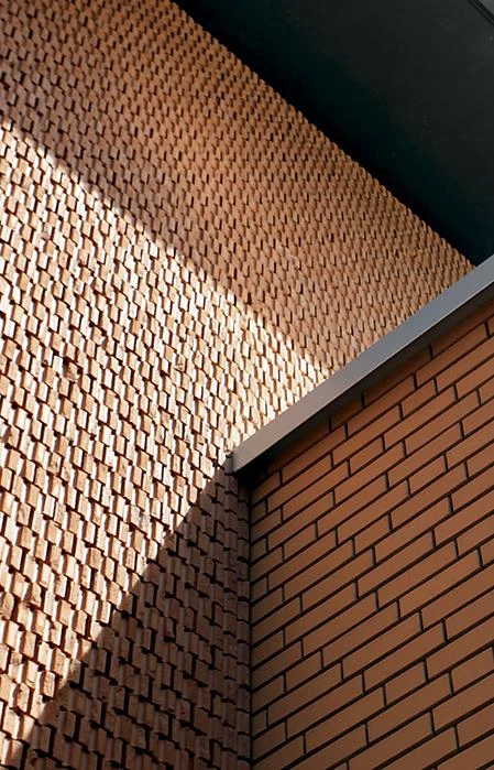 El nuevo volumen adopta la forma de la casa arquetípica y continúa la materialidad de la nave adyacente mediante una envolvente de ladrillos partidos a mano. El carácter artesanal de este proceso hace que cada una de estas piezas cerámicas tenga una forma única, lo que da lugar a una imagen vibrante. Las juntas de mortero —que se retranquean 2,5 centímetros— enfatizan la individualidad de cada ladrillo y aportan profundidad a la textura de la fachada. Esta atención al detalle hace que el edificio se perciba de forma diferente según la distancia: mientras que desde lejos puede parecer una construcción convencional, desde cerca se aprecia la delicadeza de los acabados, en consonancia con la calidad de los diseños que se exponen dentro.