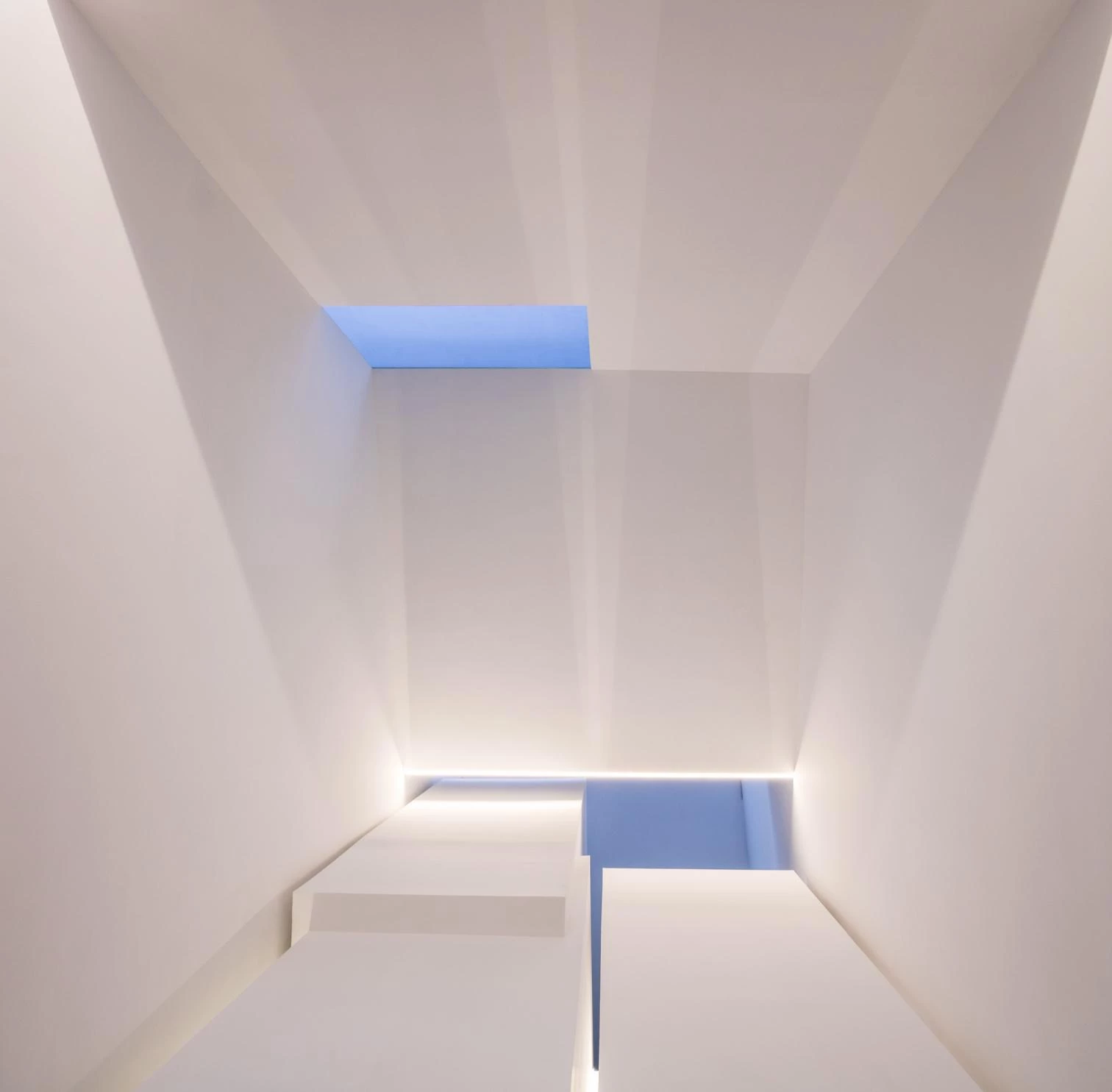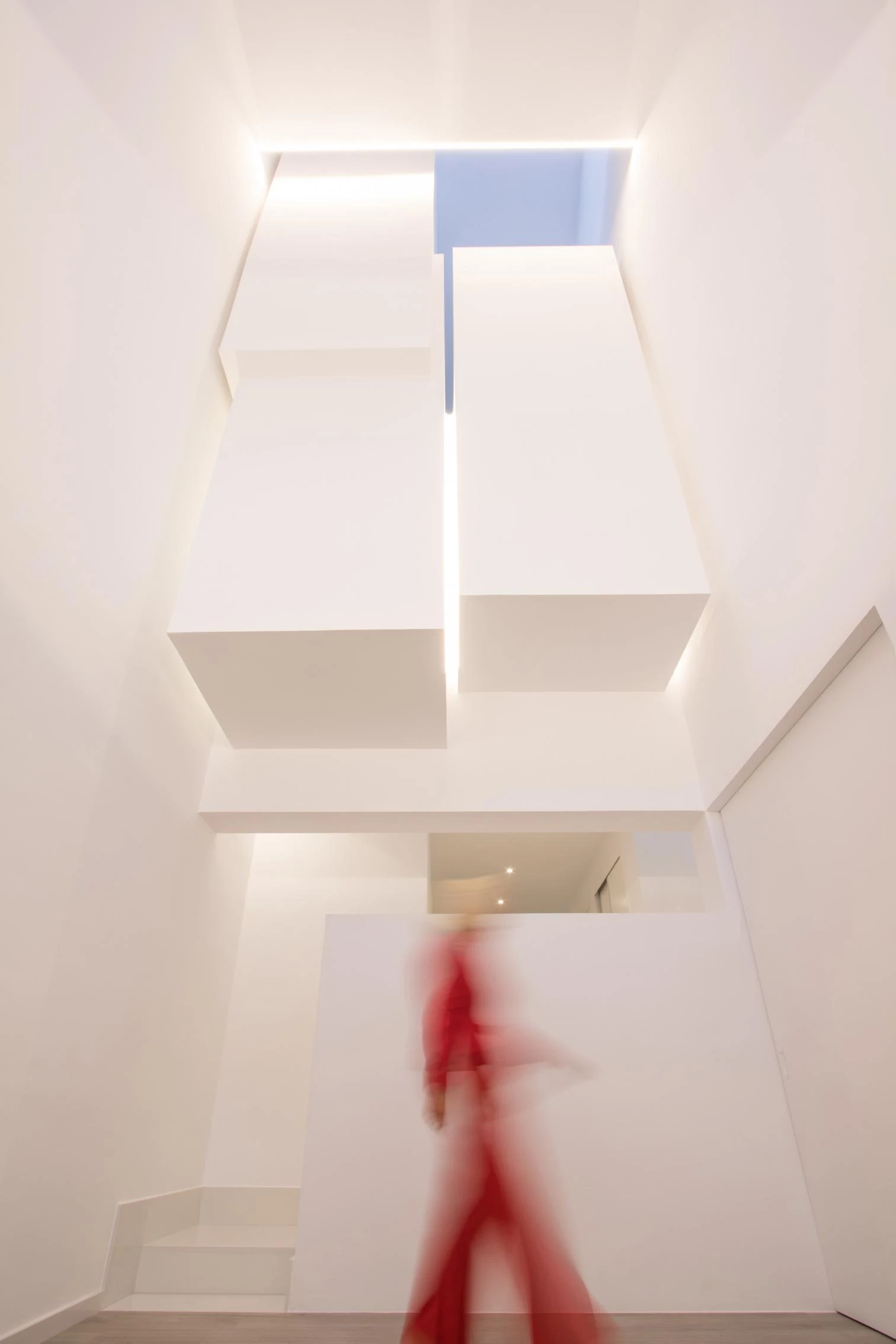 El frente principal mira hacia una estrecha calle con austeridad y aperturas controladas tras el análisis del soleamiento. En referencia al zaguán de la arquitectura doméstica andalusí, la entrada de triple altura ofrece un espacio versátil sobre el que se colocan tres volúmenes en voladizo que albergan el lavadero, la escalera y el aseo.